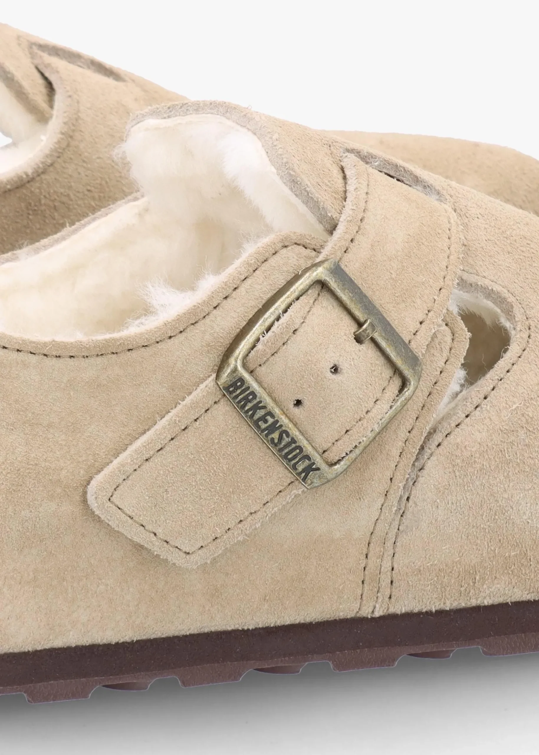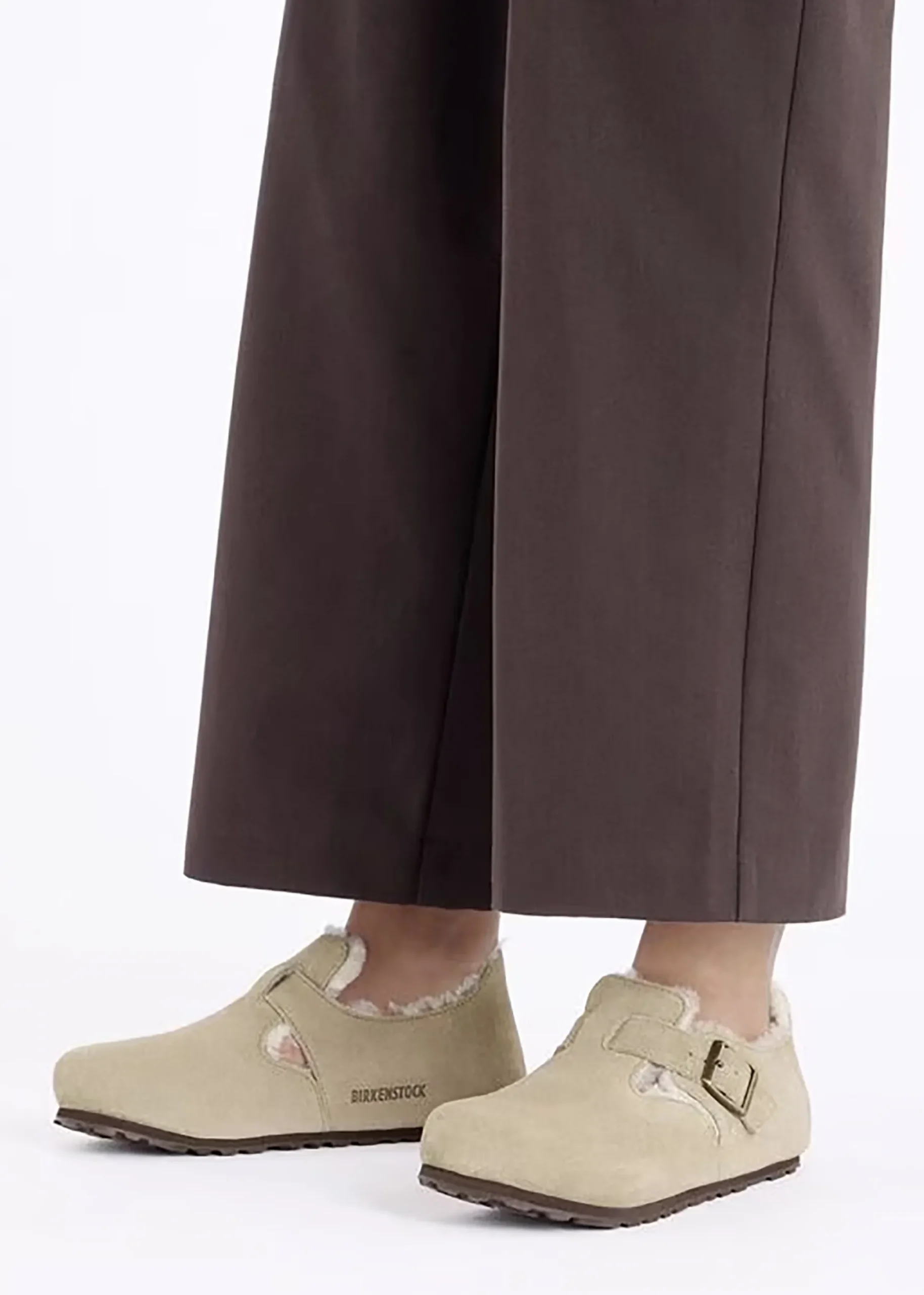The women’s ‘London Shearling’ clog style shoes from Birkenstock are a veritable style that can easily be worn all year round, it’s a variation on the brand’s classic ‘Boston’ clog. This cosy version is crafted from a premium soft suede upper with shearling and an EVA sole. An easy to wear slip on style featuring adjustable logo adorned buckle fastening straps. Signature Birkenstock branding is seen throughout.