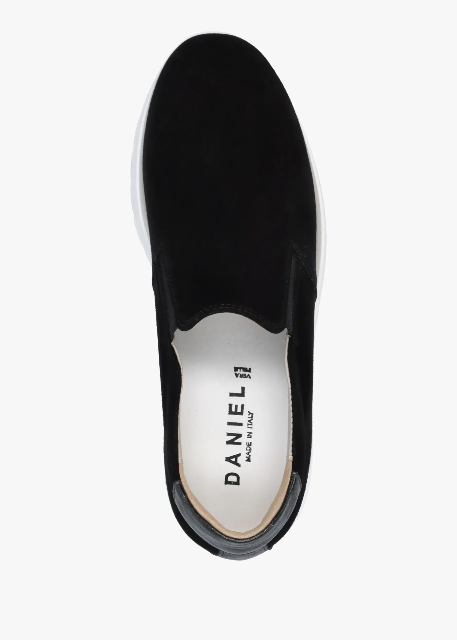 New to Daniel this Season the ‘Commy’ wedge shoes. This casual sporty style is crafted from a premium suede upper with luxurious leather lining, cushioned footbed and a chunky rubber sole. An easy to wear slip on style featuring elasticated gussets. The round toe and flatform wedge make up the silhouette. Contrasting leather trim adds detail to the ankle. Signature Daniel branding is seen to the footbed.