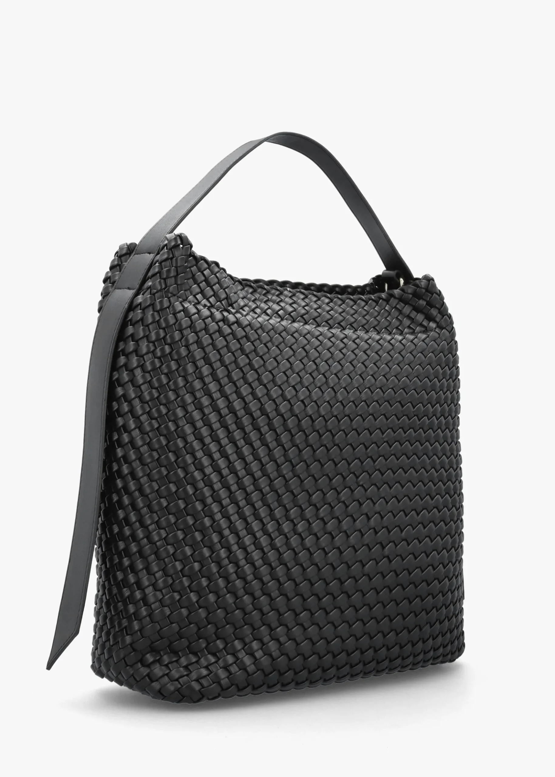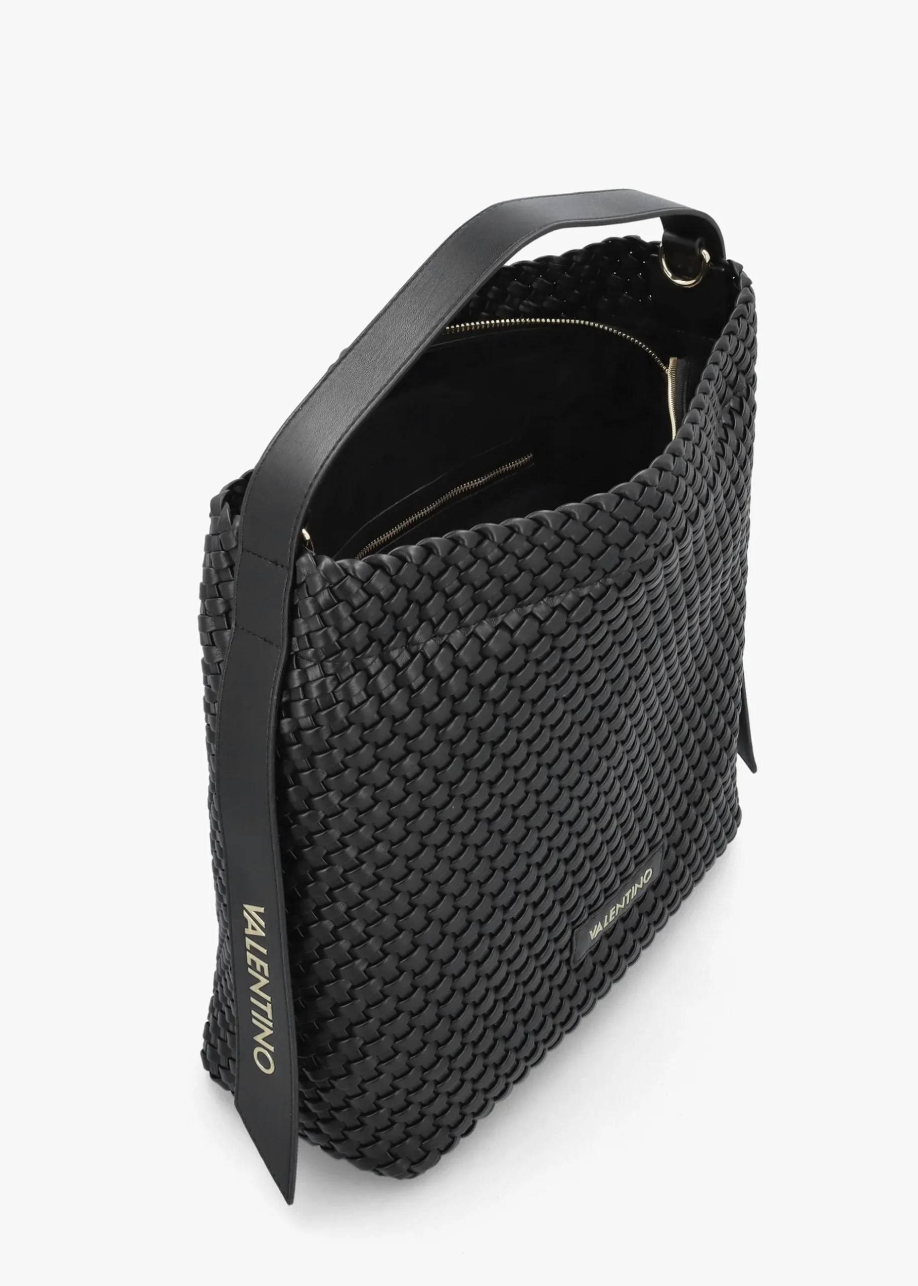 The ‘Shantel’ hobo bag is a new silhouette from Valentino this Season. This everyday carryall style is crafted from premium soft PU in a woven design with polished gold tone accents. The secure top zip fastening reveals the large single main compartment with handy inner zip and slot pockets. Carry by the shoulder strap or the detachable cross-body strap. Signature Valentino branding is seen throughout.