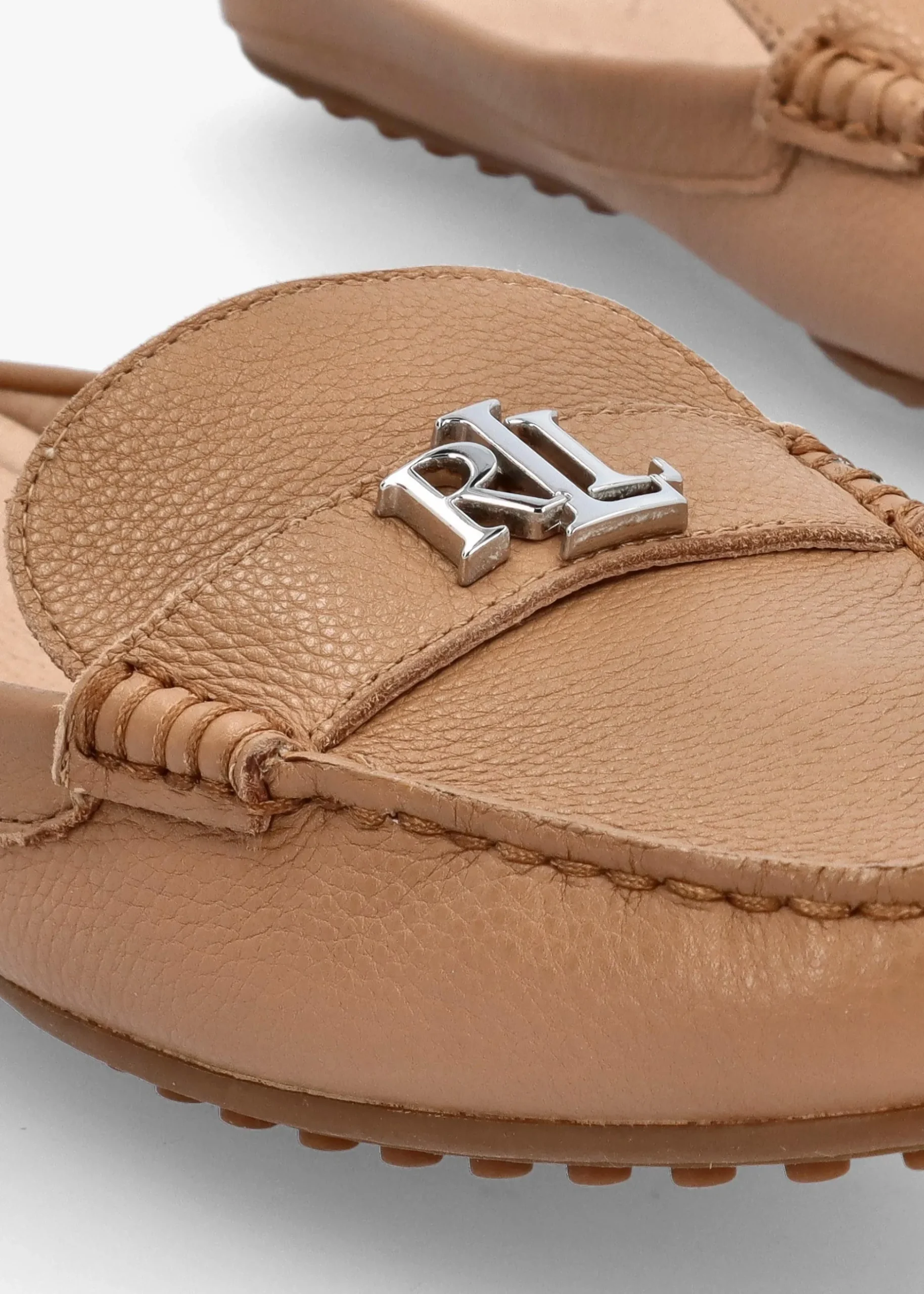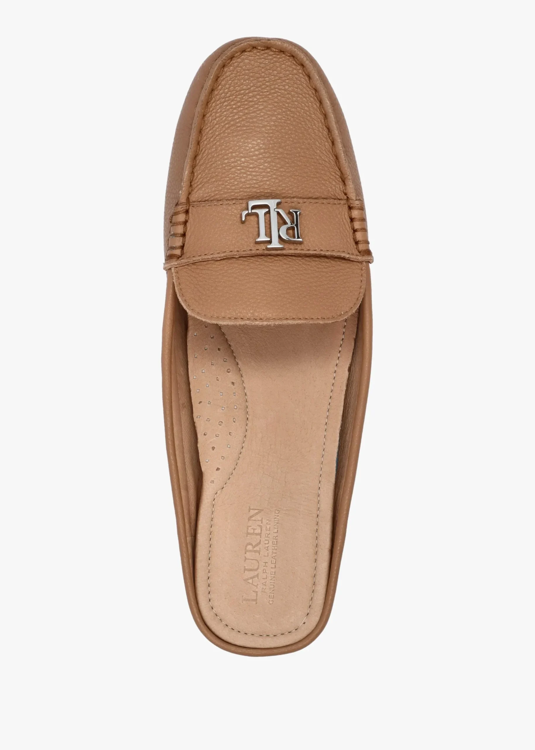 This New Season style from Lauren Ralph Lauren is a move on from the brands classic ‘Barnsbury Driver’ silhouette. A reimaged backless style crafted from premium pebbled leather with luxurious leather lining and an exclusive rubber nub sole. An easy to wear slip on style. Iconic ‘LRL’ logo hardware creates the finished touch to these simple yet chic flats. Signature Lauren Ralph Lauren branding is seen to the footbed and sole.