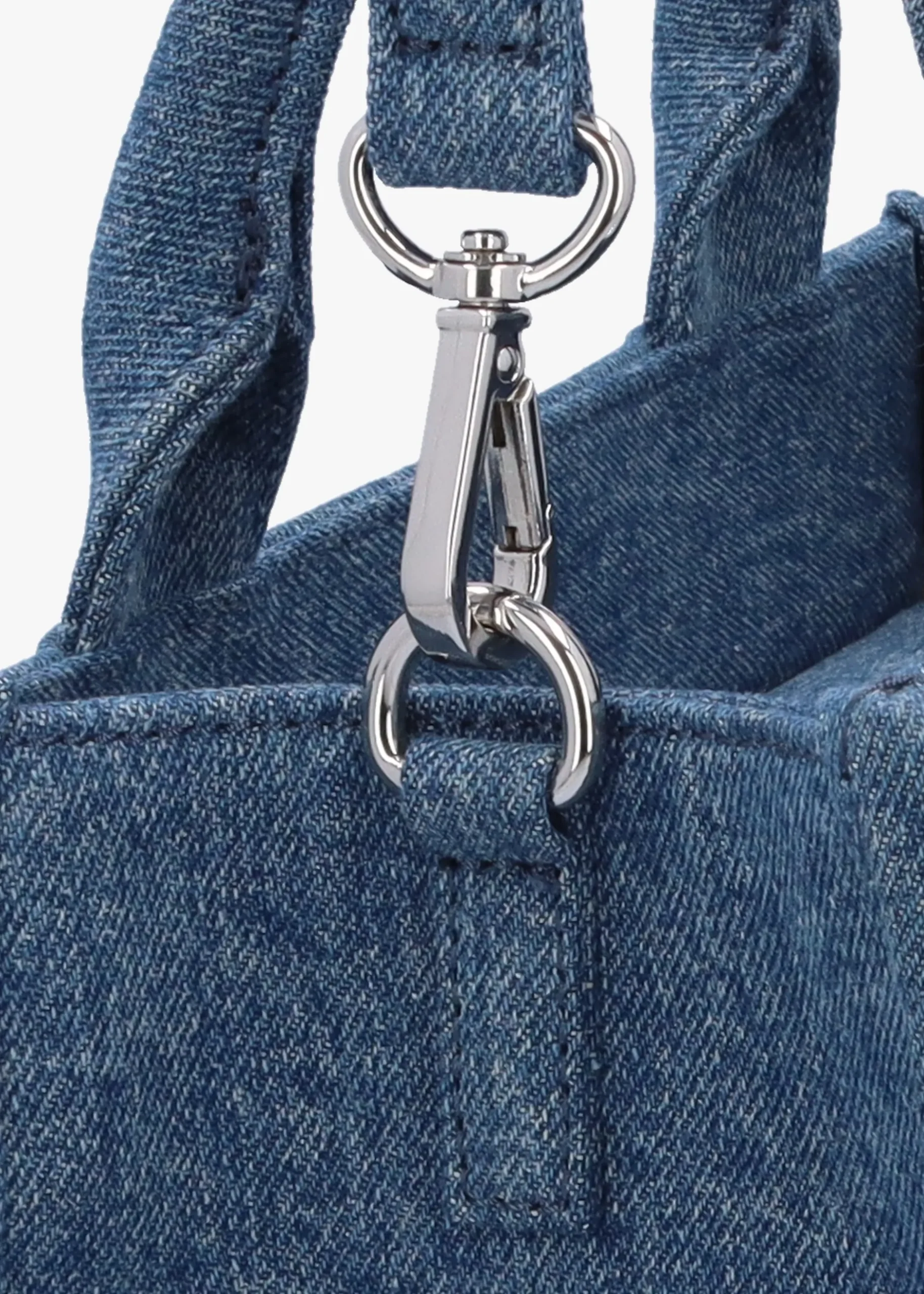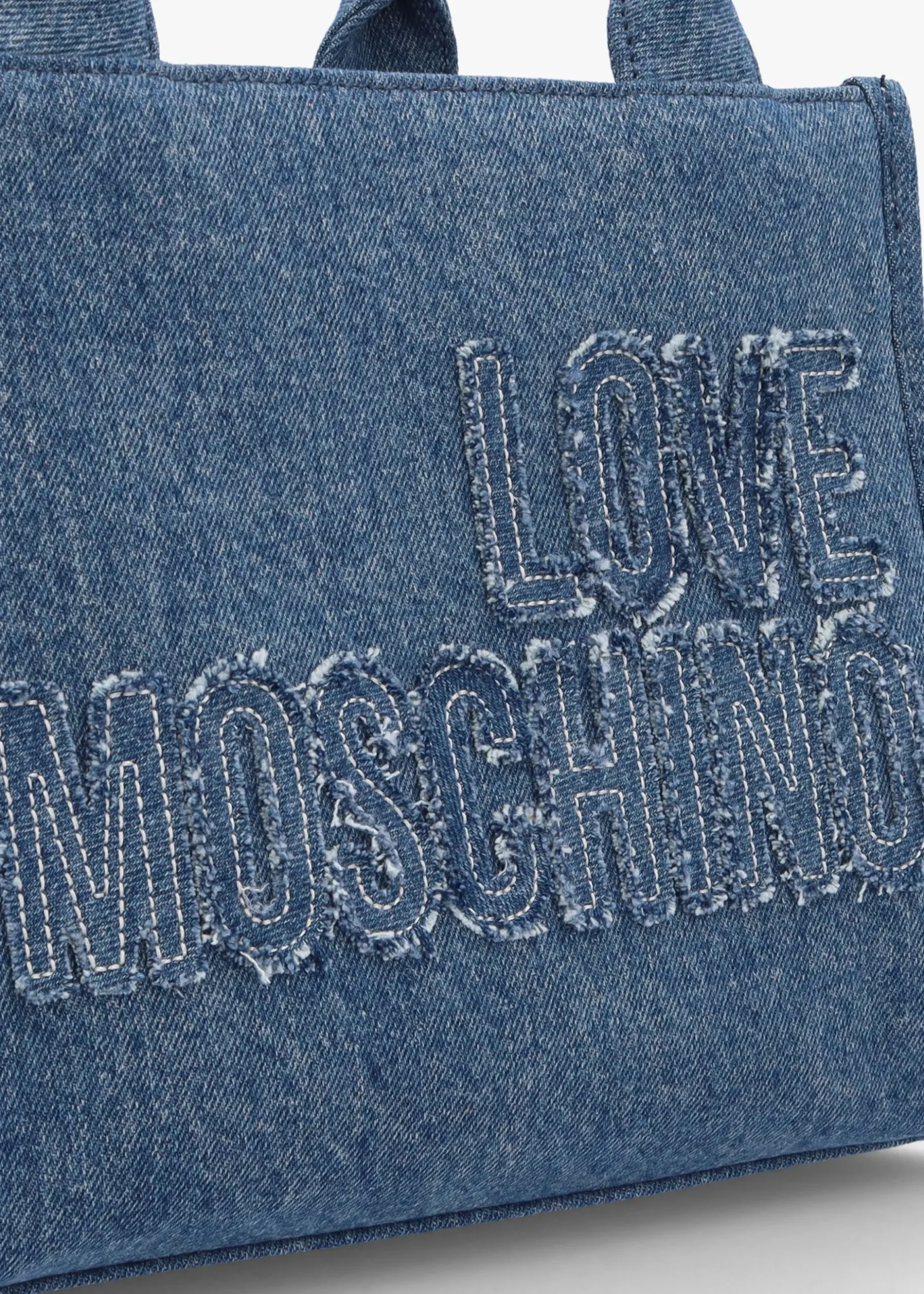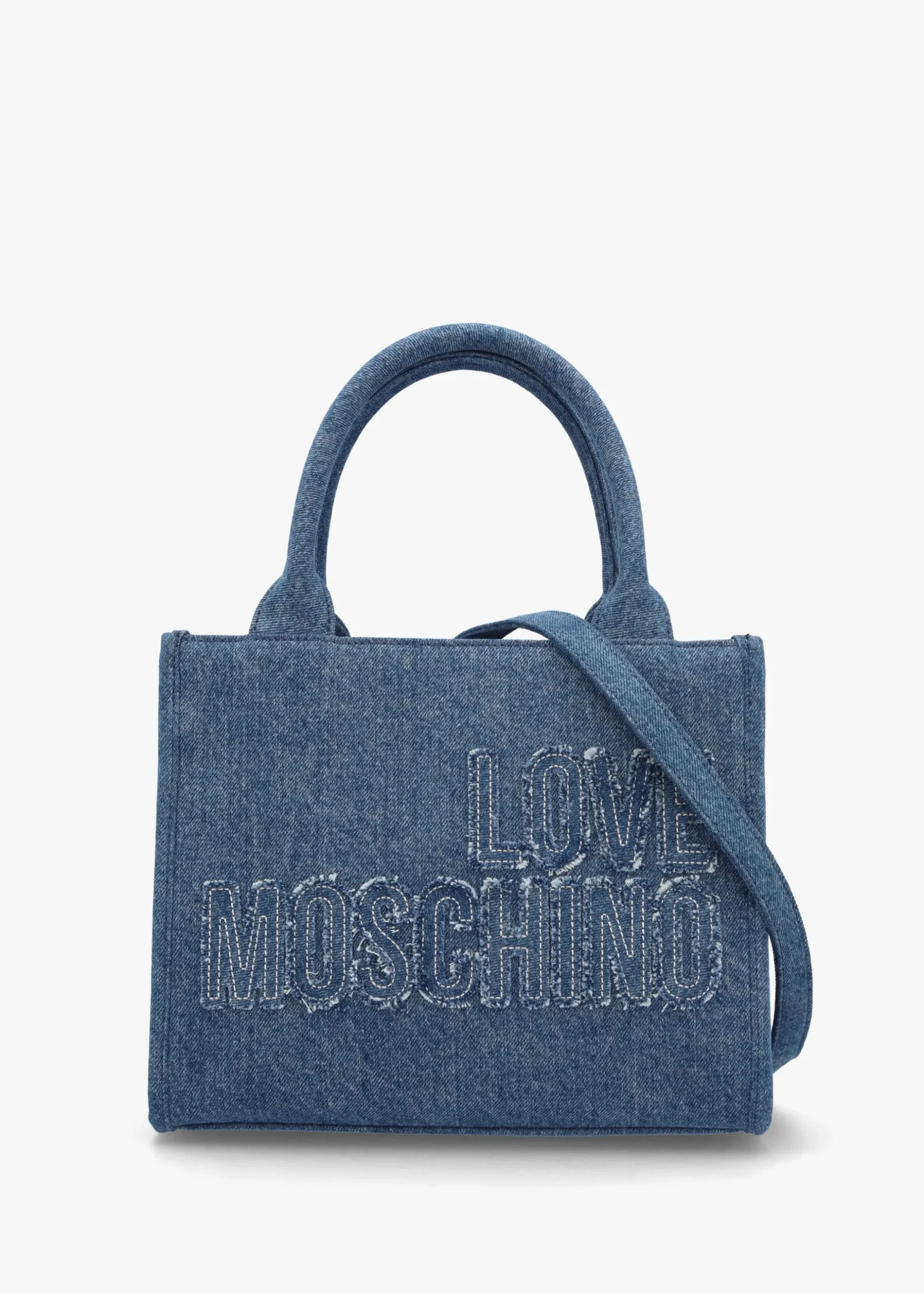 New from Love Moschino this Season the ‘Denim’ tote bag. This Summer style is crafted from premium textile style denim with polished silver tone accents. The secure top zip fastening reveals the single main compartment as well as handy inner zipper pocket. Carry by the top handles or the detachable strap. Appliquéd logo lettering adds detail. Signature Love Moschino branding is seen throughout.