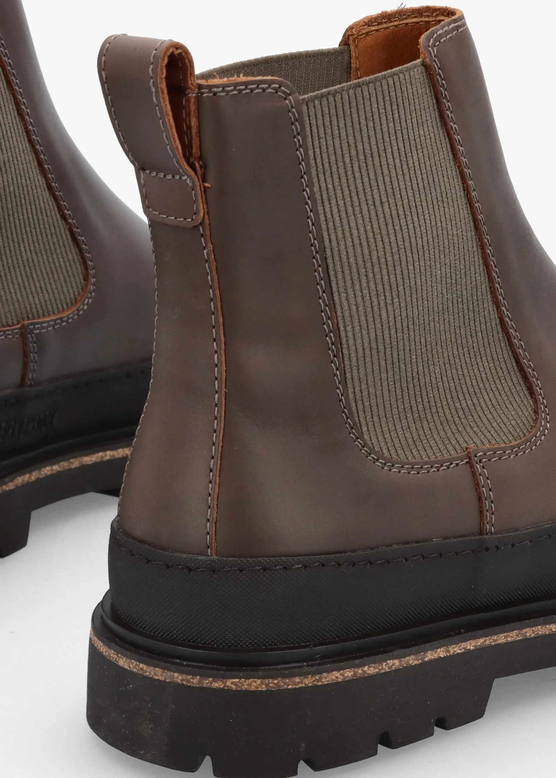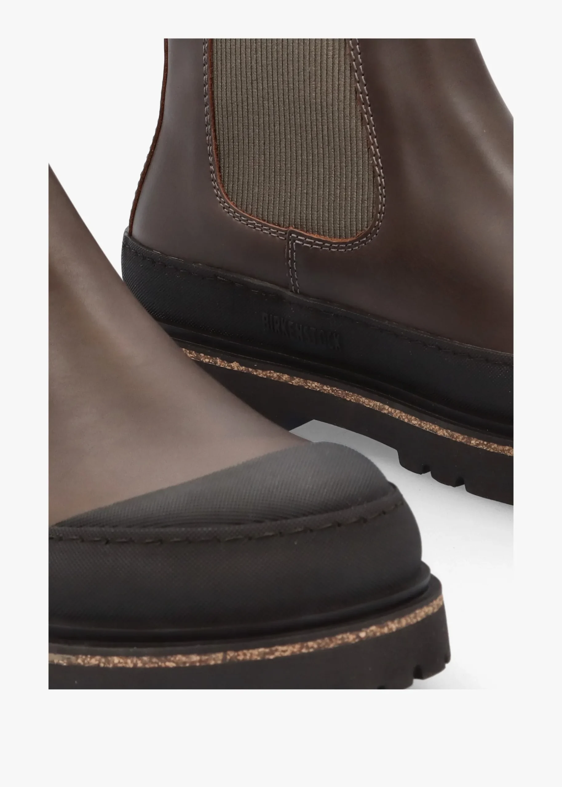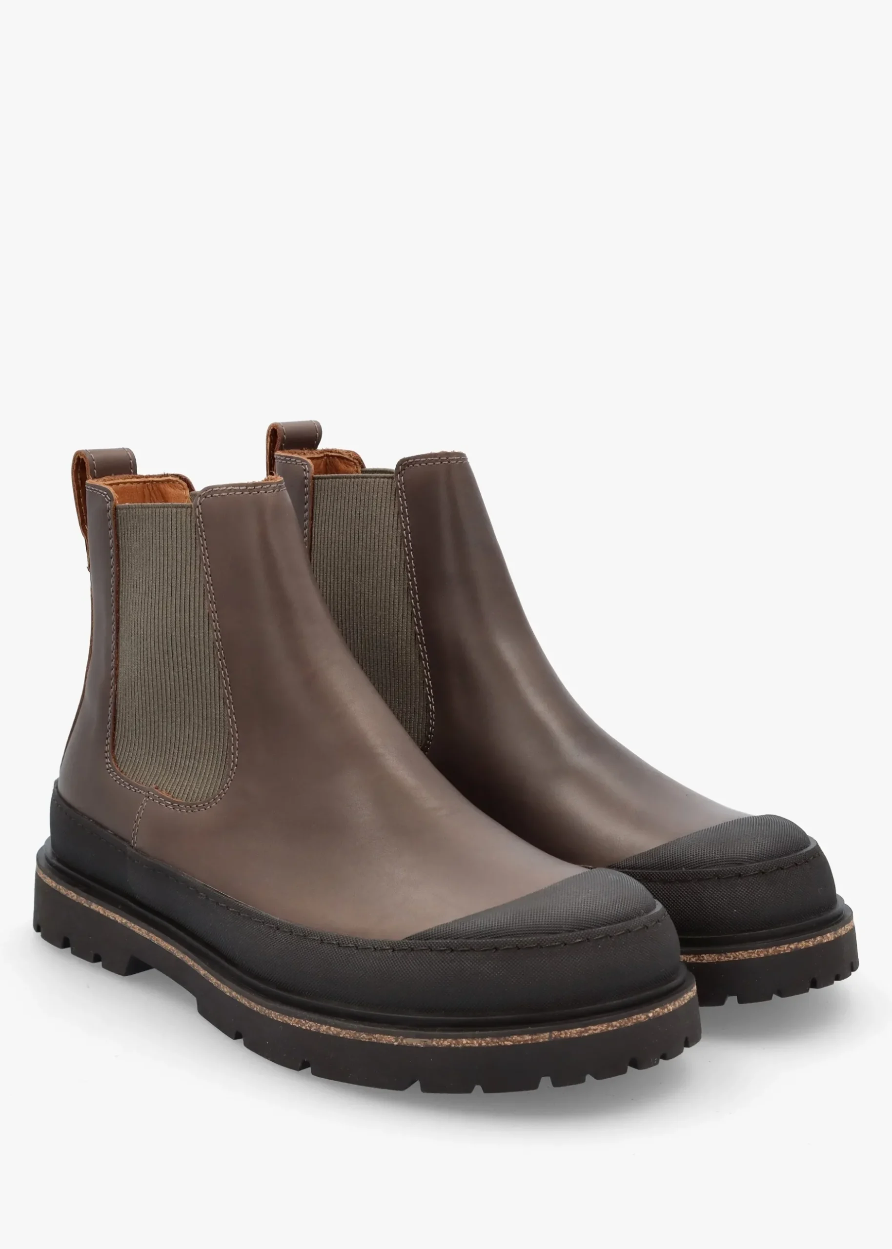 New from Birkenstock this Winter Season the men’s ‘Prescott’ Chelsea boots. This smart casual style is crafted from a premium waxy leather upper with microfiber lining and a natural rubber sole featuring Birkenstocks instantly recognizable cork element. The addition of the mudguard trim provides extra protection from the elements. An easy to wear style featuring elasticated gussets and pull tab to the back of the ankle. Signature Birkenstock branding is seen throughout.