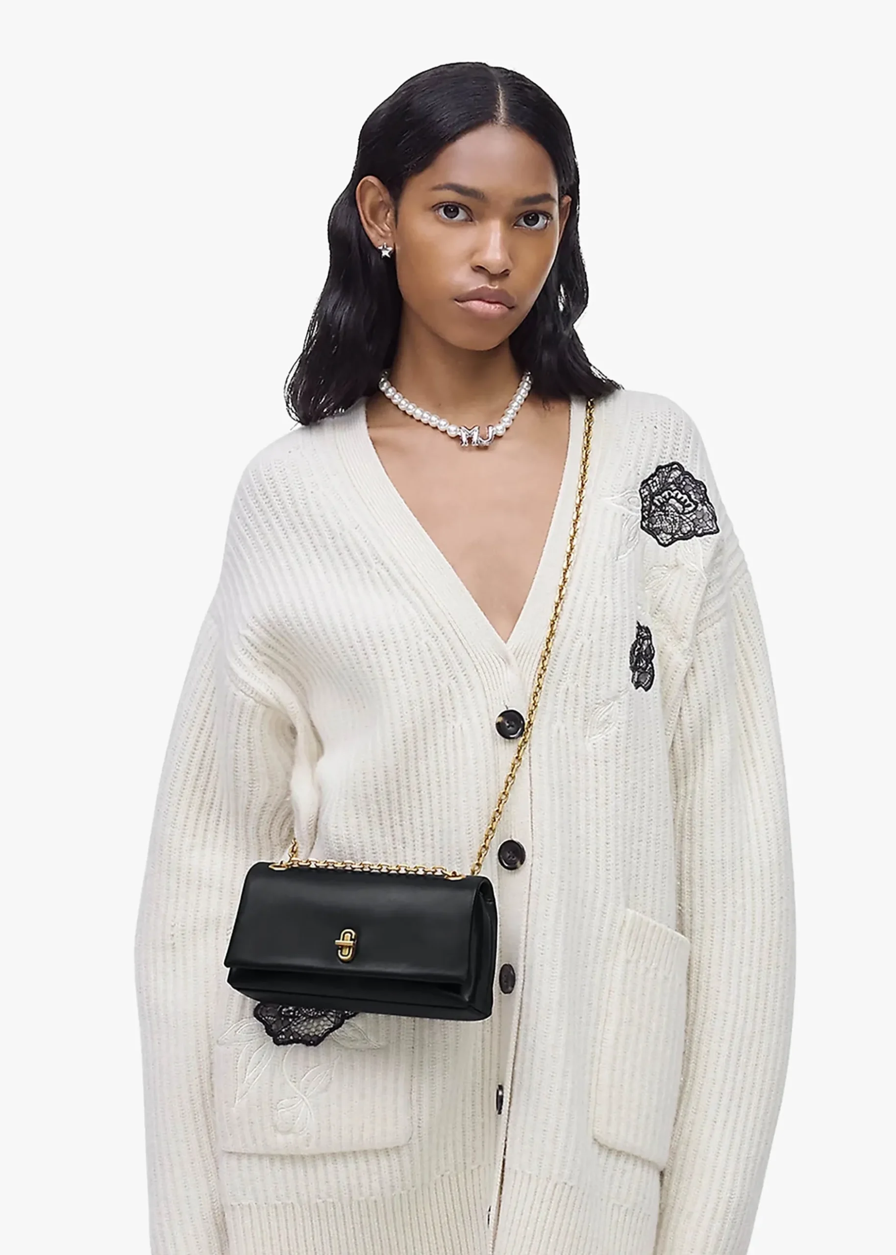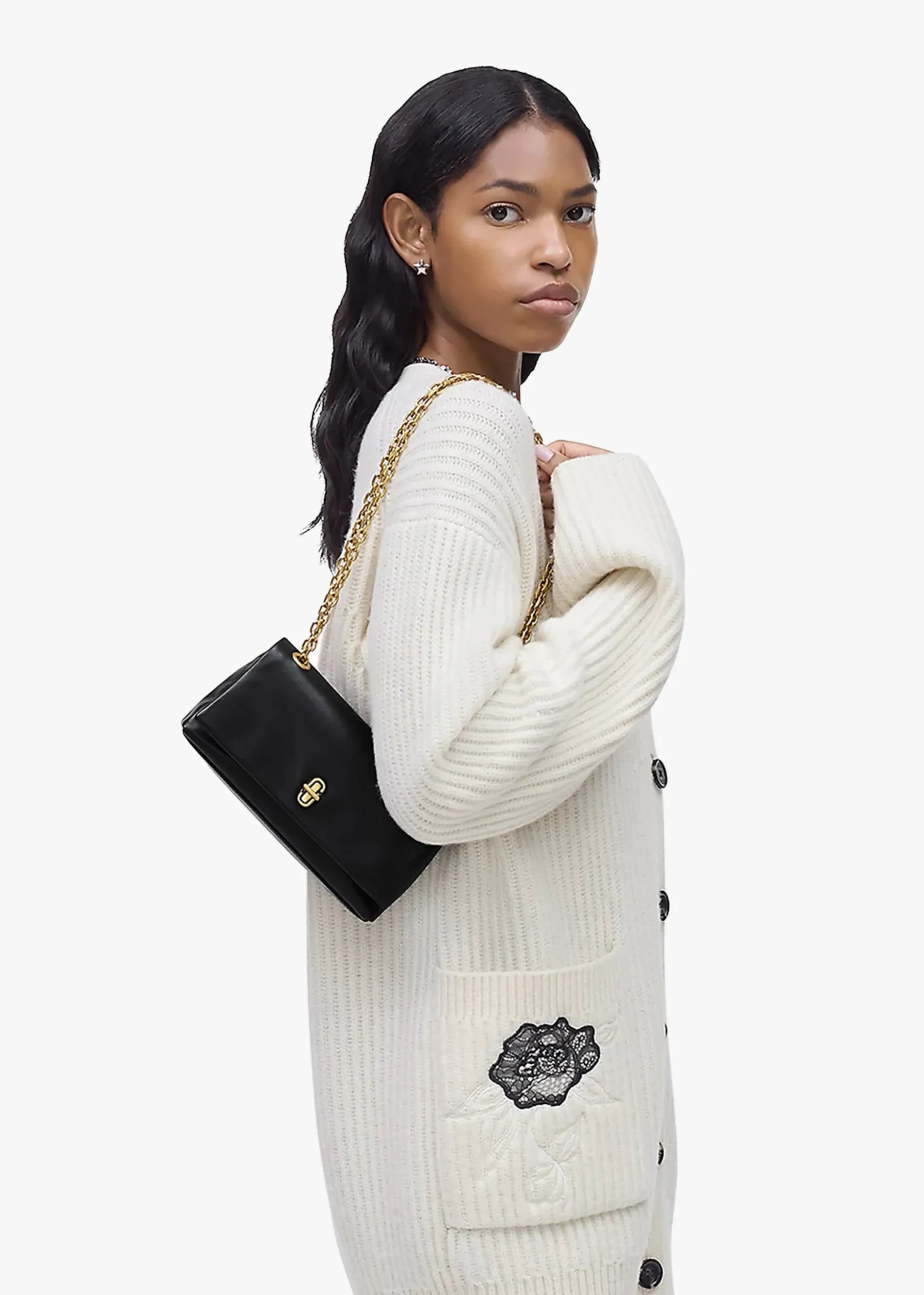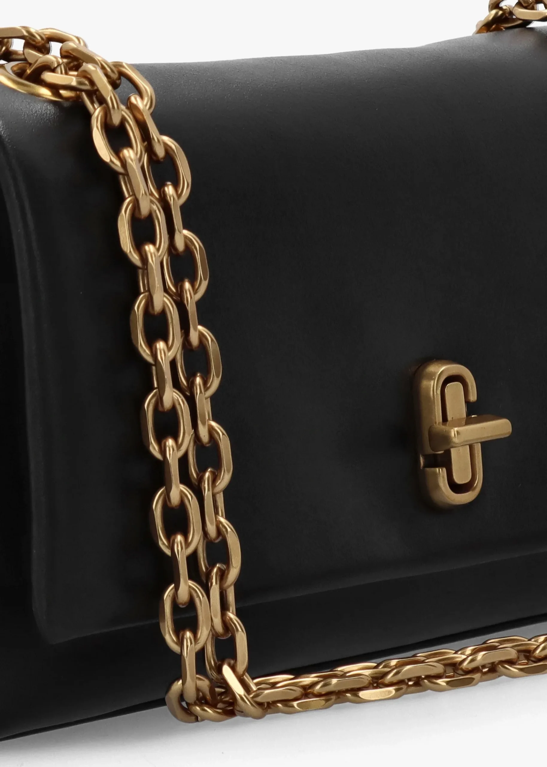 Add ‘The Dual Chain’ wallet from Marc Jacobs to your accessories collection. This versatile style is crafted from premium smooth leather with polished gold tone accents. The secure turnlock front fastening reveals the main compartment featuring handy inner zip and card slot pockets. Carry by the pull through chain strap on the shoulder or across the body. Classic double ‘J’ logo adds detail. Signature Marc Jacobs branding is seen throughout.