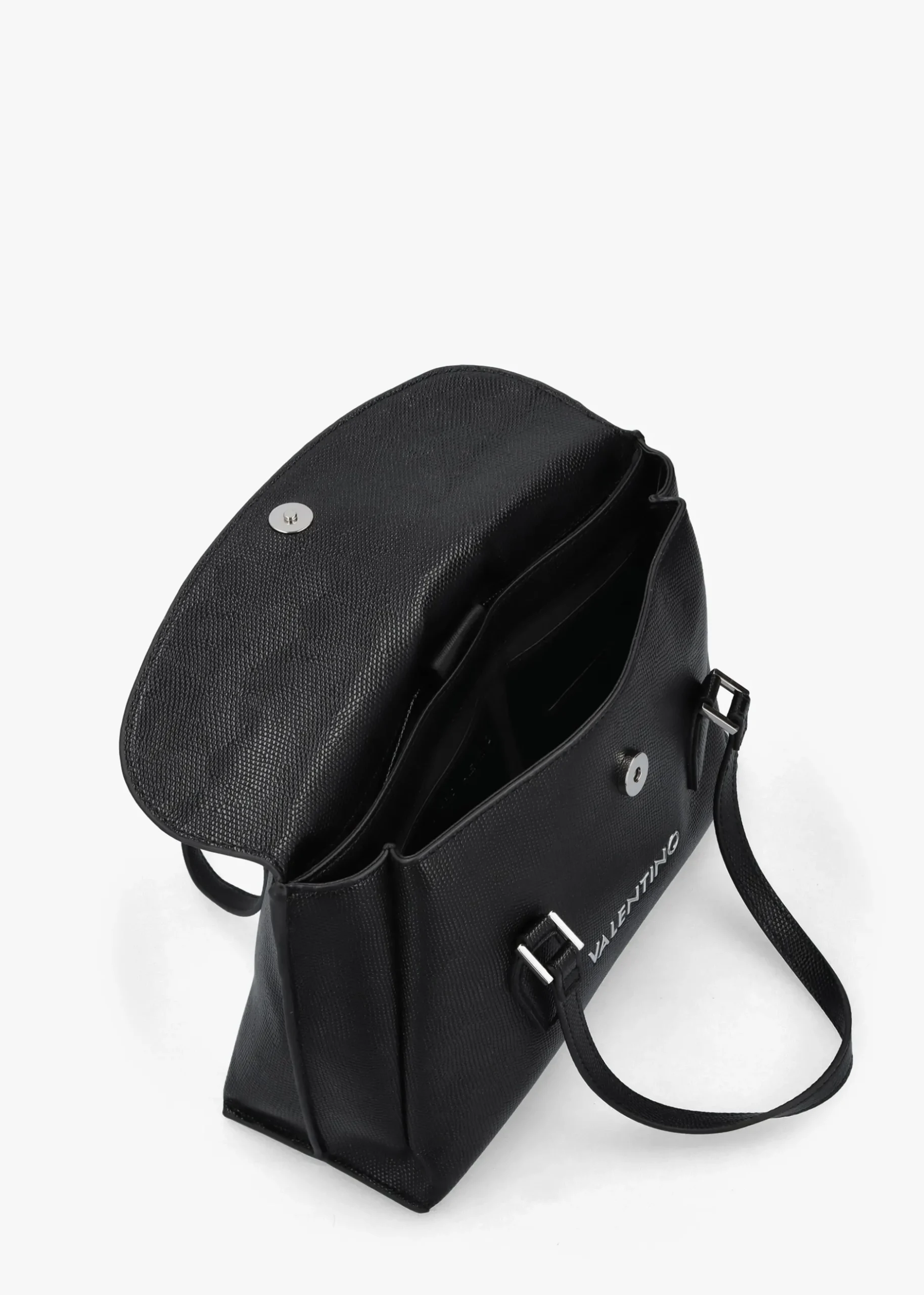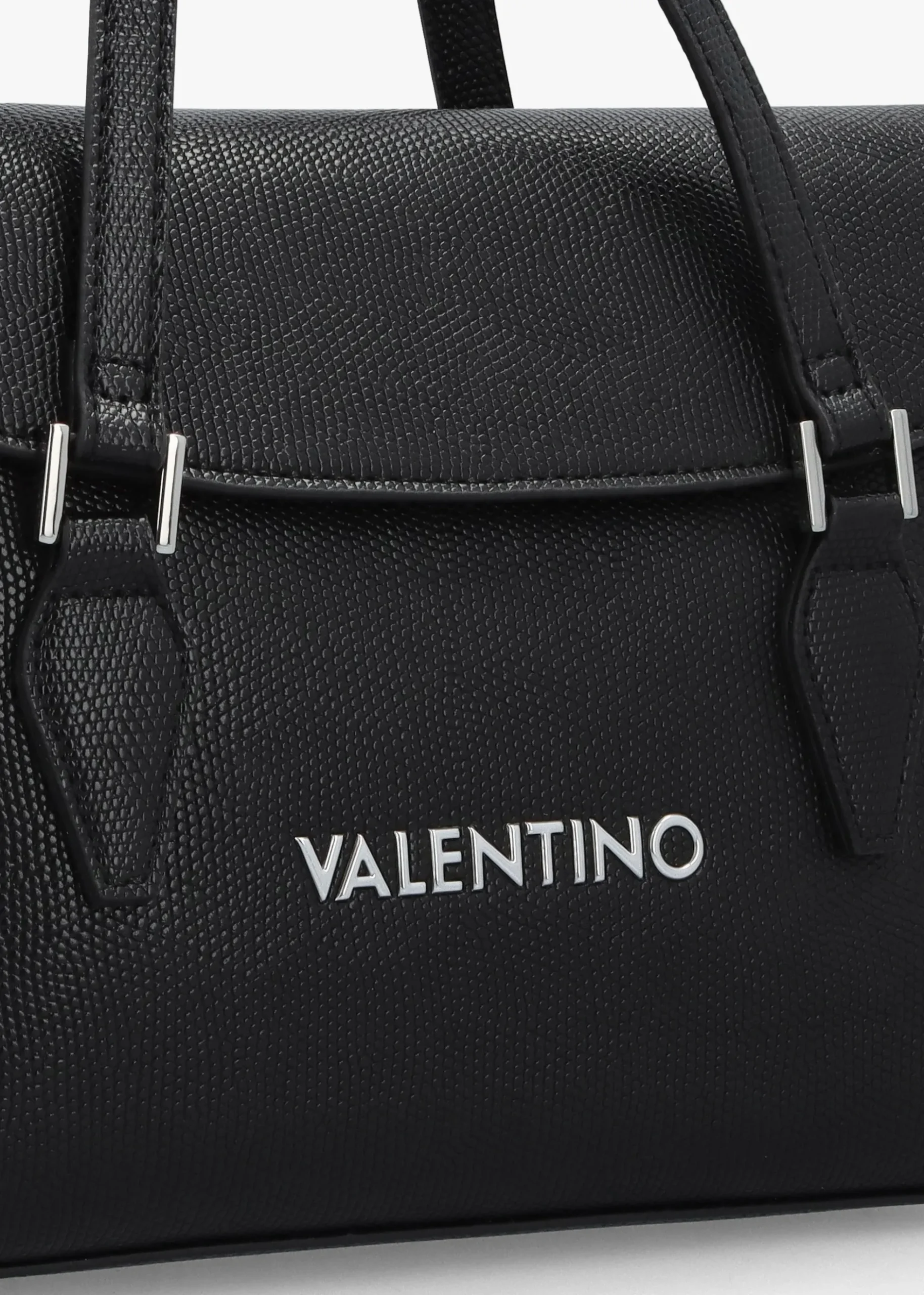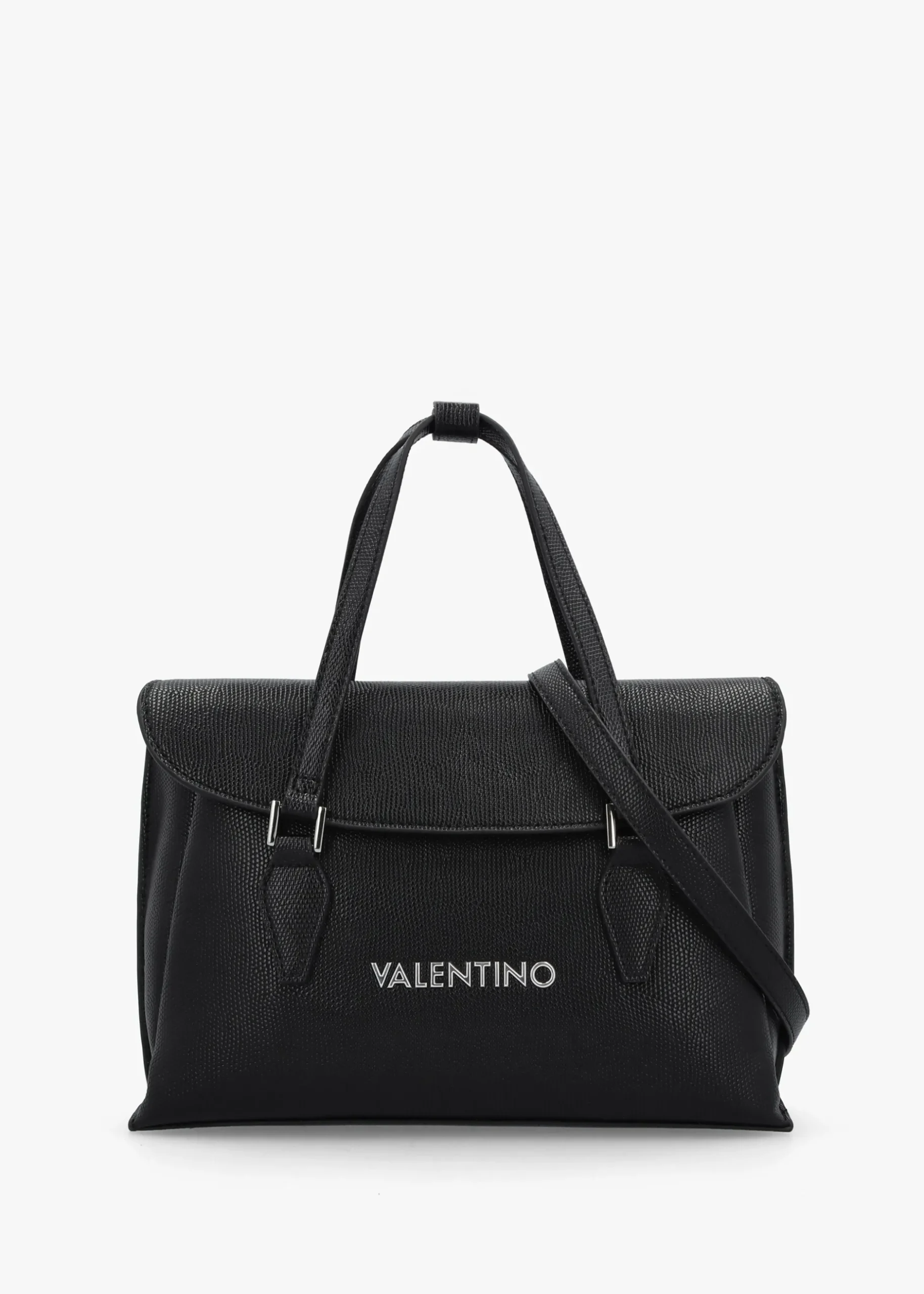 The ‘Whom’ satchel bag from Valentino is the perfect carry all everyday style. Crafted from a premium textured PU made from part recycled materials with polished silver tone accents. The secure magnetic front flap reveals multiple compartments, exterior slot pocket also features. Carry by the grab handles or the detachable strap. Signature Valentino branding is seen throughout.