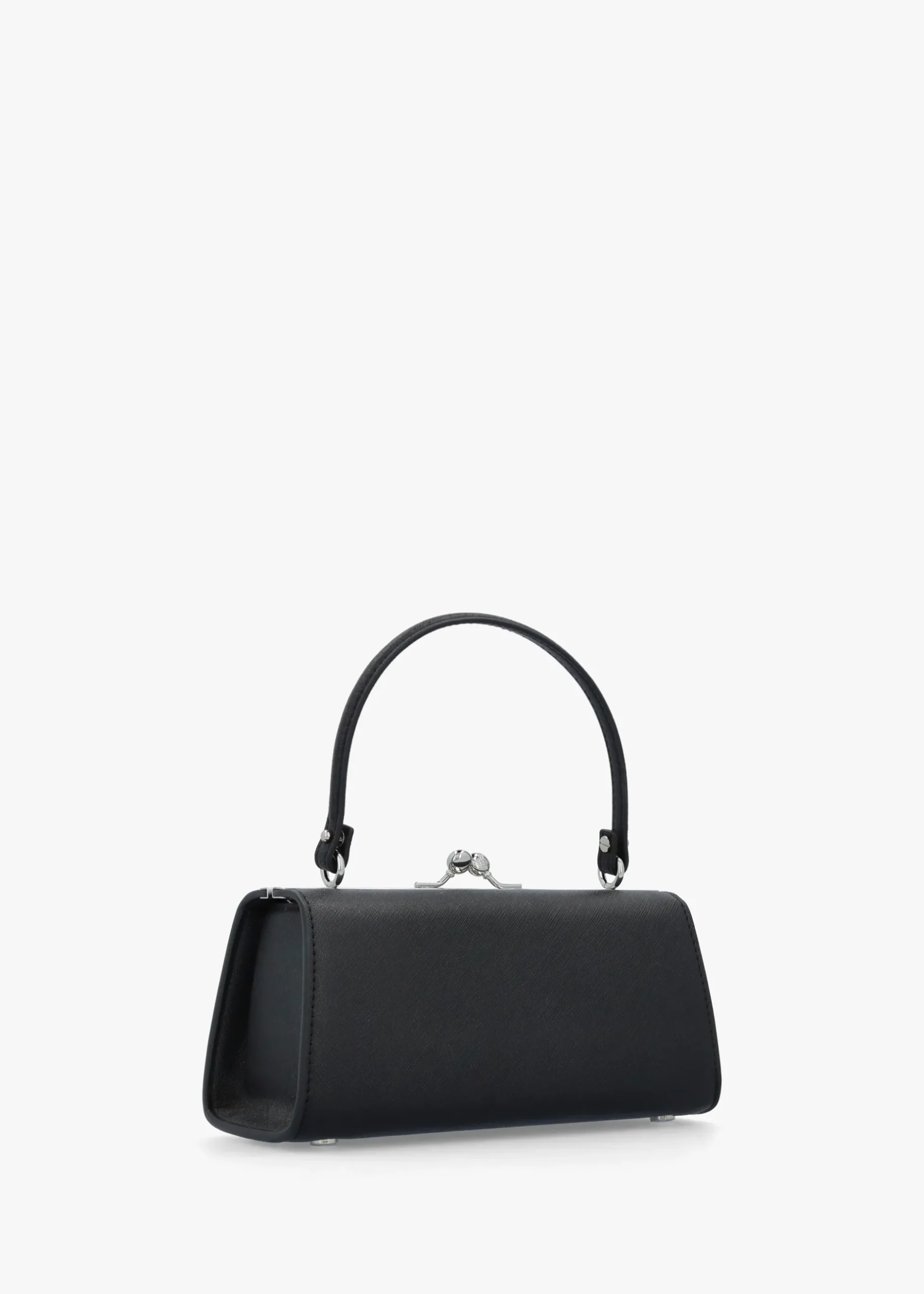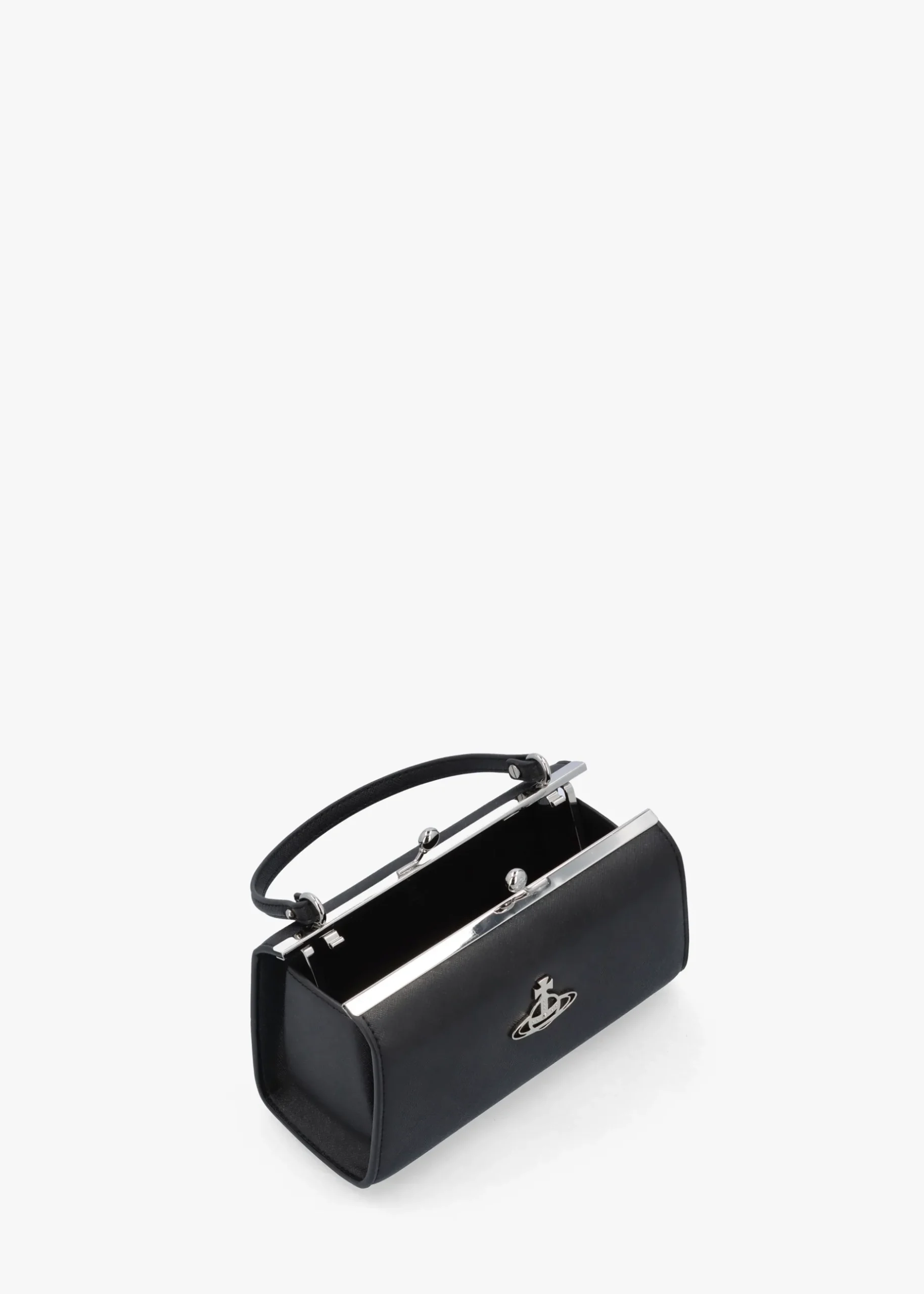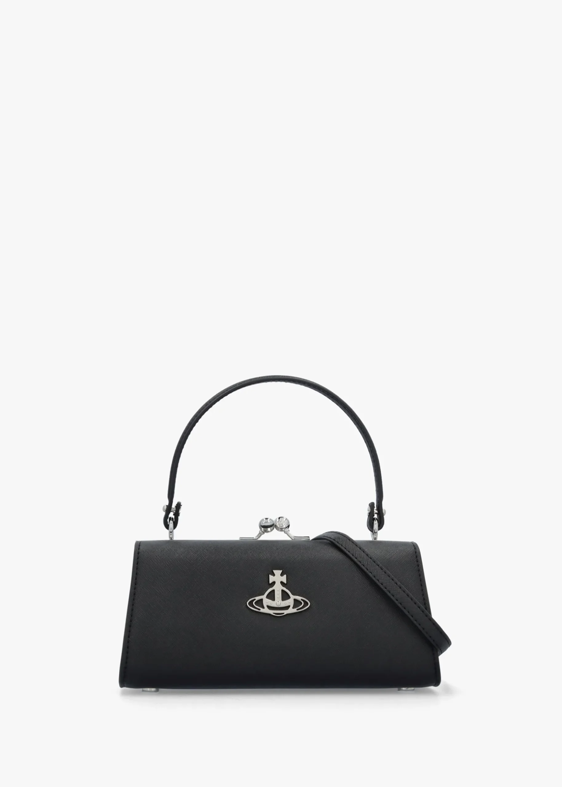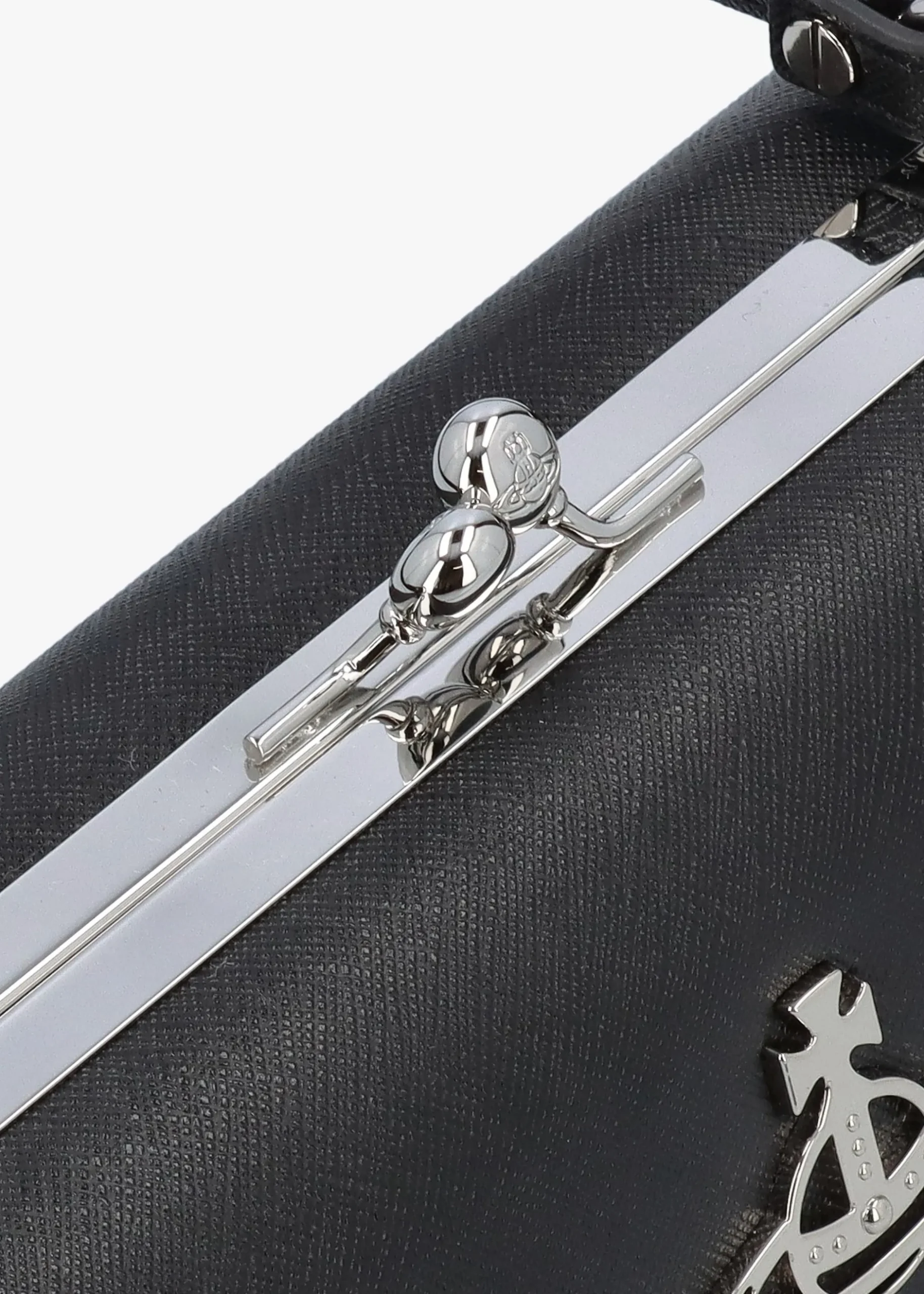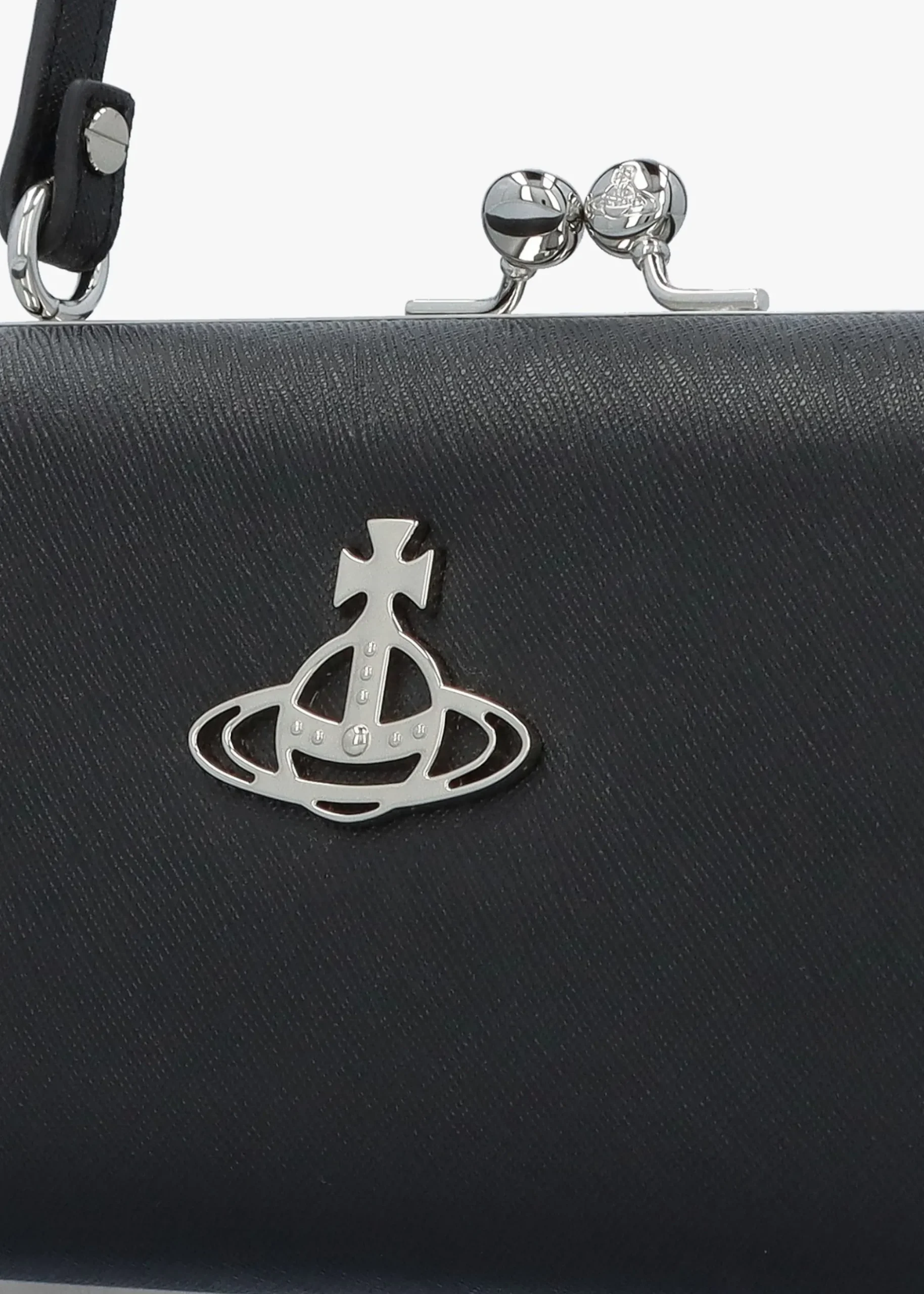 The ‘Extra Large Doll Frame’ bag is part of the New Season collection from Vivienne Westwood. This new silhouette is inspired by toy doll bags, symbolising Vivienne Westwood’s idea of taking tradition into the future. This day to dark style is crafted from premium PU and cotton in a saffiano design with silver tone hardware. The secure kiss lock fastening reveals the single main compartment. Carry by the top handle or the detachable strap. Iconic ‘Orb’ patch adds detail to the front of the bag. Signature Vivienne Westwood branding is seen throughout.
