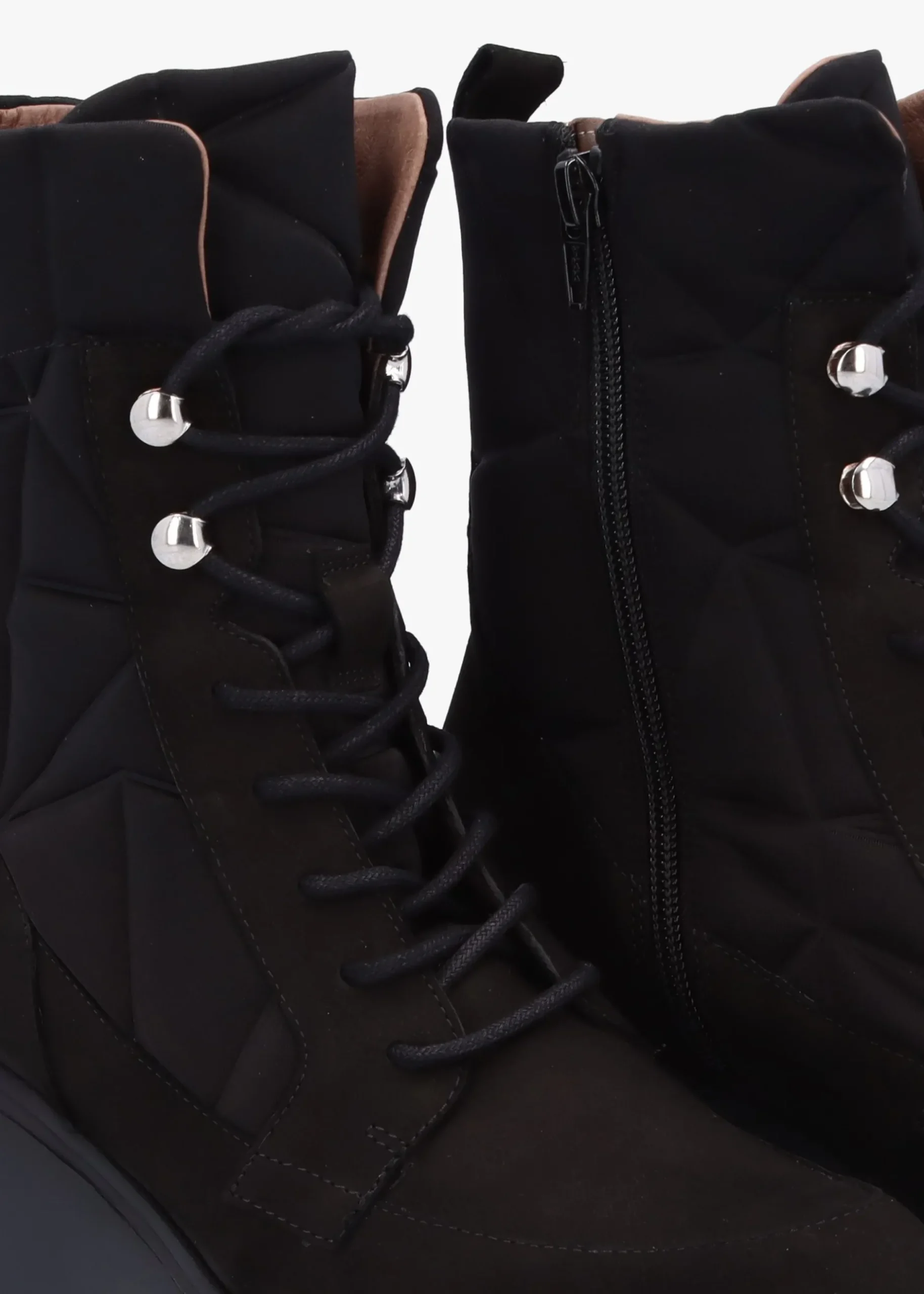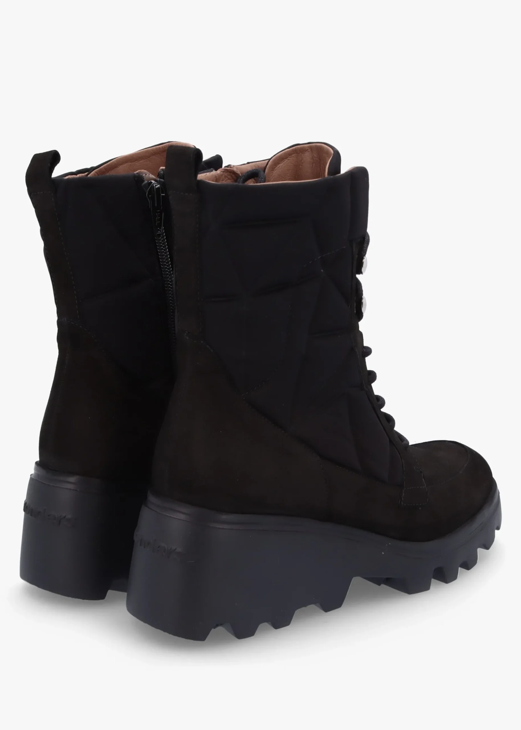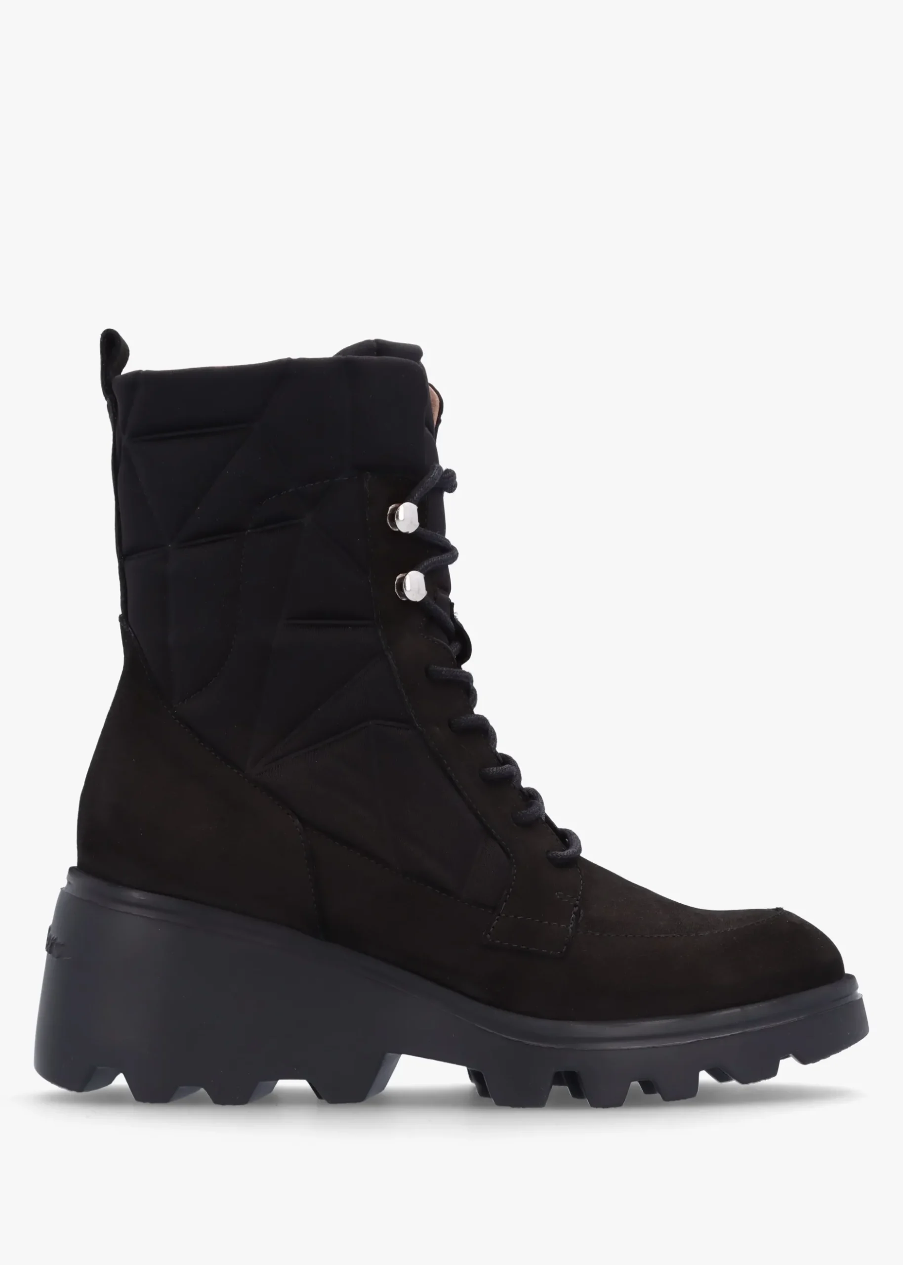 Add the women’s ‘Toronto’ tall wedge ankle boots from Wonders to your boot collection. This New Season style is crafted from a premium suede and quilted nylon upper with luxurious leather lining and a chunky lightweight rubber sole. Zip fastening to the inner leg creates an easy wear and the lace up upper ensures the perfect fit. Signature Wonders branding is seen to the footbed and sole.