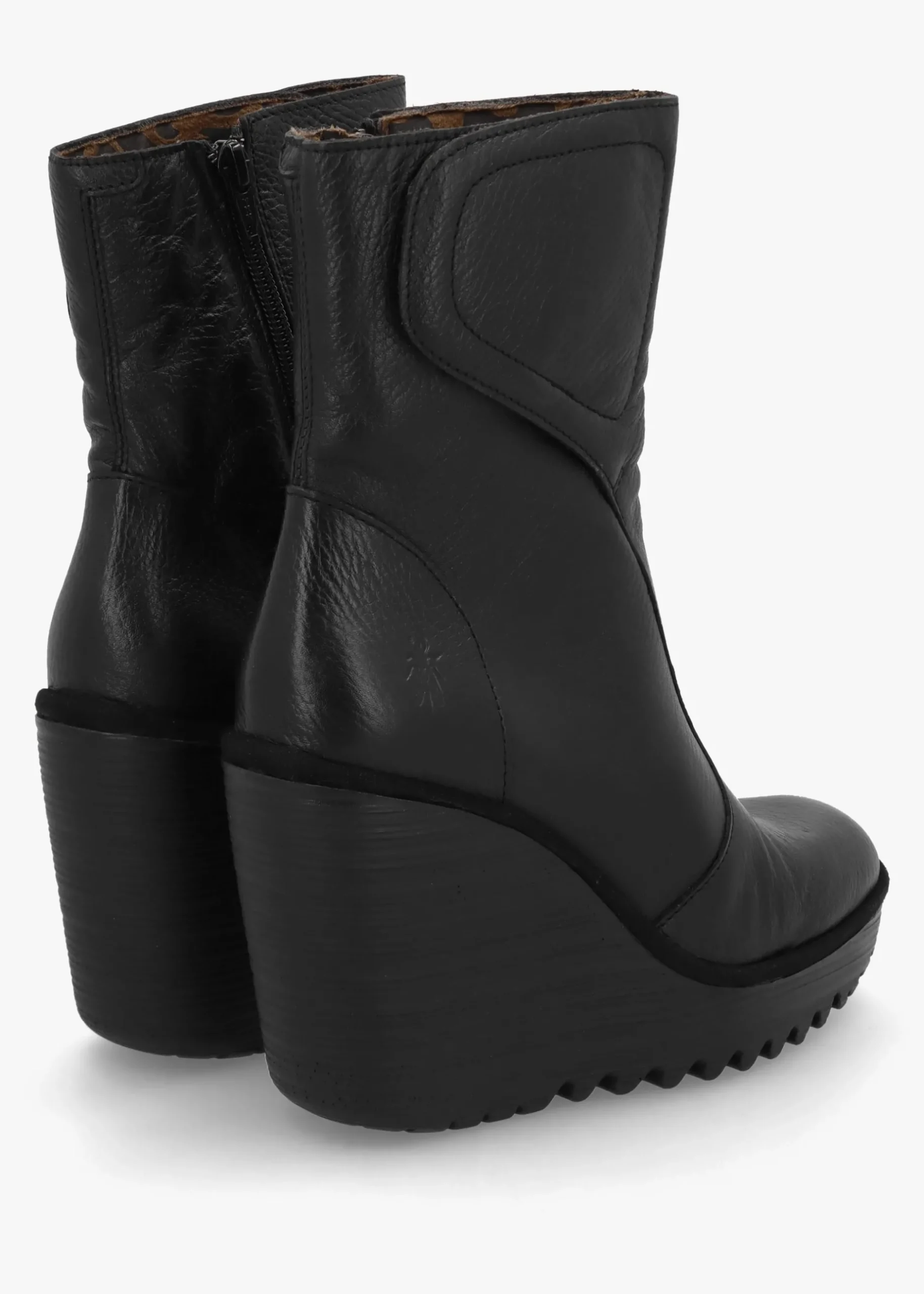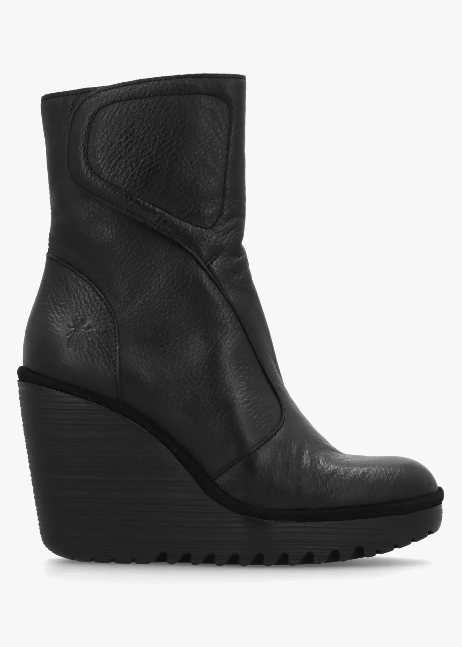The ‘Dally’ high wedge ankle boots are part of the New Season style from Fly London. This re-invented classic style is crafted from premium full grain pebbled leather with patterned microfiber lining and a saw edge rubber sole. Zip fastening to the inner leg creates an easy wear as well as velcro fastening top-line. Subtle tonal top stitching and raised seaming add detail as well as classic embossed ‘Fly’ logo. The round toe and high wedge make up the silhouette. Signature Fly London branding is seen to the foot-bed and sole.