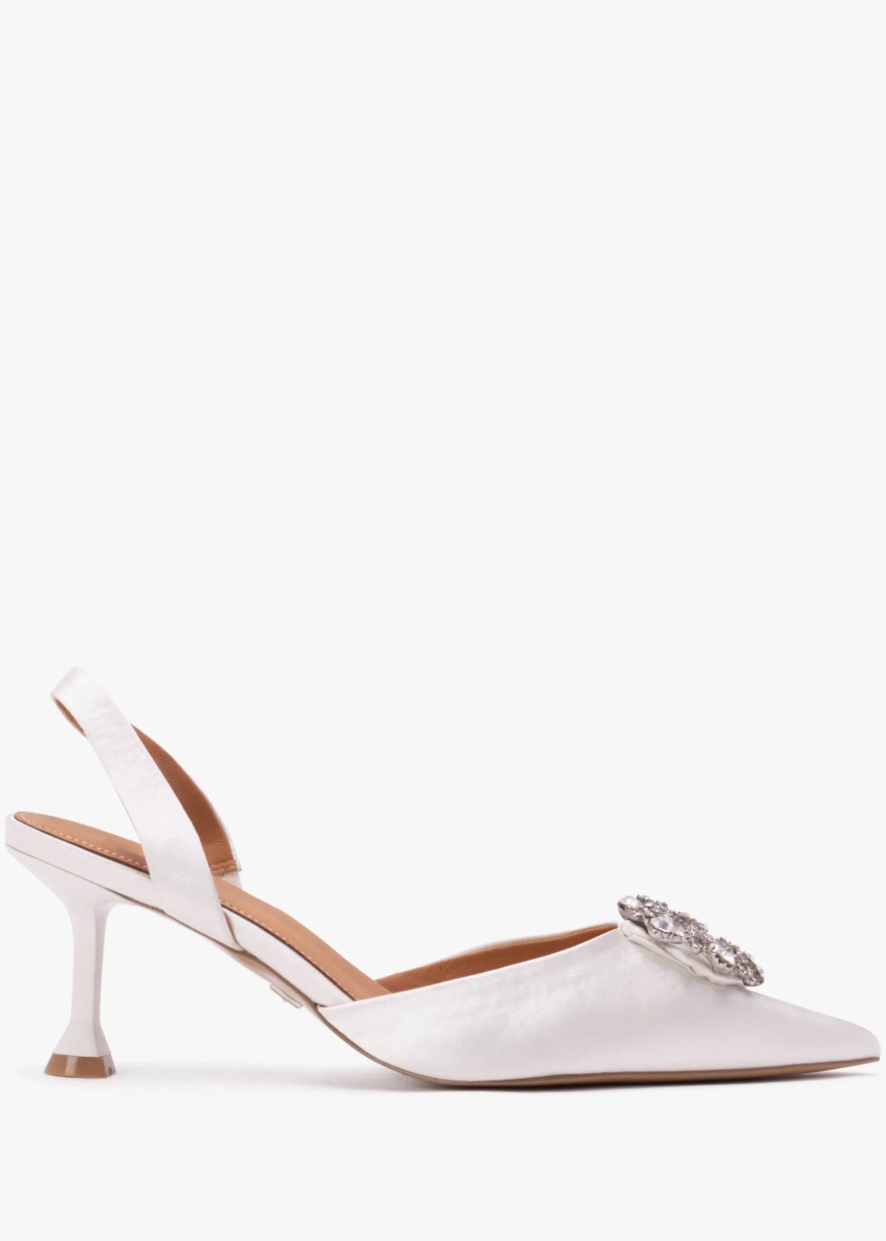 The ‘Elewed’ sling back heeled pumps from Kazar are the perfect wedding shoe. This elegant style is crated from a premium satin look upper with luxurious leather lining and a man-made sole. An easy to wear slip on style featuring elasticated sling back. The pointed elongated toe and mid shaped heel. Jewel embellishment adds detail to the upper. Signature Kazar branding is seen to the foot-bed.