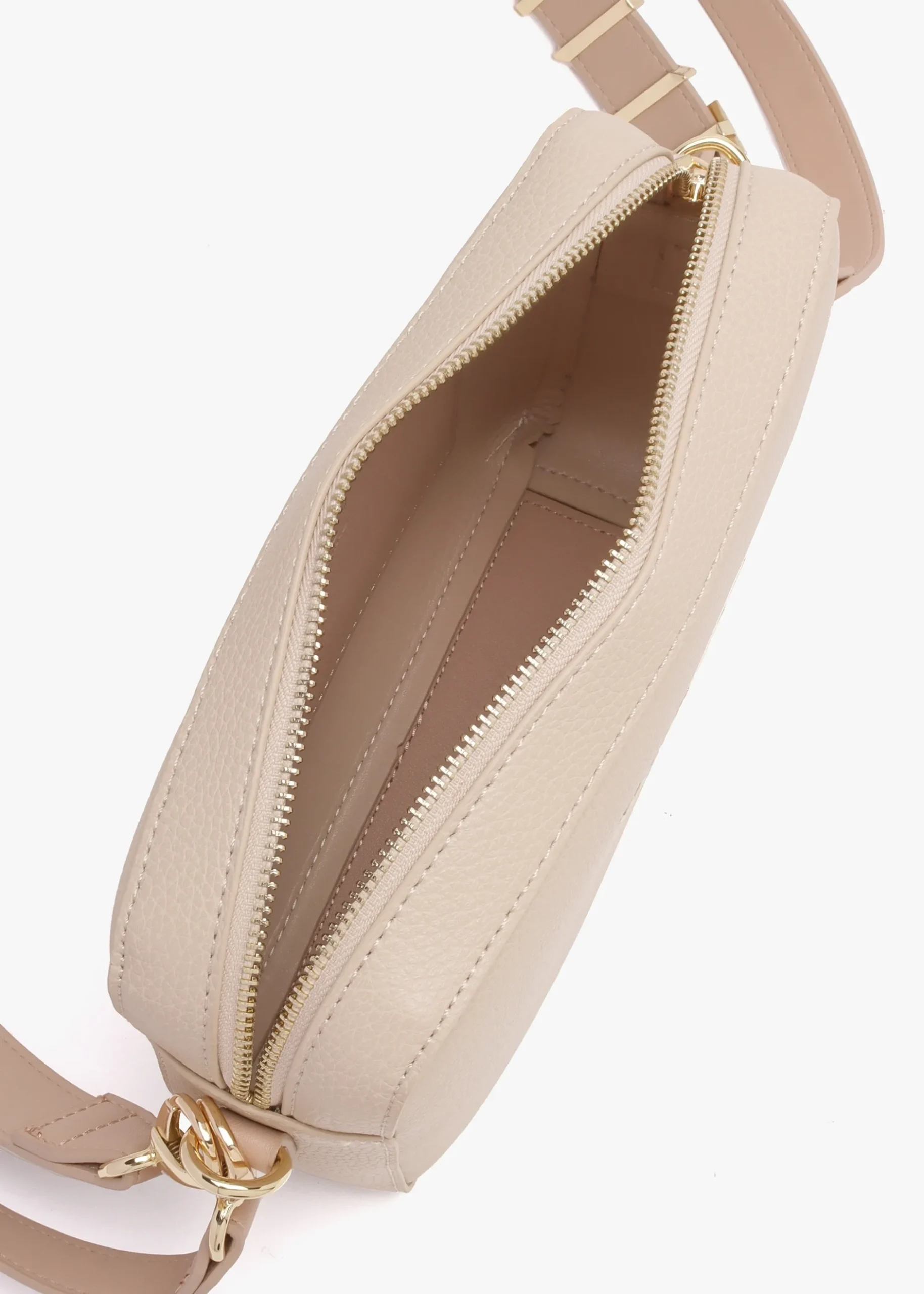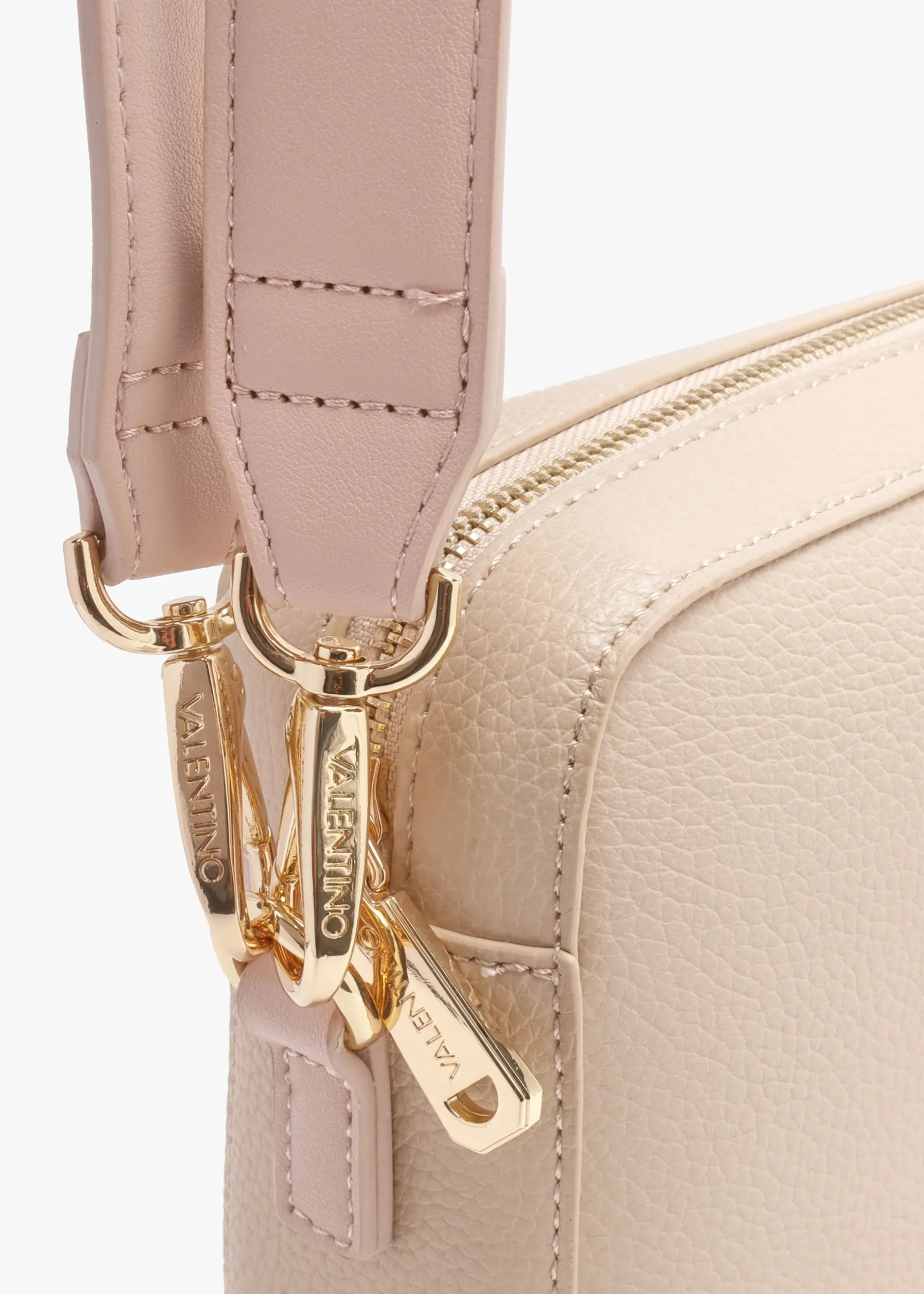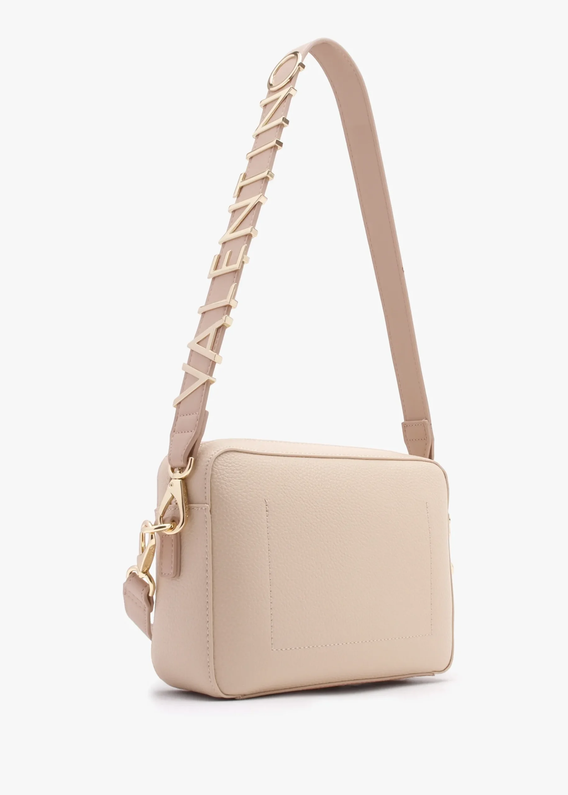The ‘Alexia’ camera bag is part of the New Season collection from Valentino. This versatile everyday style is crafted from premium PU in a pebbled design with polished gold tone accents. The secure top zip fastening reveals the main compartment featuring handy inner slot pocket. Carry by either of the detachable straps. Signature Valentino branding is seen throughout.