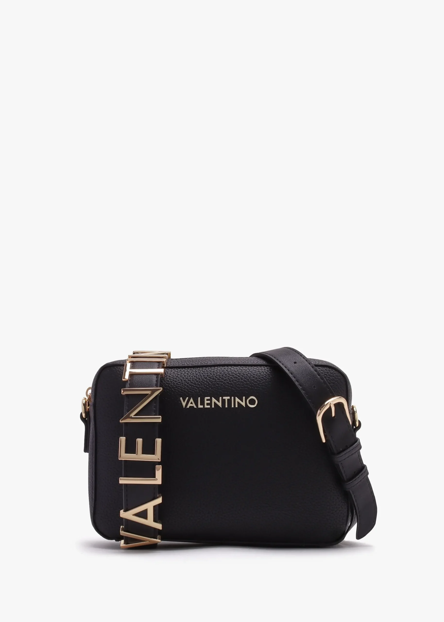 The ‘Alexia’ camera bag is part of the New Season collection from Valentino. This versatile everyday style is crafted from premium PU in a pebbled design with polished gold tone accents. The secure top zip fastening reveals the main compartment featuring handy inner slot pocket. Carry by either of the detachable straps. Signature Valentino branding is seen throughout.