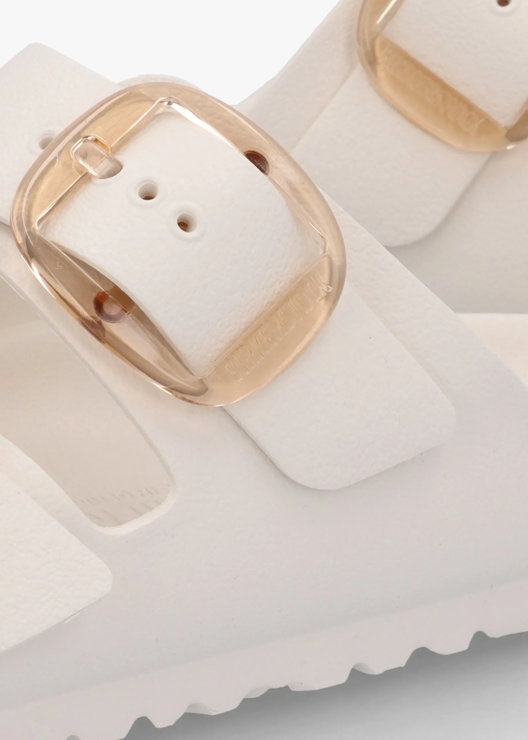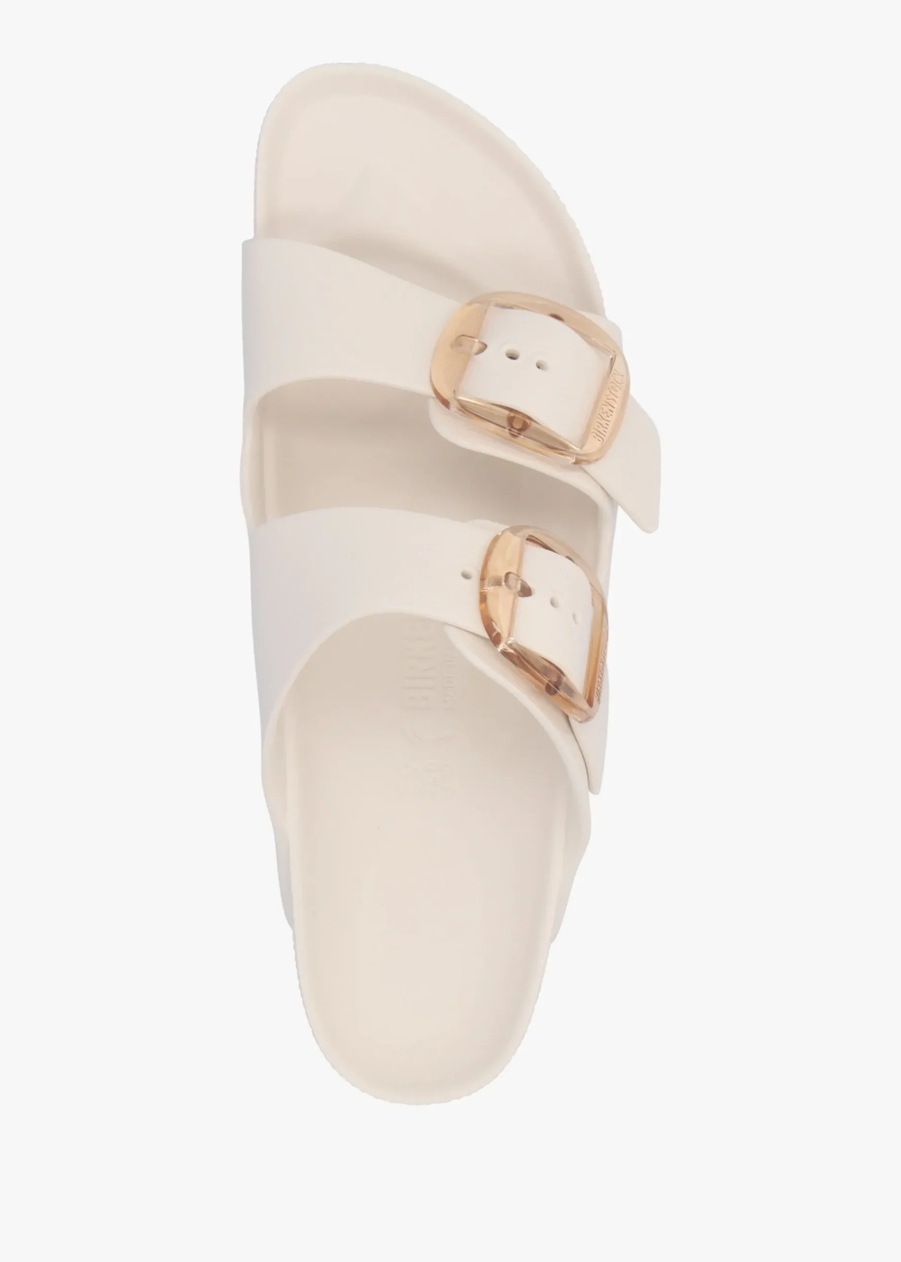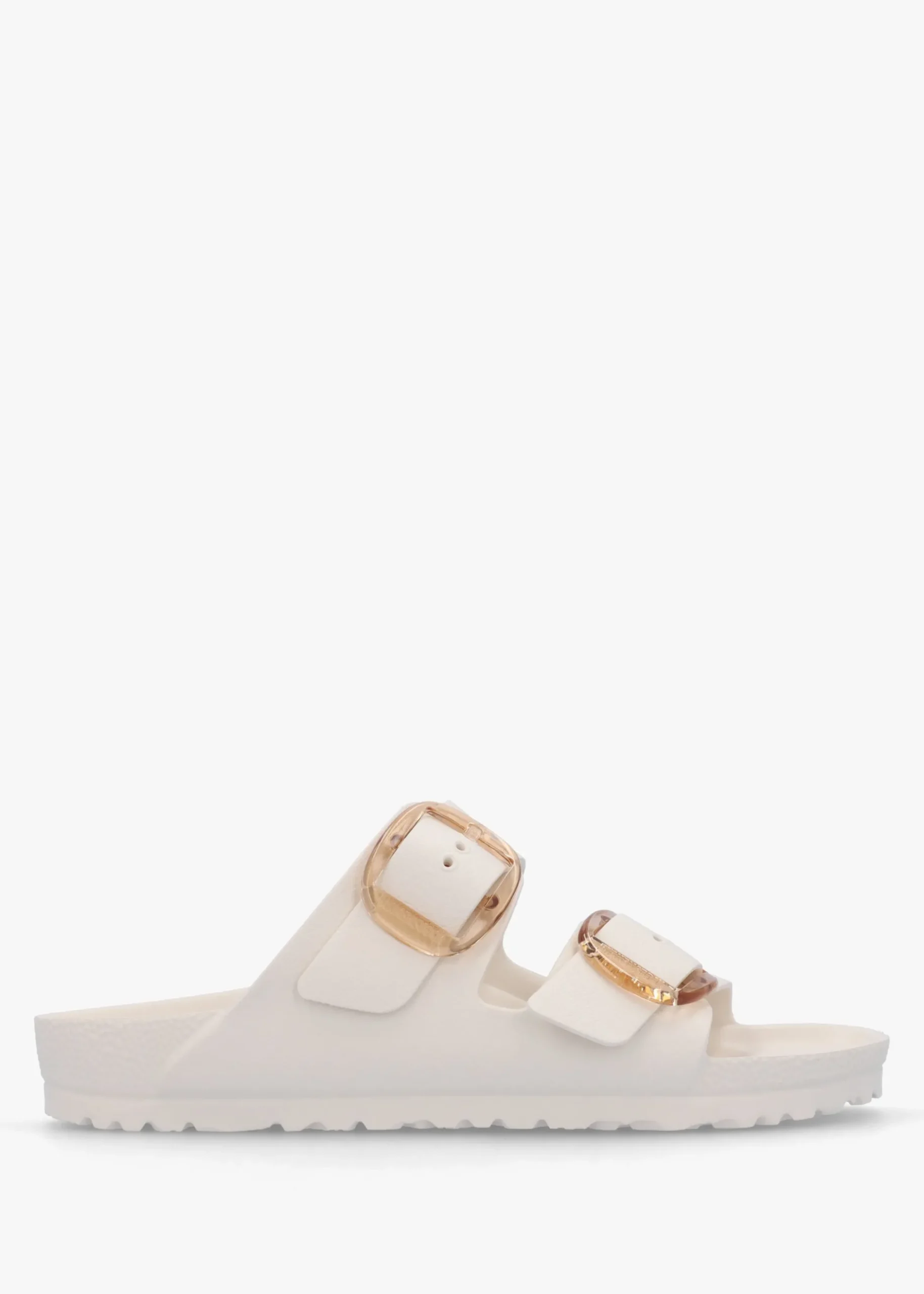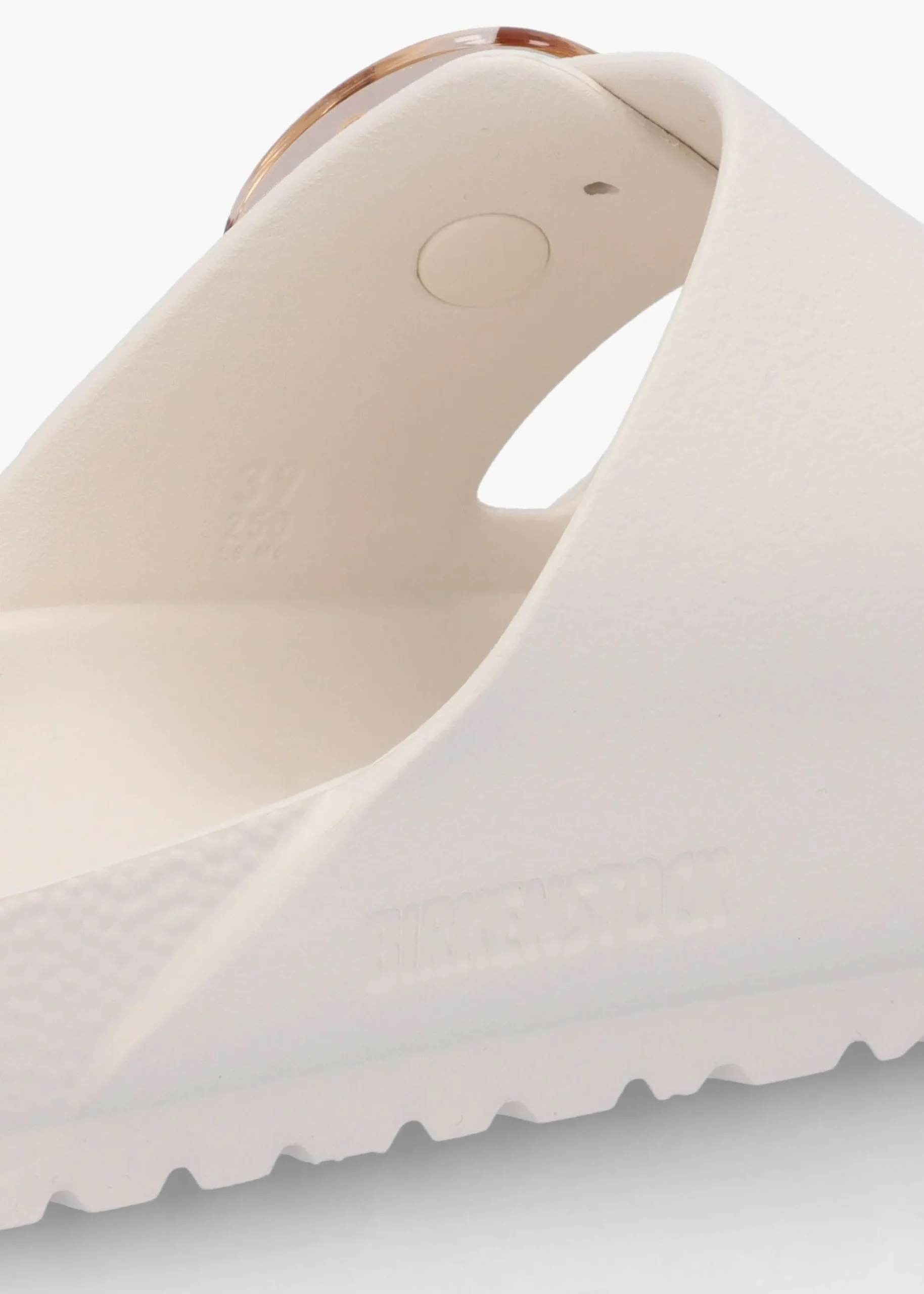 The popular ‘Arizona’ mules from Birkenstock have been given an update this Season. This waterproof light weight version is crafted from premium EVA. The footbed has been contoured to conform to the shape of your foot – with arch support and and extra layer of cushioning for optimum comfort. An easy to wear slip on mule featuring two strap upper with acrylic big buckle fastening. Signature Birkenstock branding is seen throughout.