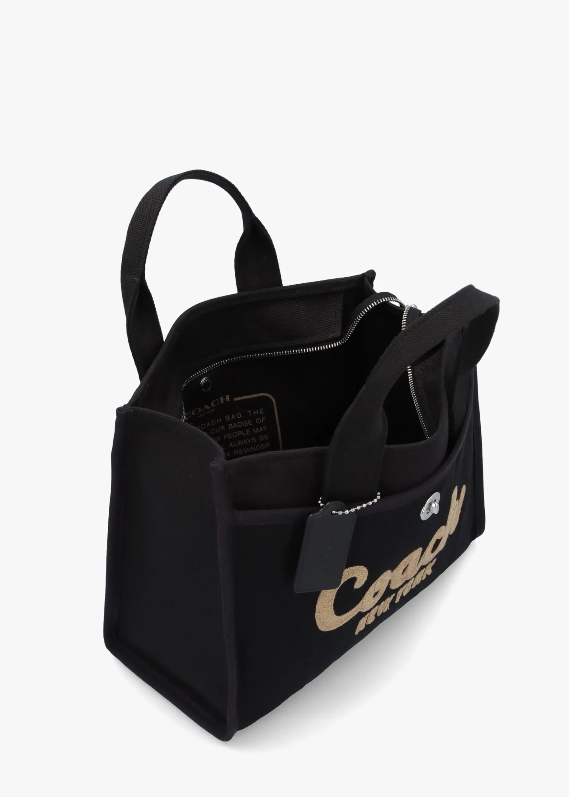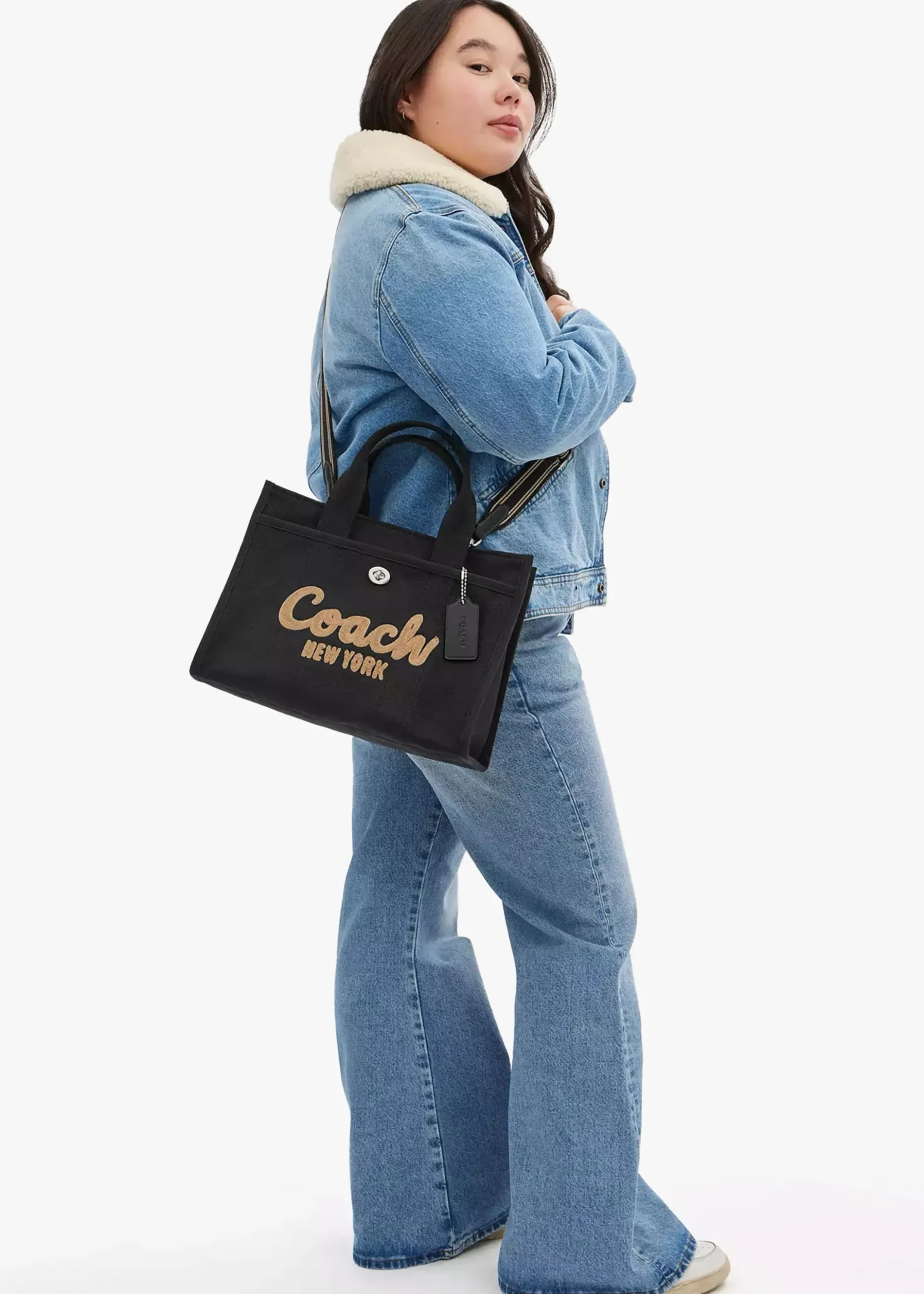 Add the lightweight carryall ‘Cargo’ tote bag from COACH to your handbag collection. This day bag style is crafted to last and made with cotton sourced from farms that use regenerative agricultural practices* and inspired by COACH’s commitment to reducing their impact on the planet. The secure top zip fastening reveals the main compartment, exterior turn lock and popper fastening slot pockets also feature. Carry by the grab handles or the detachable strap. Branded script embroidery adds detail as well as iconic ‘C’ logo. Signature COACH branding is seen throughout.