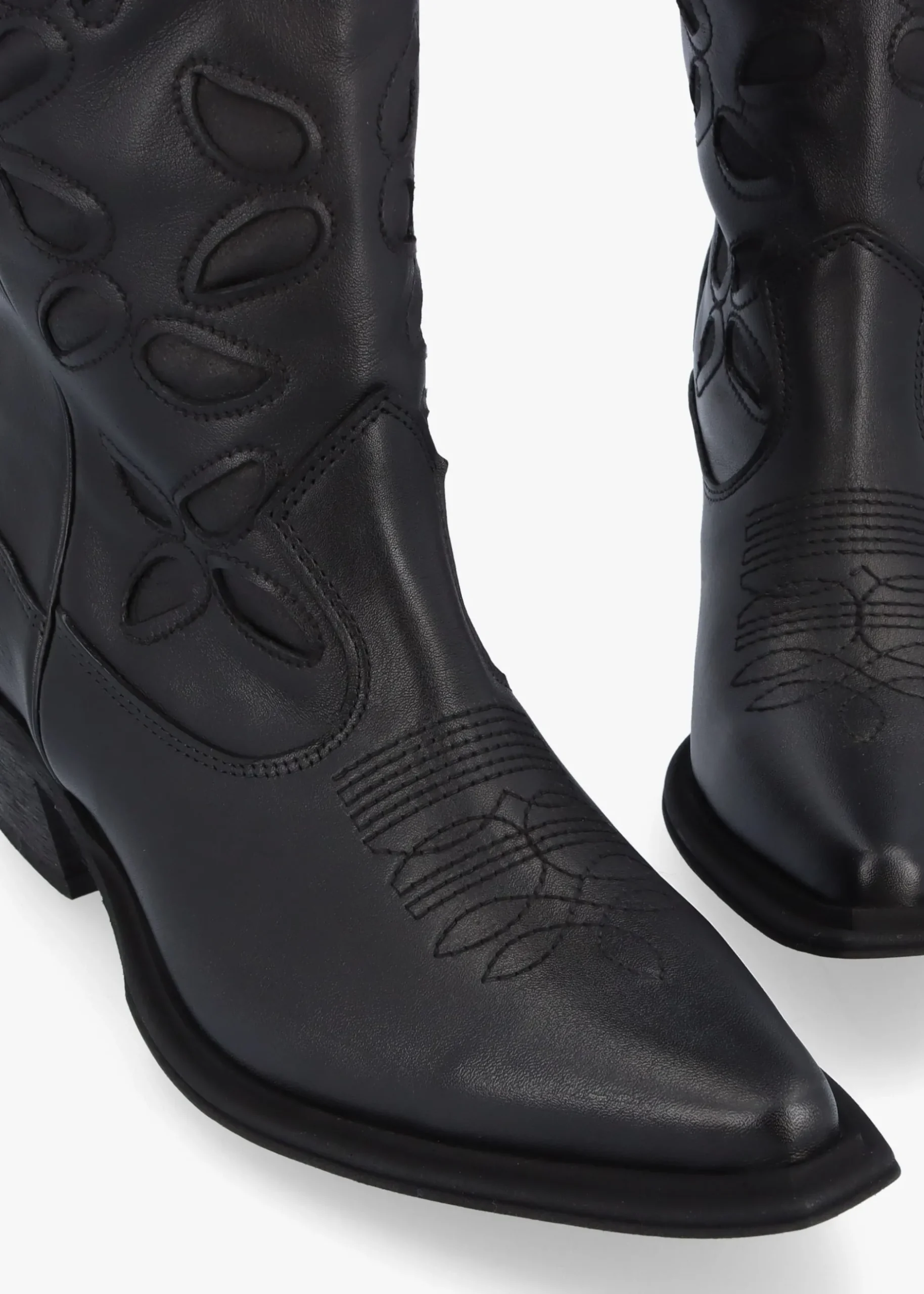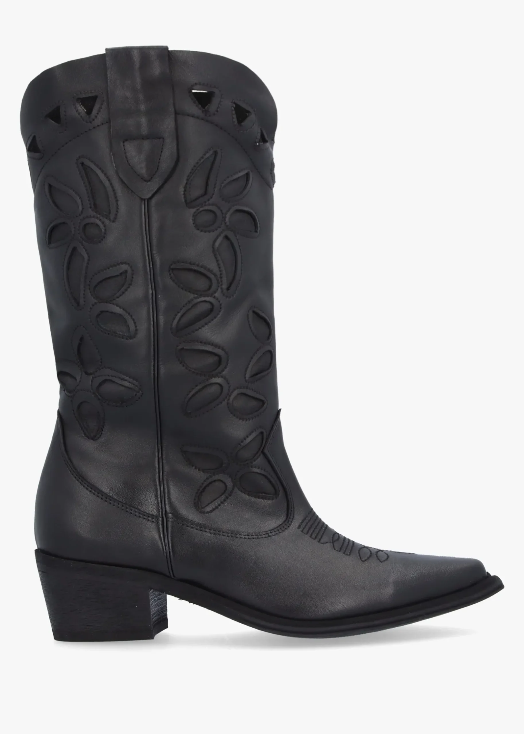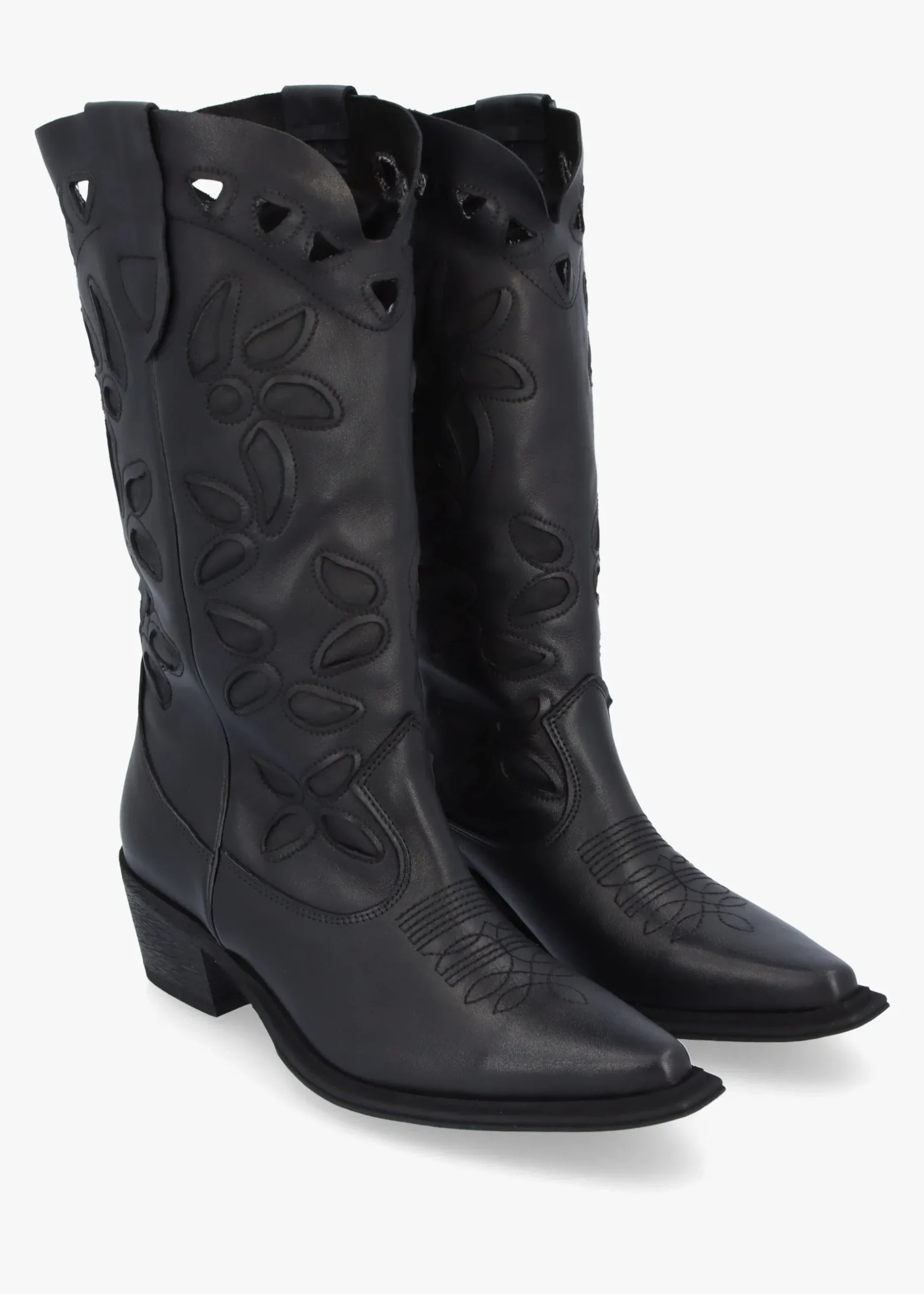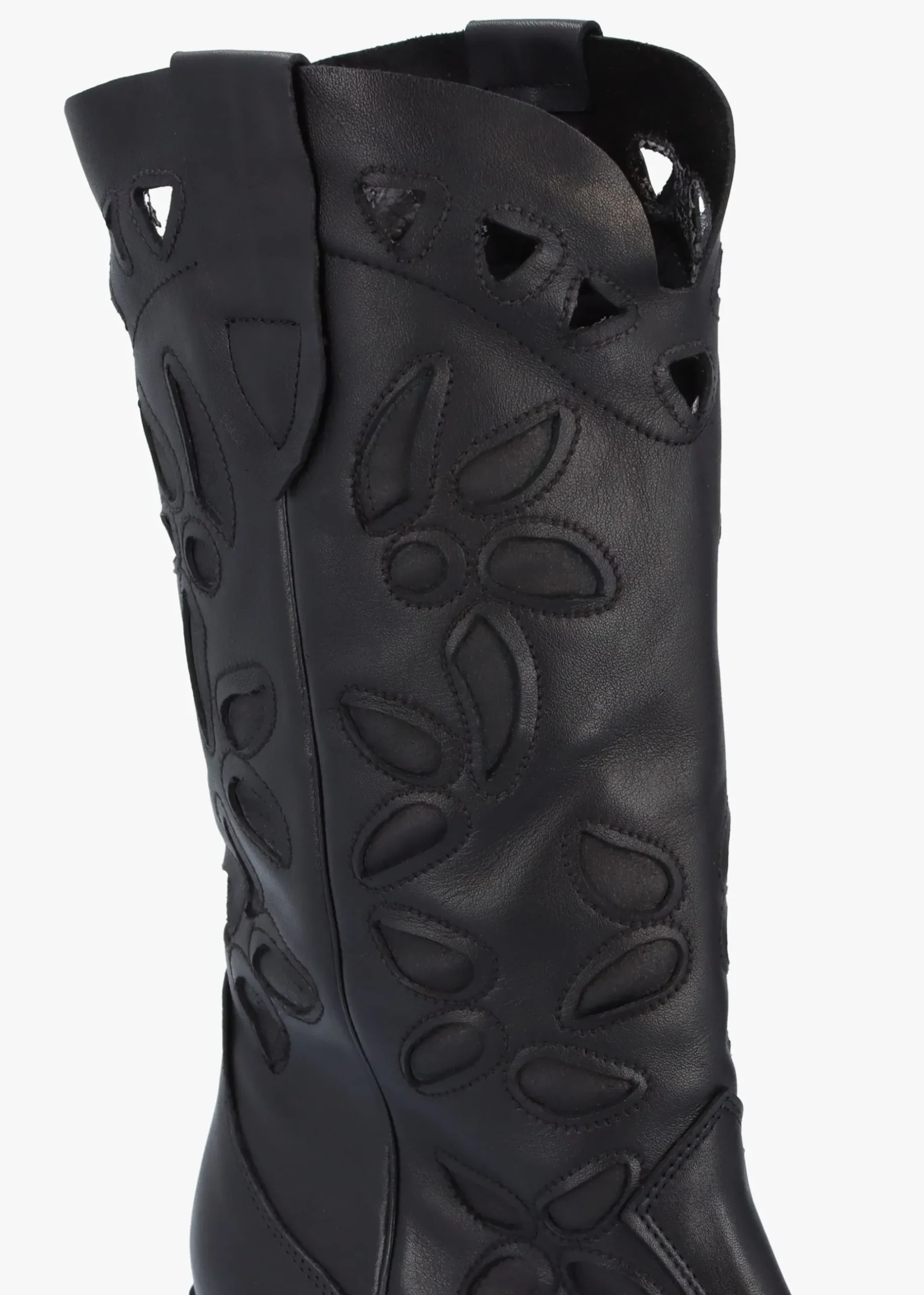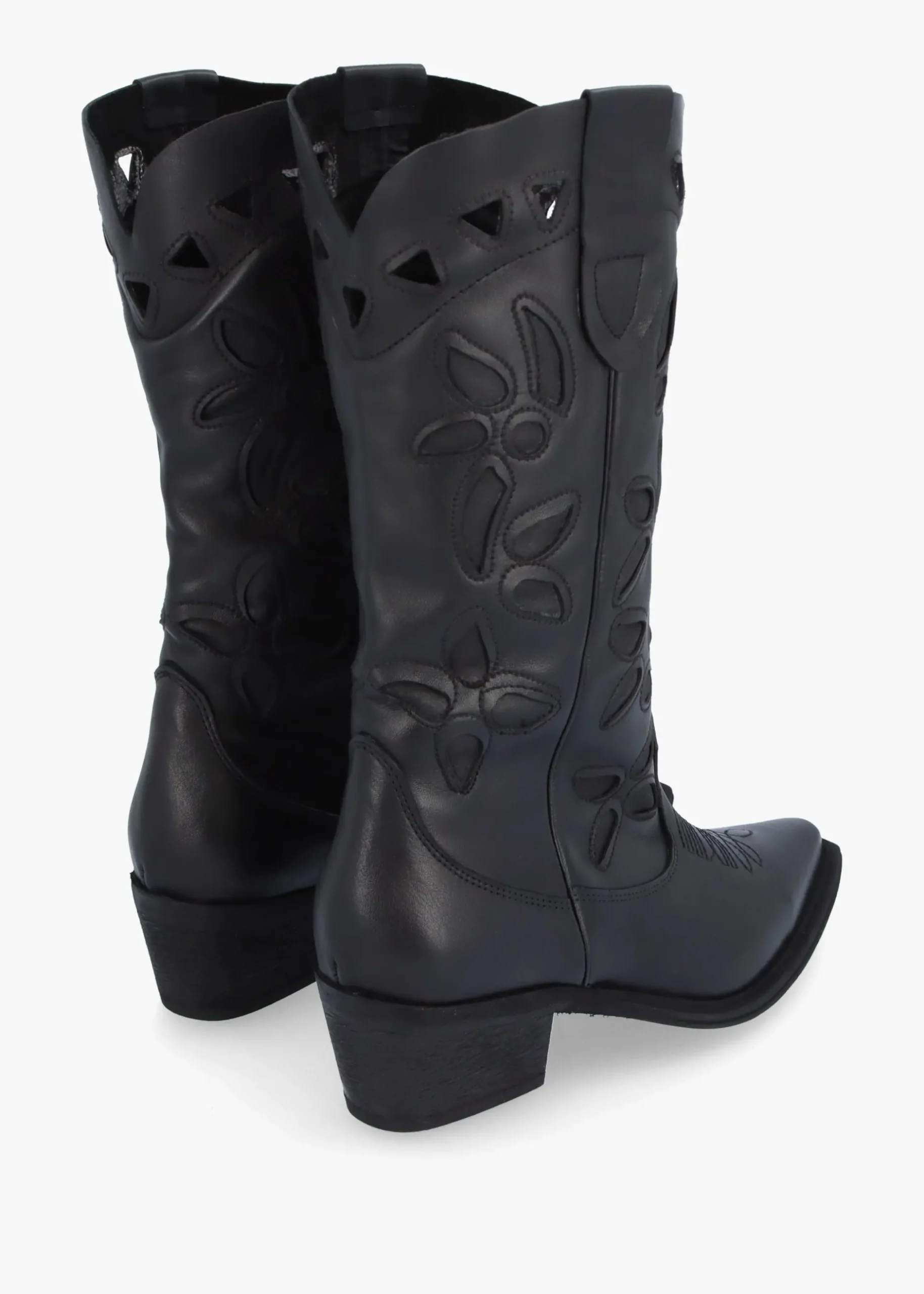 The ‘Kubra Cutout’ cowboy boots are part of the New Season collection from Daniel Footwear. This statement style is crafted from a premium leather upper with textile lining and a man made sole. An easy to wear pull on style. Embroidery to the upper adds detail as well as laser cut design. The pointed toe and mid stacked heel make up the silhouette. Signature Daniel branding is seen to the foot-bed.