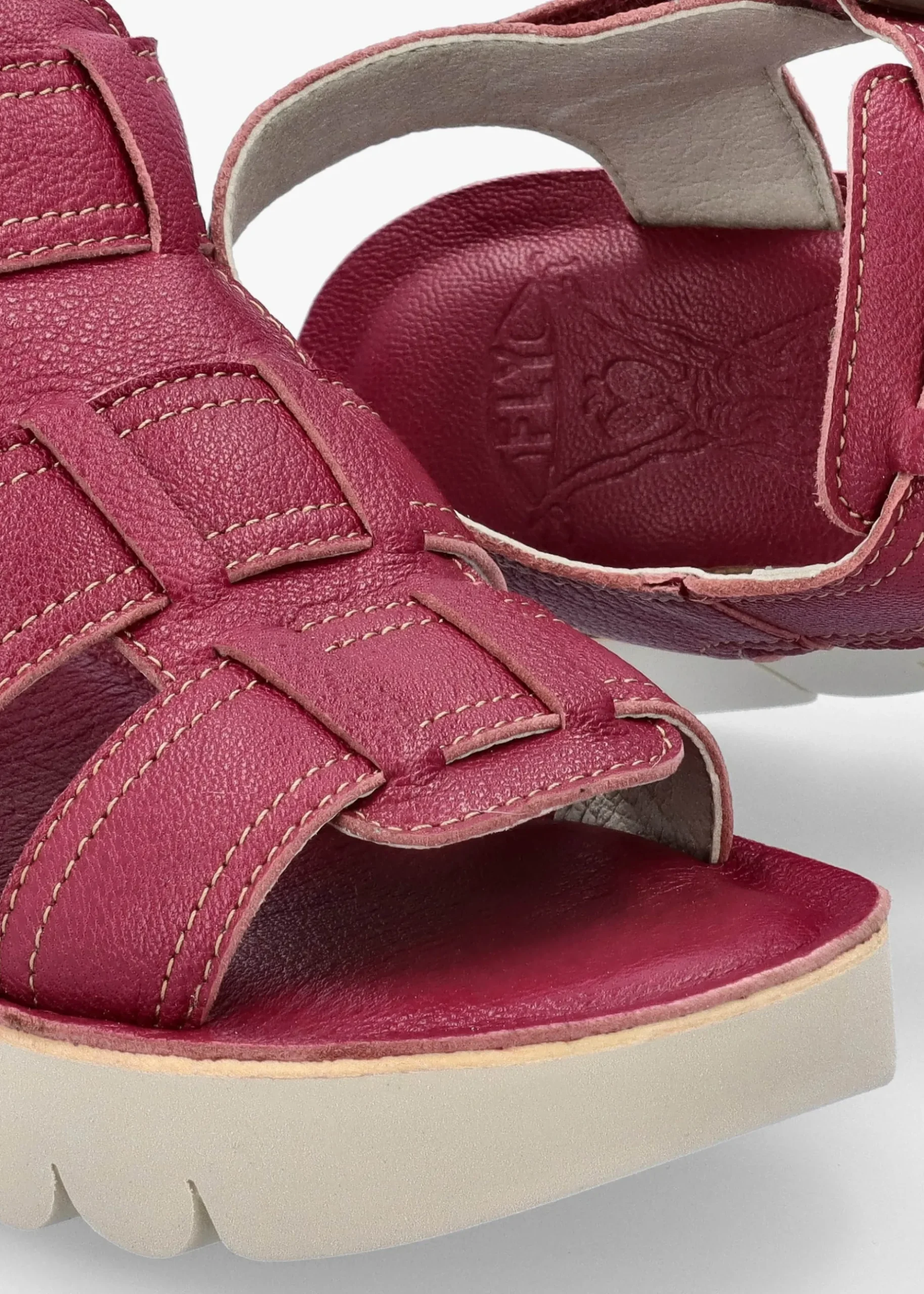 New from Fly London this Season the ‘Yudd’ wedge sandals. Crafted from a premium tumbled leather upper with textile lining, cushioned footbed and a cleated rubber sole. An easy to wear slip on style featuring velcro fastening with logo buckle to the ankle. Classic debossed logo adds detail to the ankle. Signature Fly London branding is seen to the footbed, sole and hardware.