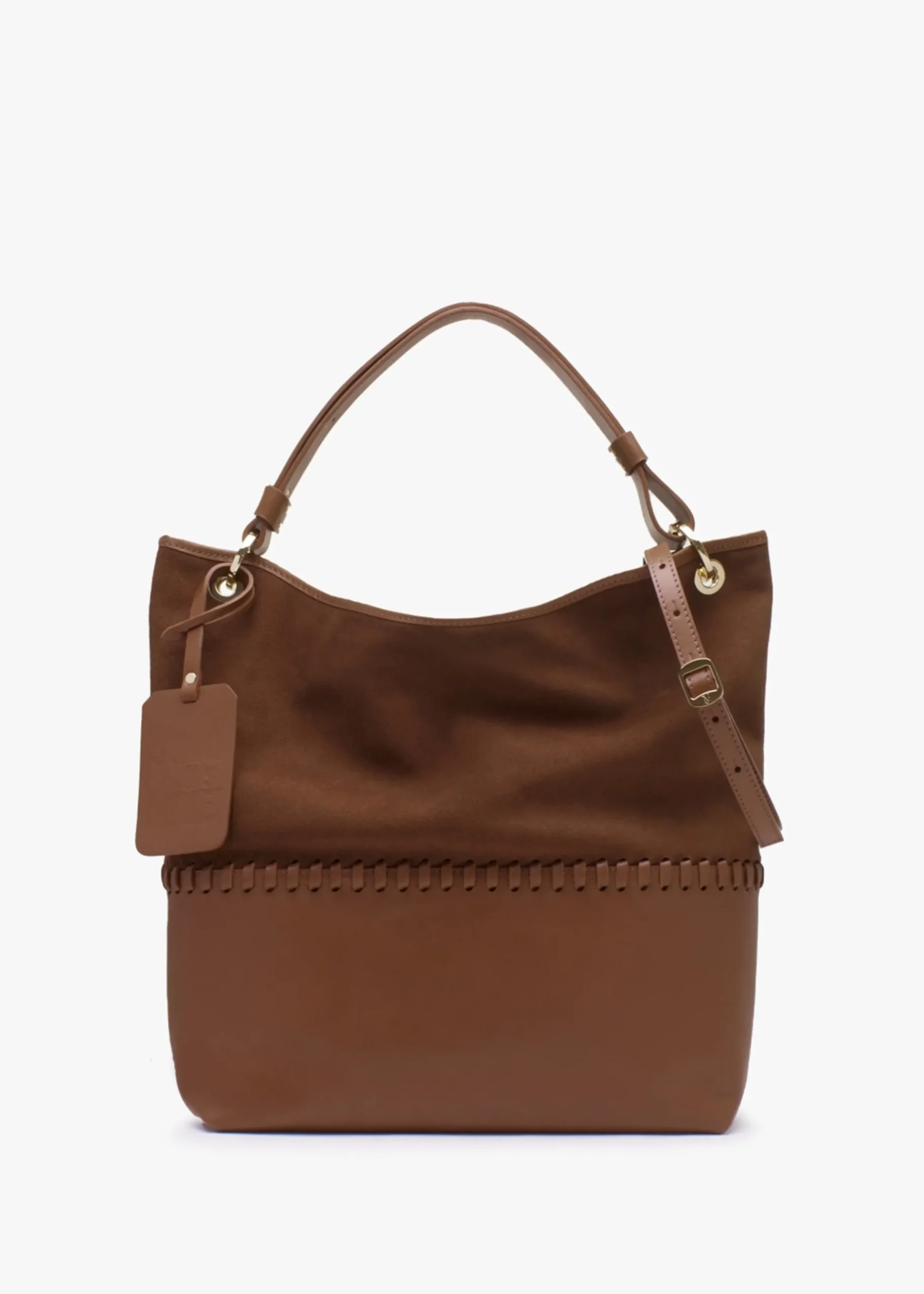This spacious New Season hobo bag is perfect for everyday use. A collaborative style from Christian Villa x Daniel Footwear that is 100% hand crafted by highly skilled leather craftspeople, using traditional techniques. Both designed and manufactured in Italy this UK exclusive style features both premium smooth leather, contrasting suede, microfiber lining and polished gold tone hardware. Carry by the shoulder strap or the detachable leather strap. The secure magnetic snap fastening reveals the main compartment and features handy inner zip pockets. Whipstitching trim adds detail. Classic branding is seen to the inner slot pocket.