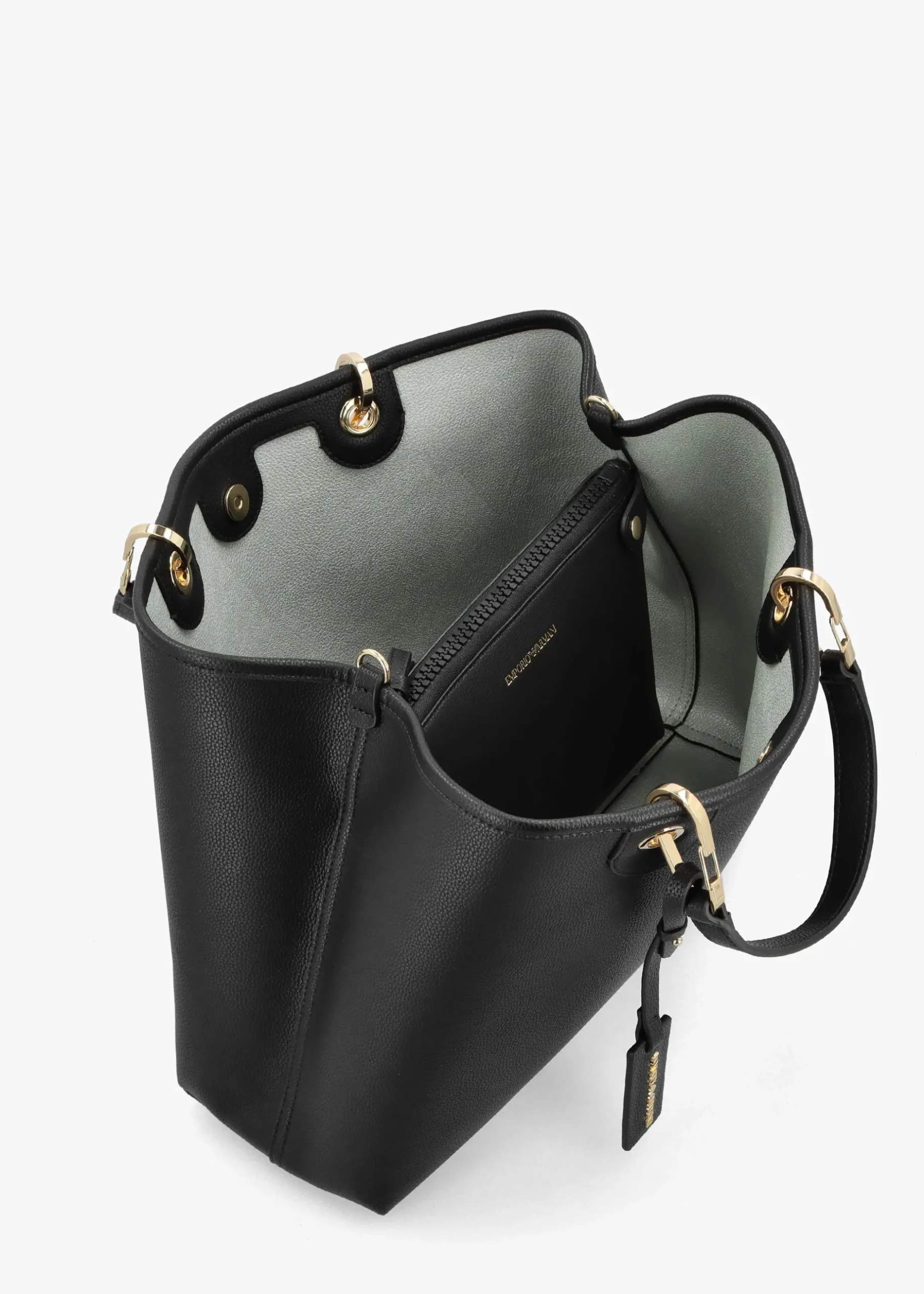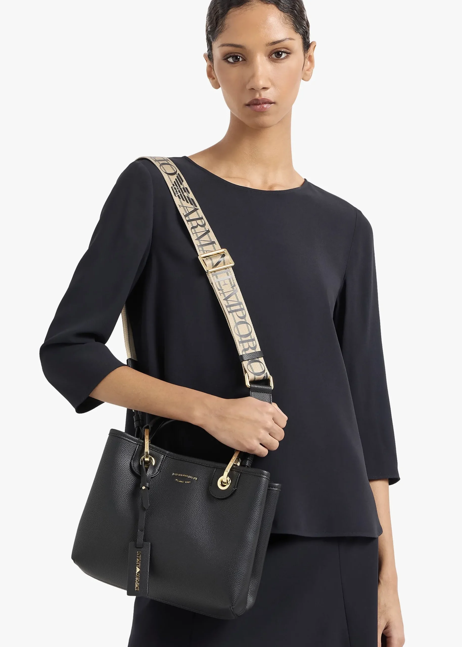 This ‘Shopper With Pouch’ from Emporio Armani is the perfect day bag style. Crafted from premium pebbled PU with gold tone accents. The secure magnetic snap fastening reveals the main compartment with handy inner detachable pouch. Carry by the top handles or go hands free with the detachable logo guitar strap. Signature Emporio Armani branding is seen throughout.