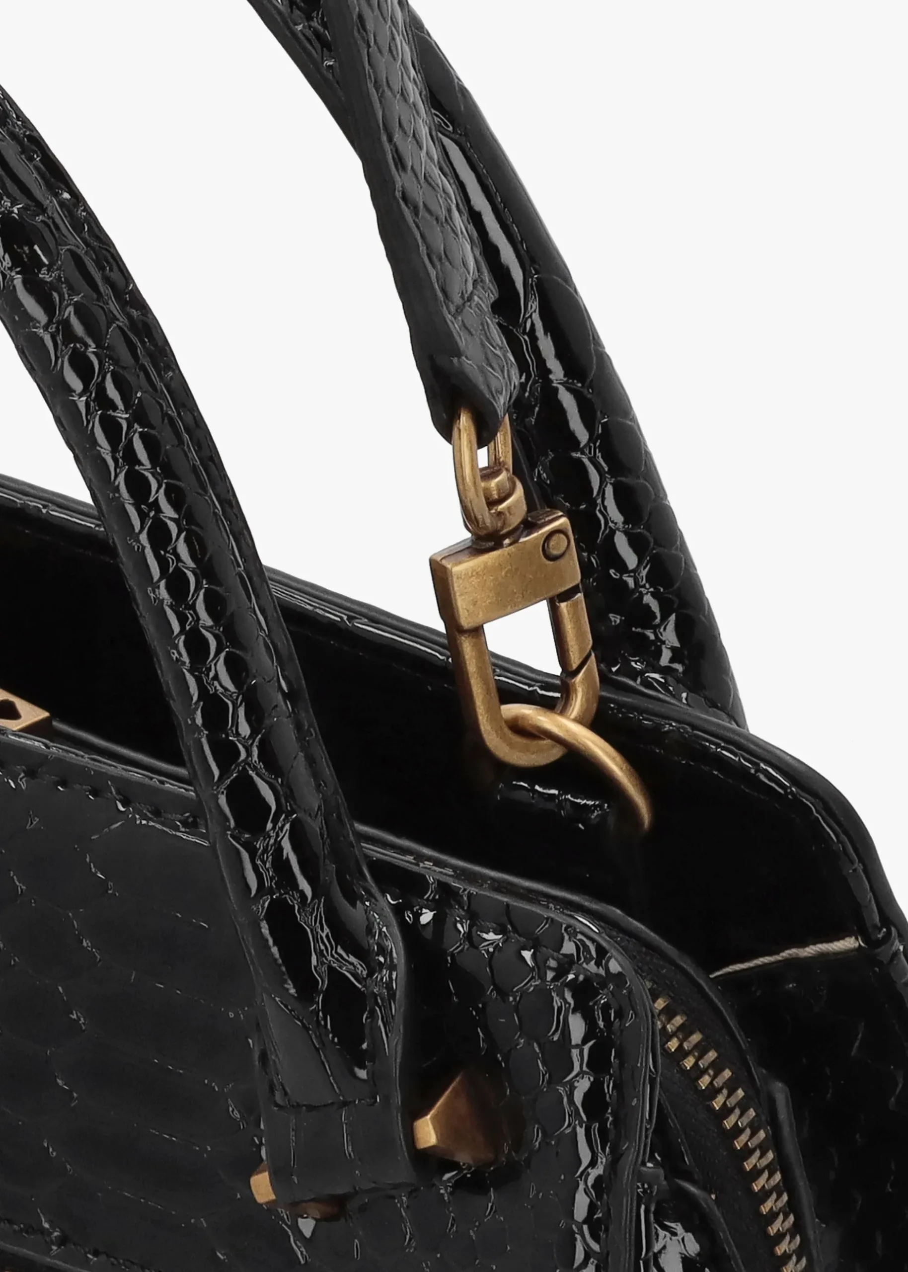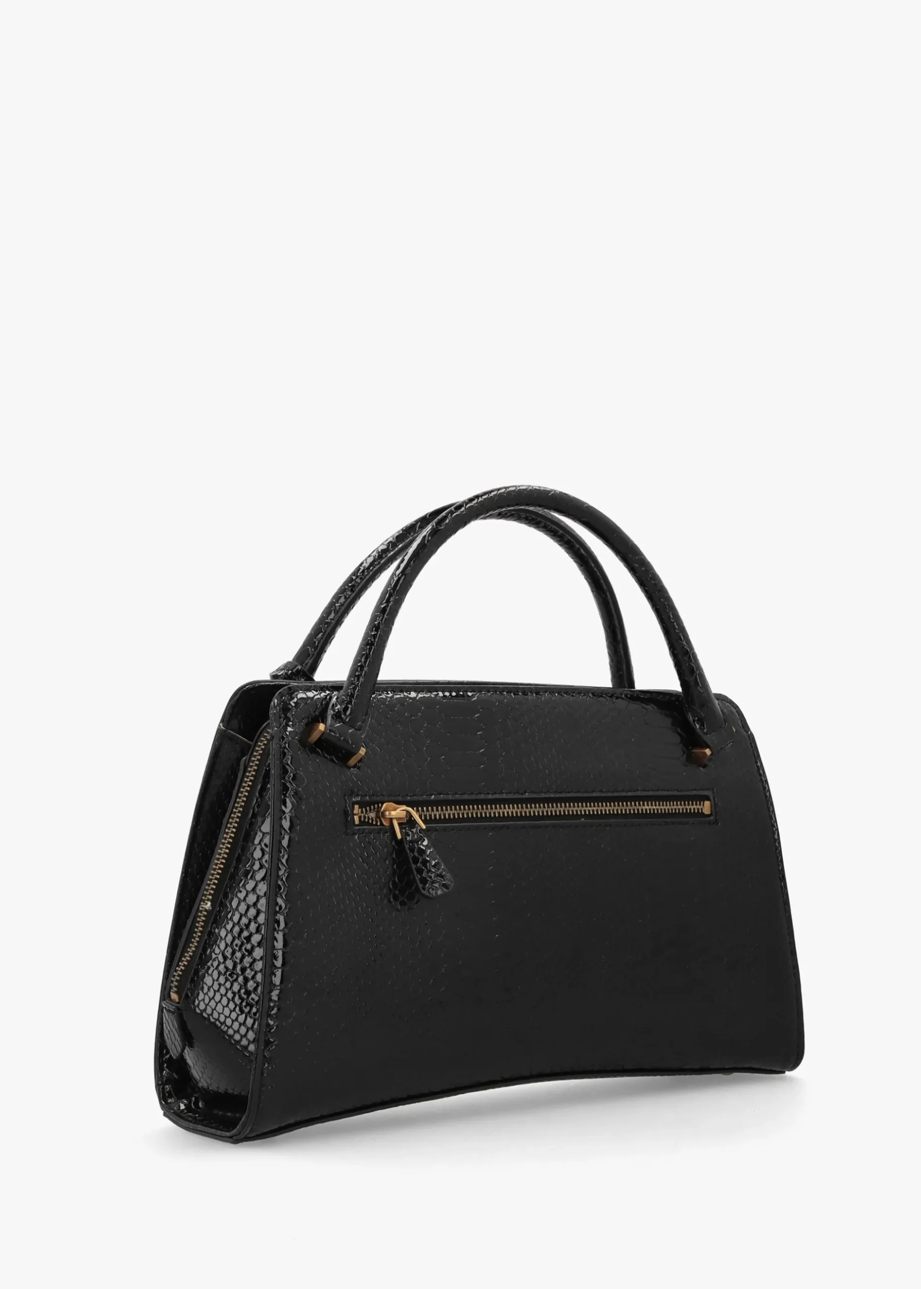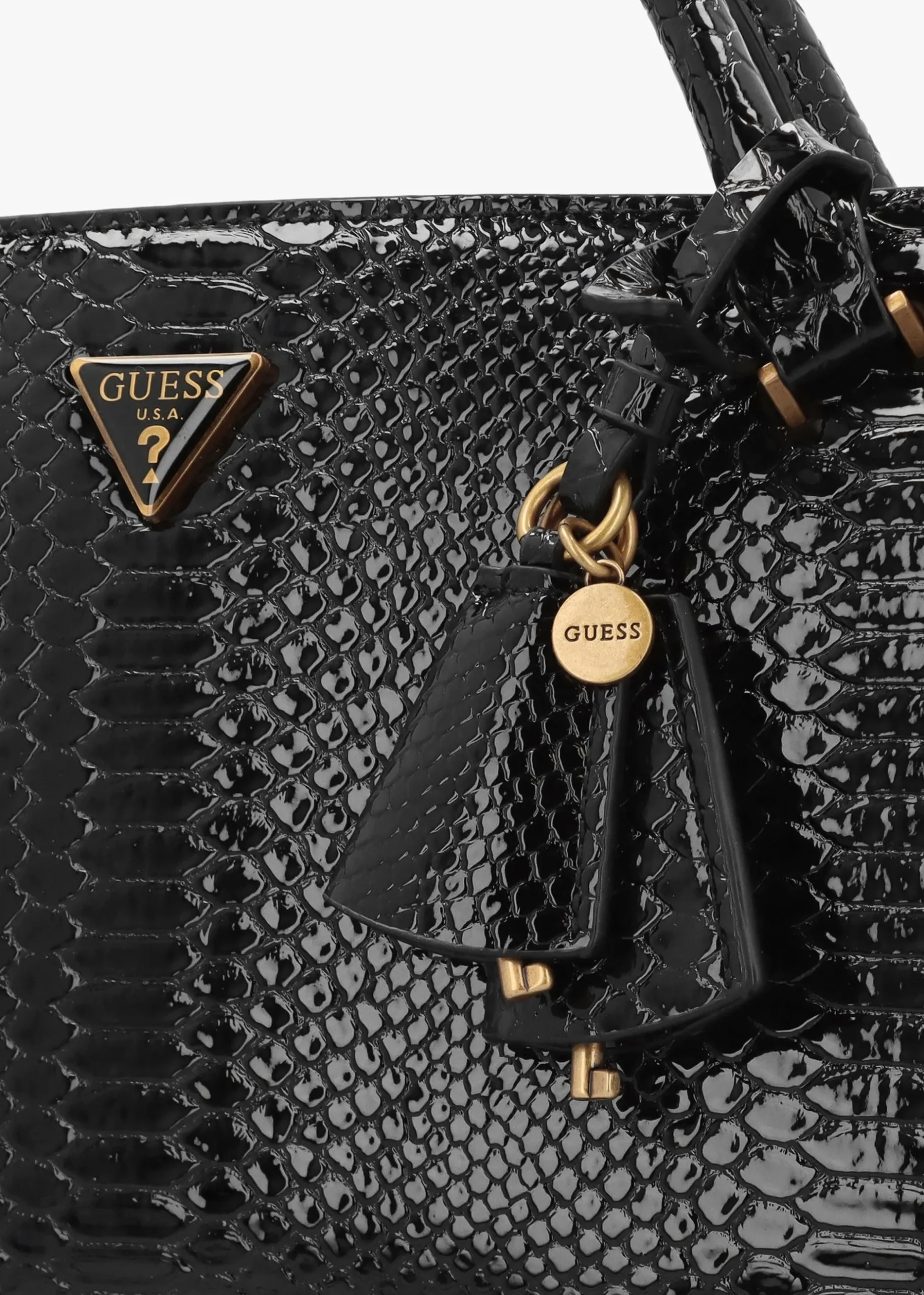 New to Daniel Footwear this Season ‘Annita Girlfriend’ satchel from GUESS. This vintage inspired style is crafted from premium PU in a chic reptile design with gold tone accents. Triple compartments feature with logo lining, central zip pocket and handy inner zip and slot pockets, further zip pocket is seen to the exterior. Carry by the grab handles or the detachable strap. Double luggage tag adds detail as well as classic triangle logo motif. Signature GUESS branding is seen throughout.