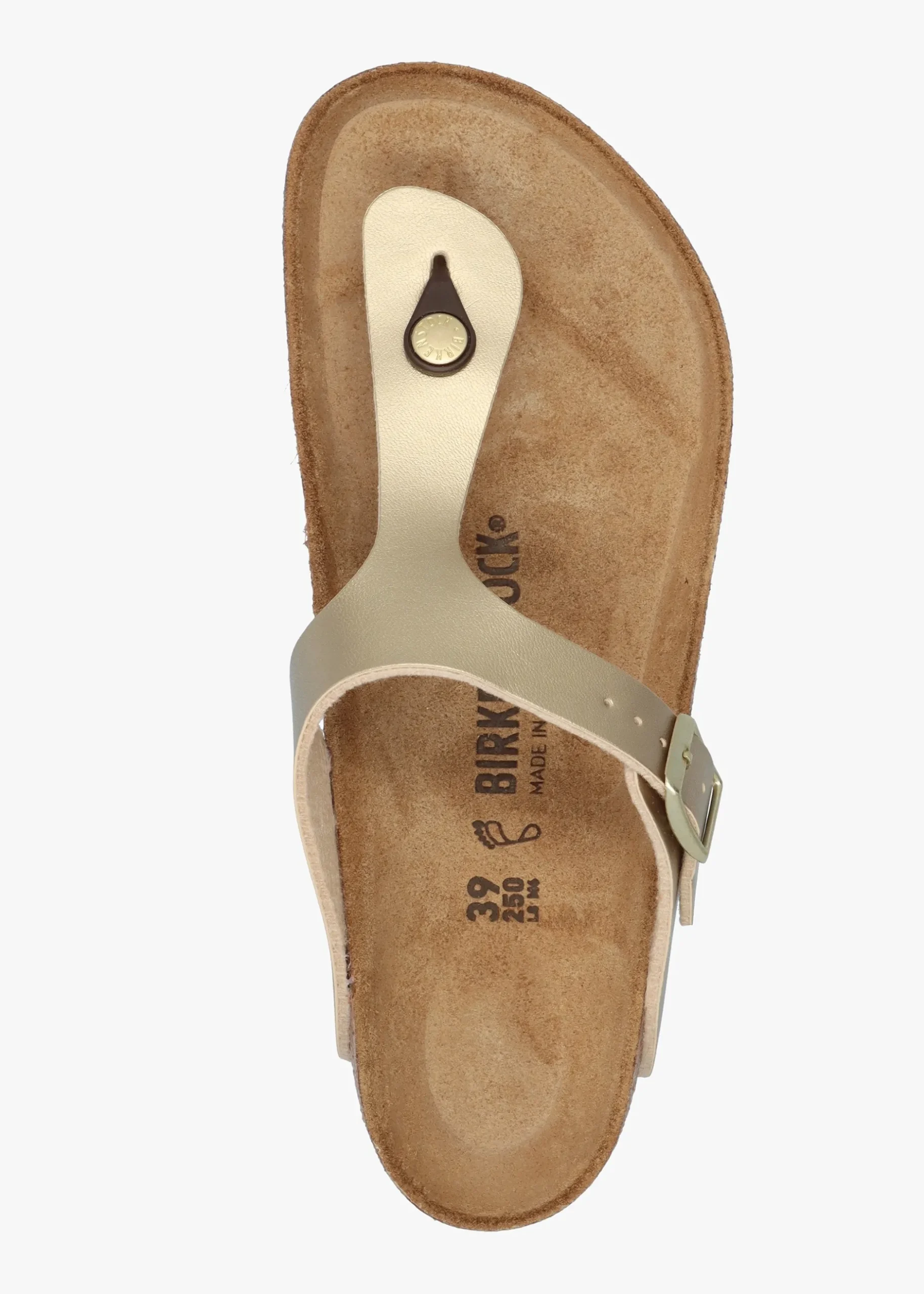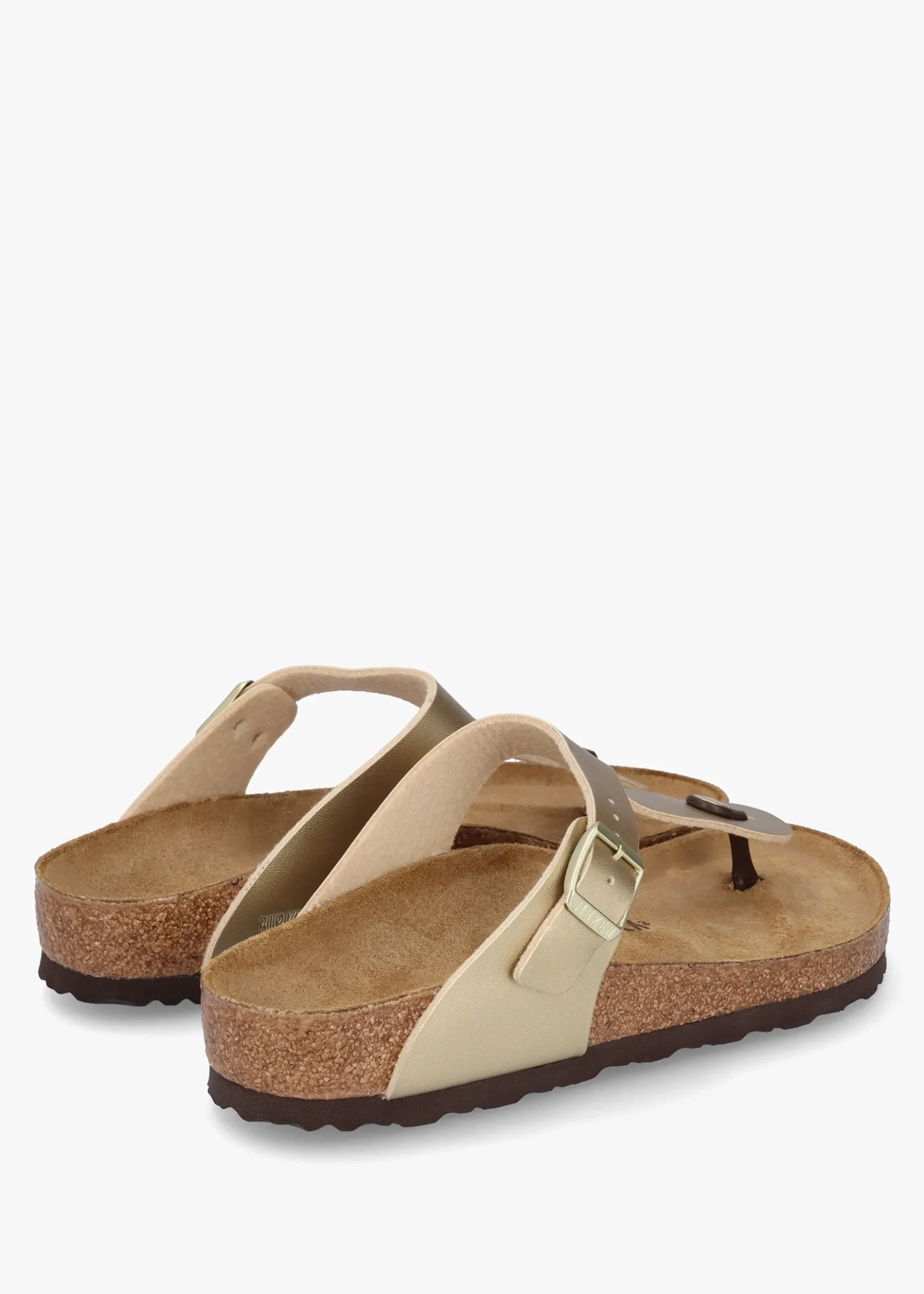 Another classic style from Birkenstock- updated in gold for the New Season. The women’s ‘Gizeh’ is a toe post style finished with the statement ‘Birkenstock’ branded buckle and hardware to the toe. Crafted from Birko-Flor® featuring a cork foot-bed that has been contoured to conform to the shape of your foot with arch support and an extra layer of cushioning for optimum comfort. Signature Birkenstock branding is seen throughout.