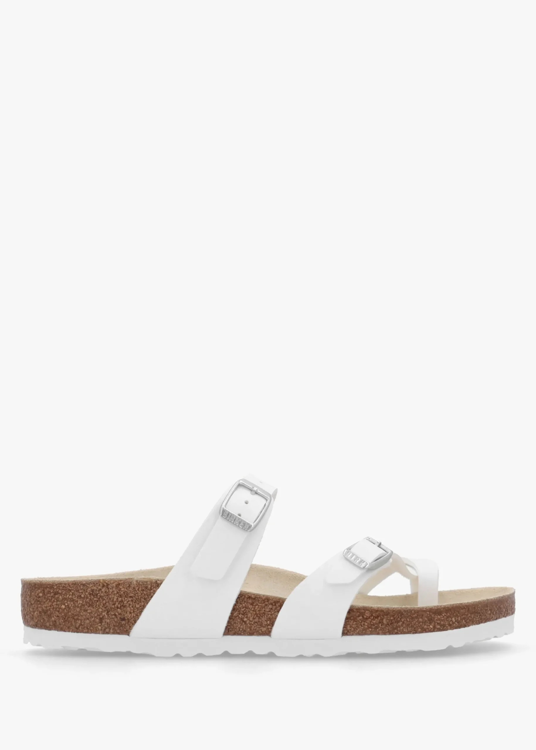 The Birkenstock ‘Mayari’ thong sandals stand out with their flowing look, bringing together design and comfort. These New Season sandals featured here in white are a wardrobe staple. The upper is crafted from the skin-friendly, hard-wearing synthetic material Birko-Flor. An easy to wear slip on style featuring double buckle fastening. Signature Birkenstock branding is seen throughout.