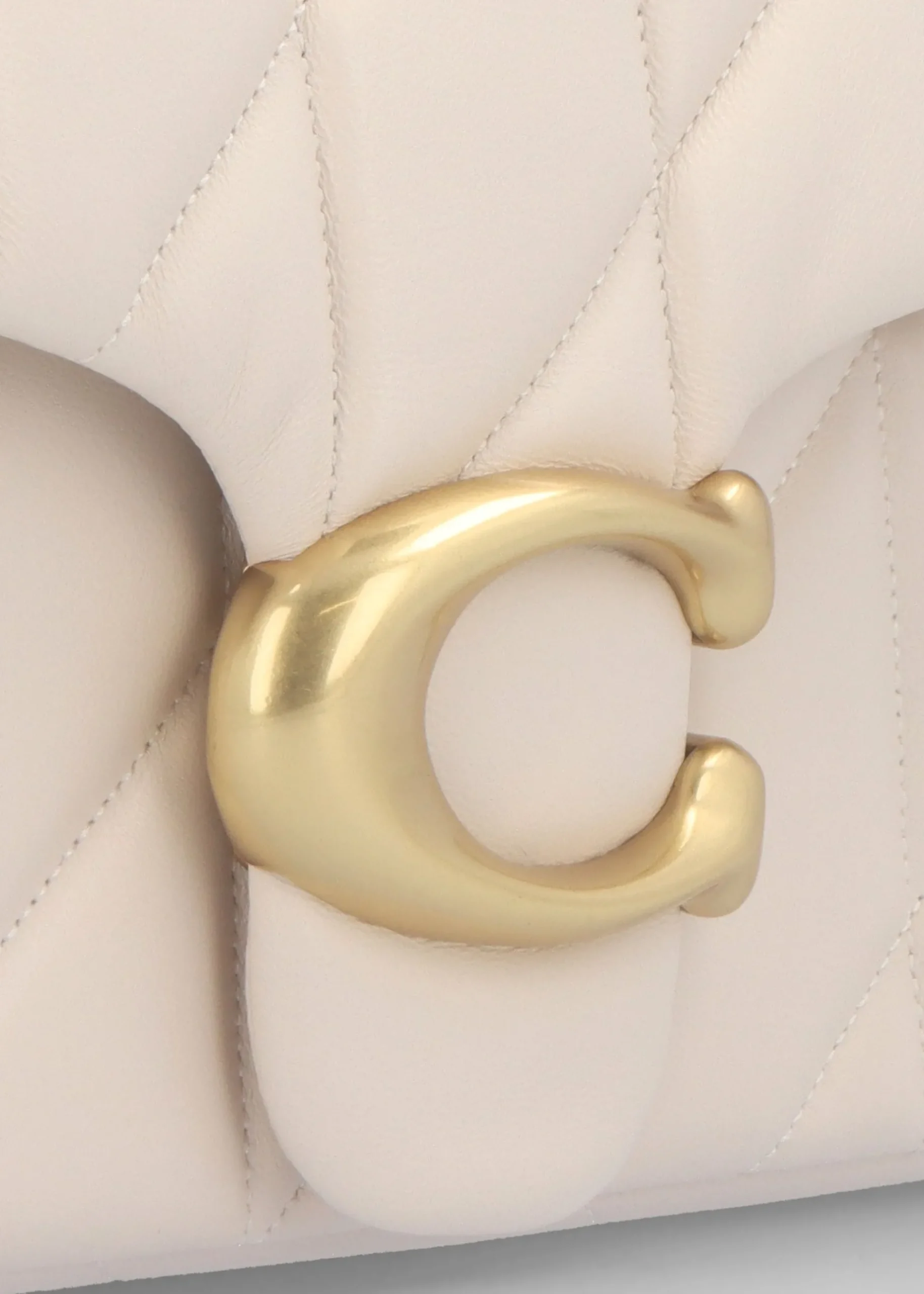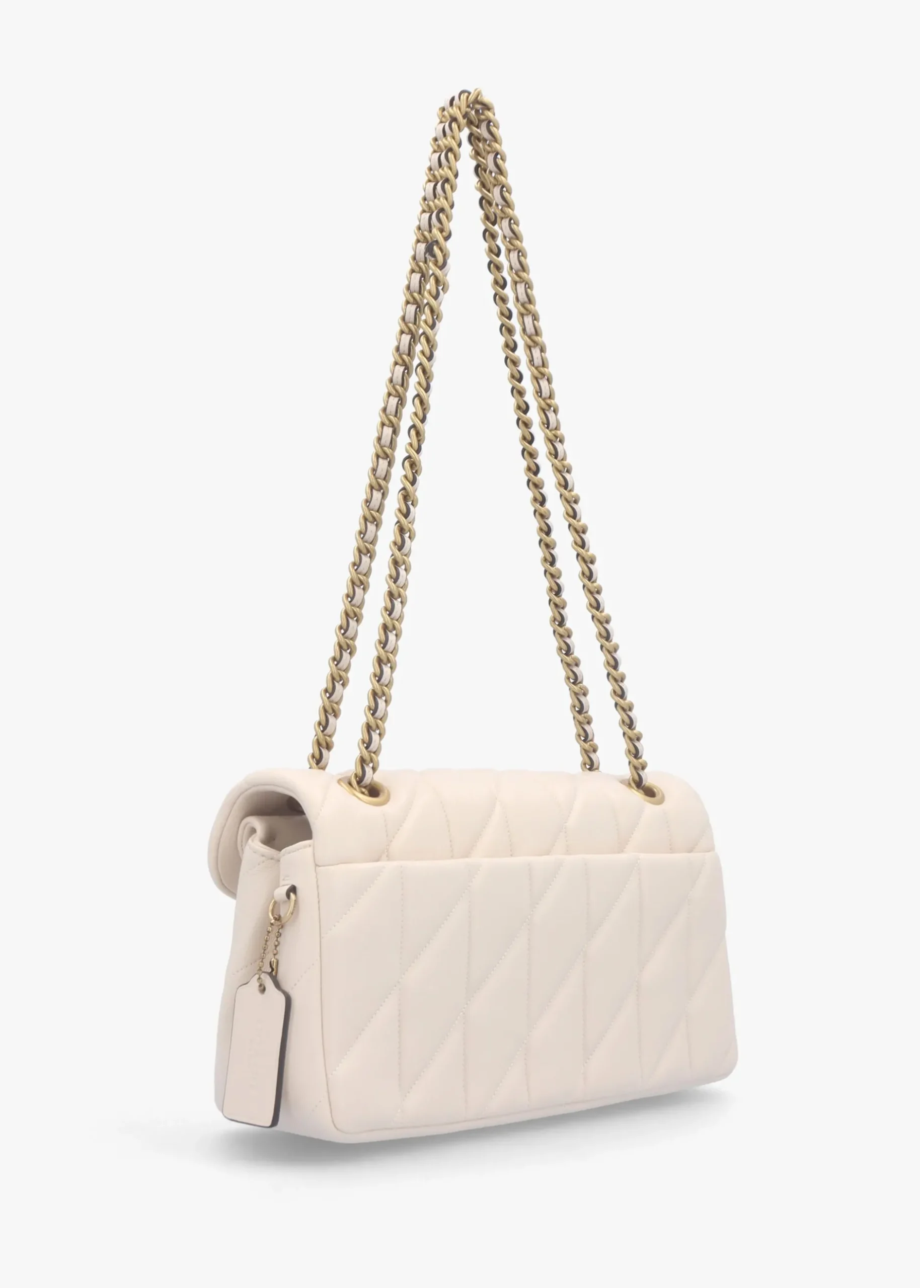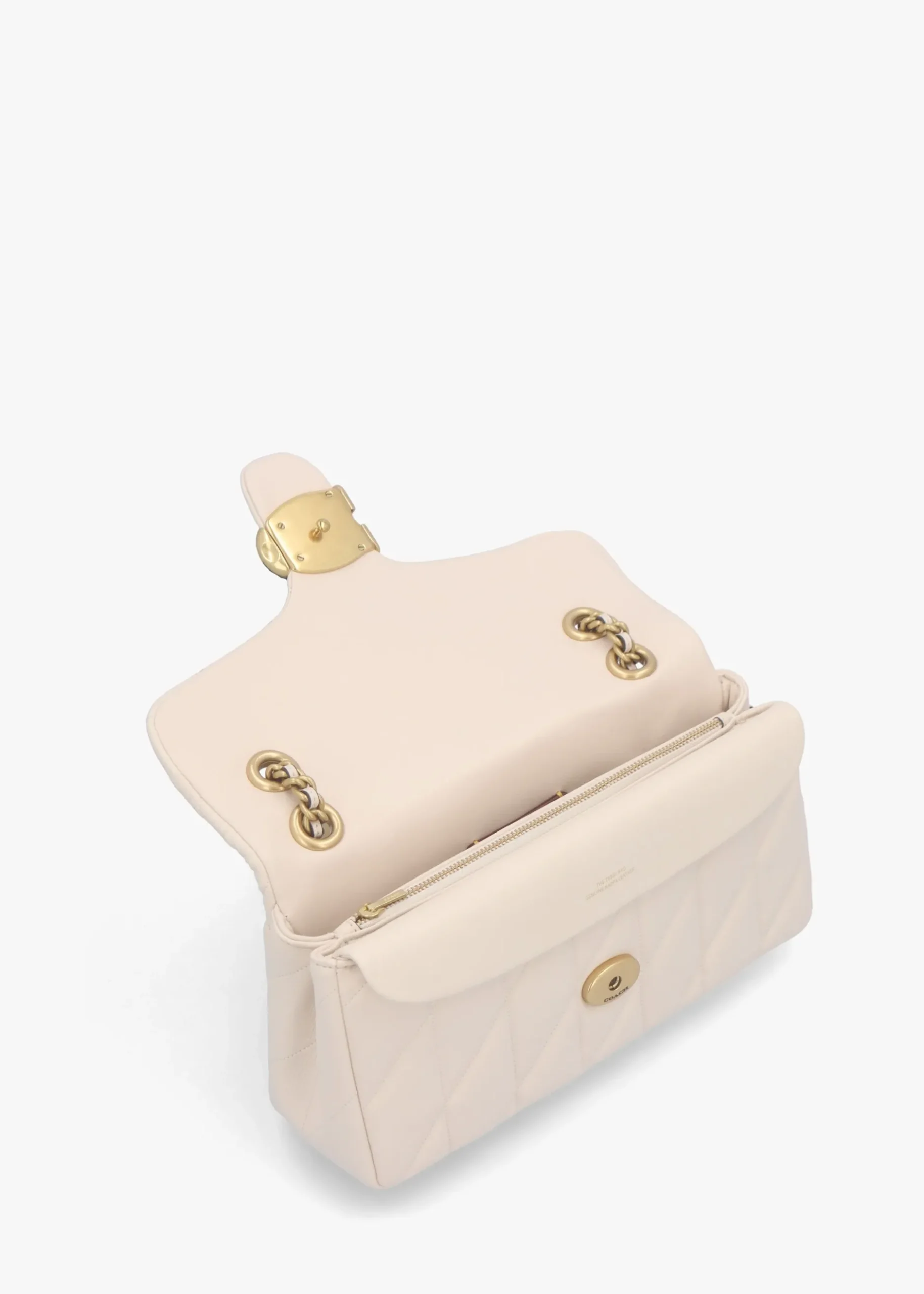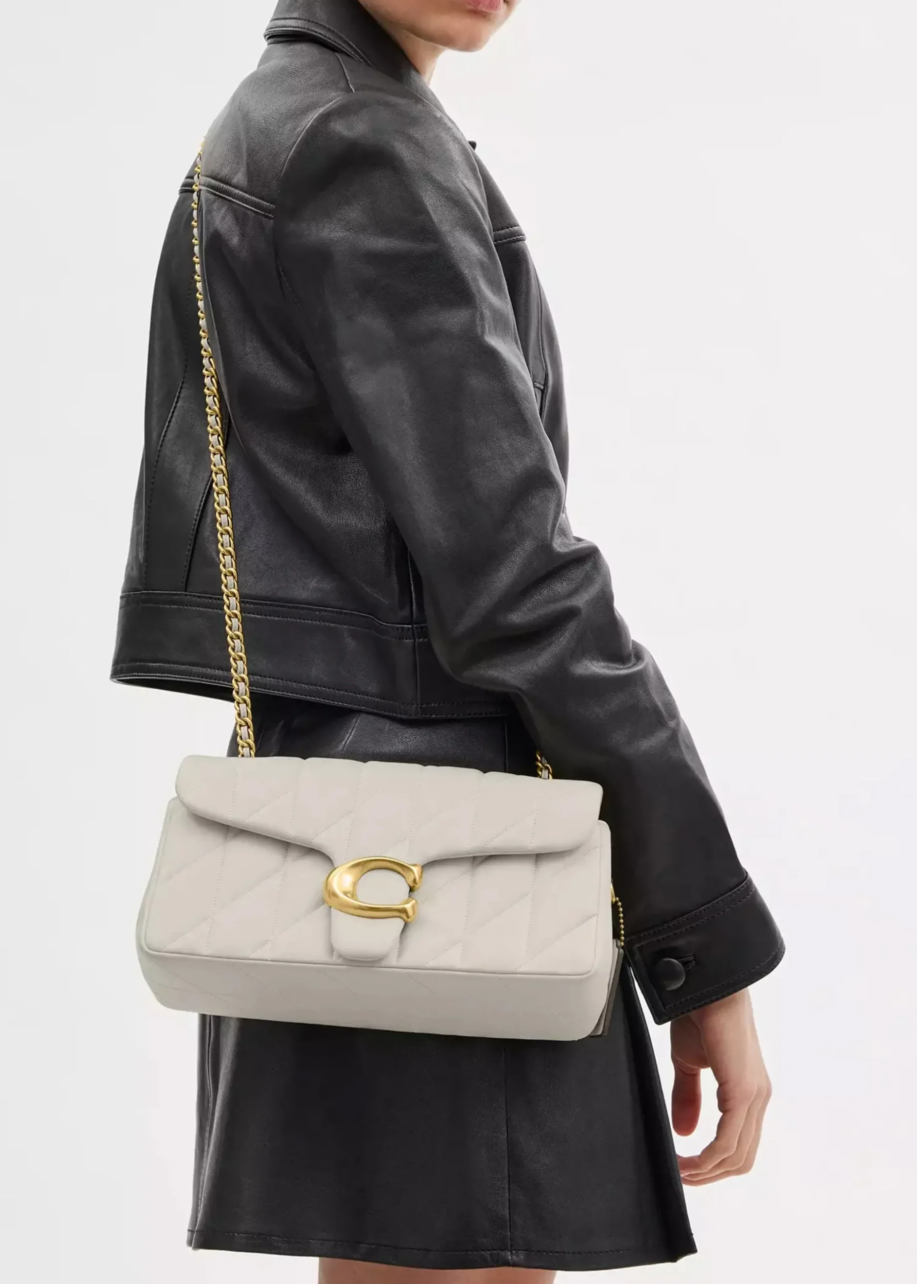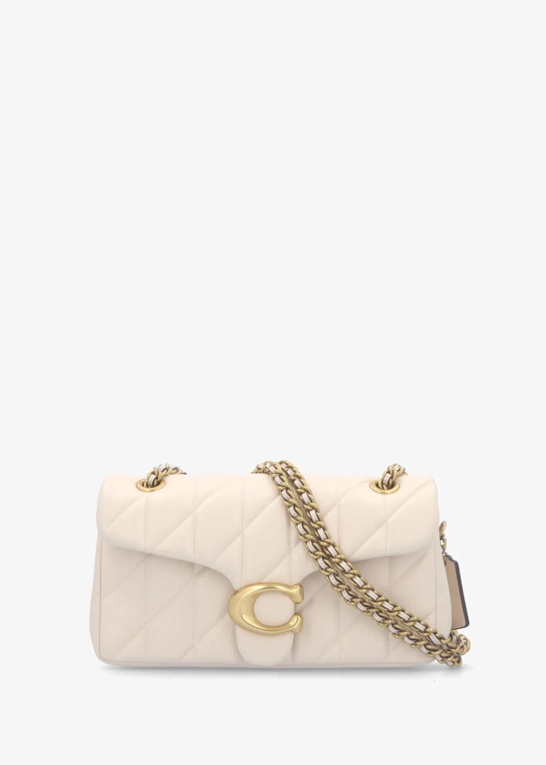 The New Season ‘Tabby Quilted 26’ shoulder bag from COACH is a modern take on an archival 1970s design. This classic shoulder bag is crafted from quilted soft nappa leather with antique gold tone hardware. Push lock front flap fastening reveals three compartments, exterior slot pocket also features. The leather and curb chain strap can be worn cross the body or double up for a shorter shoulder style. Classic ‘C’ logo adds detail. Signature COACH branding is seen throughout.
