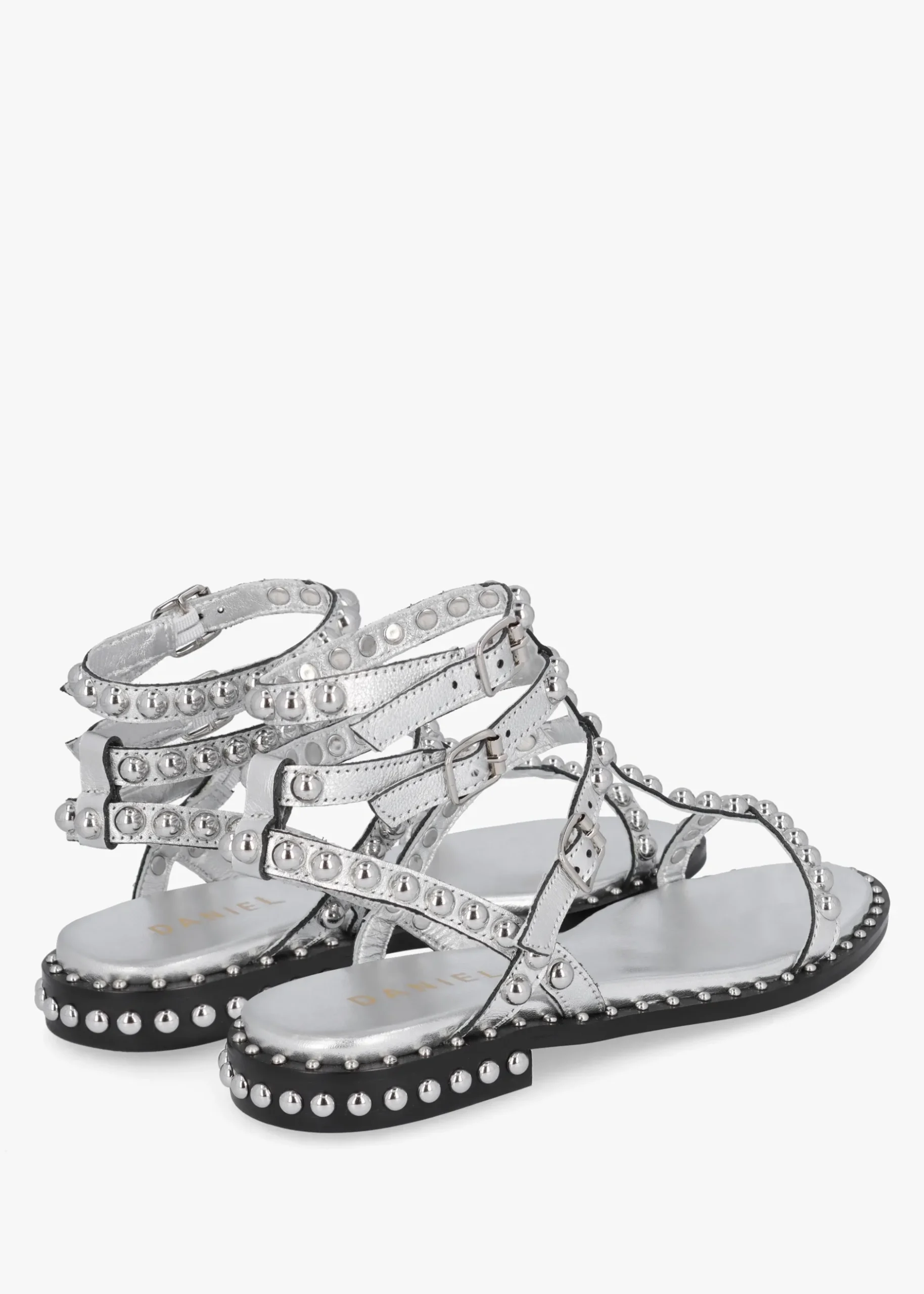 The ‘Eternal’ gladiator sandals are part of the New Season collection from Daniel Footwear. This everyday style is crafted from premium leather with luxurious leather lining. Triple buckle fastening adds detail, creates an easy wear as well as ensuring the perfect fit. Edgy studded embellishment features to the upper and sole. Signature Daniel branding is seen to the foot-bed.