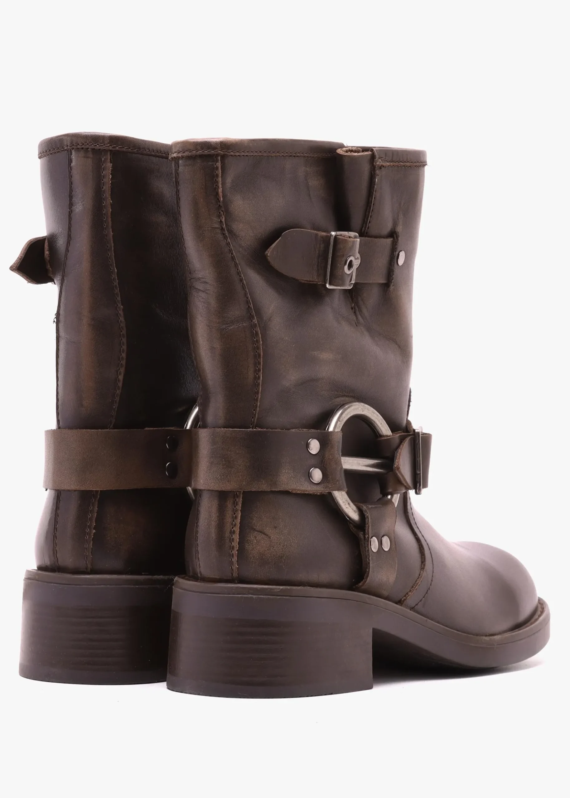 Add the chunky ‘Ibike’ biker style ankle boots from Daneil Footwear to your boot collection. This New Season style is crafted from premium leather featuring a distressed look finish with textile lining and a rubber sole. An easy to wear pull on style. Statement buckle fastening straps add detail. The round toe and low heel make up the silhouette. Signature Daniel branding is seen to the foot-bed.