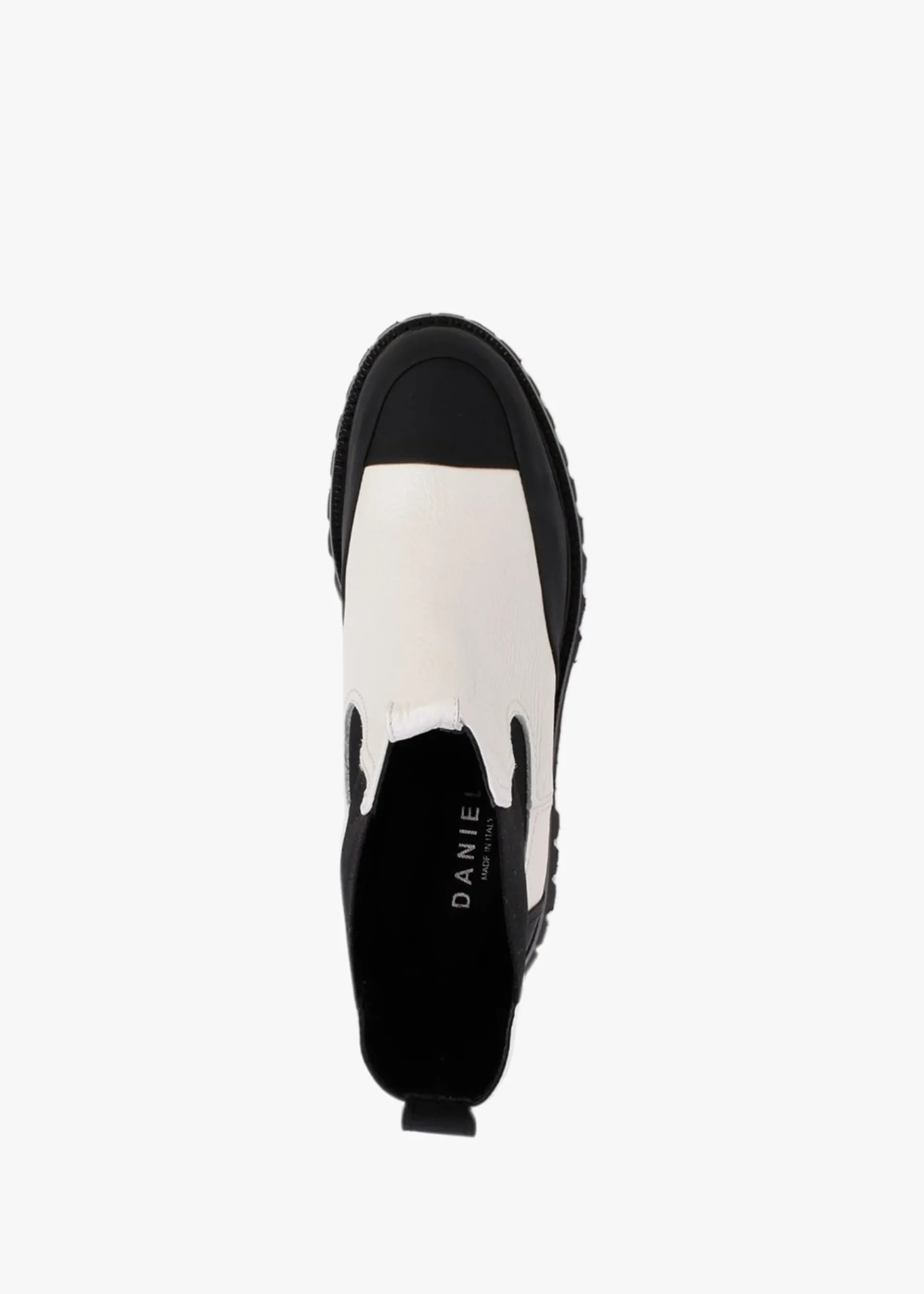 Add the ‘Nellie’ Chelsea boots from Daniel Footwear to your boot collection. This modern version of a timeless classic style will see you through Season after Season. Crafted from premium leather with part leather lining and a comfy cleated rubber sole. An easy to wear pull on boot featuring pull tabs to the top-line and elasticated inserts. Contrasting rubber toe cap and heel counter adds detail as well as tonal top stitching and raised seaming. Signature Daniel branding is seen to the foot-bed.