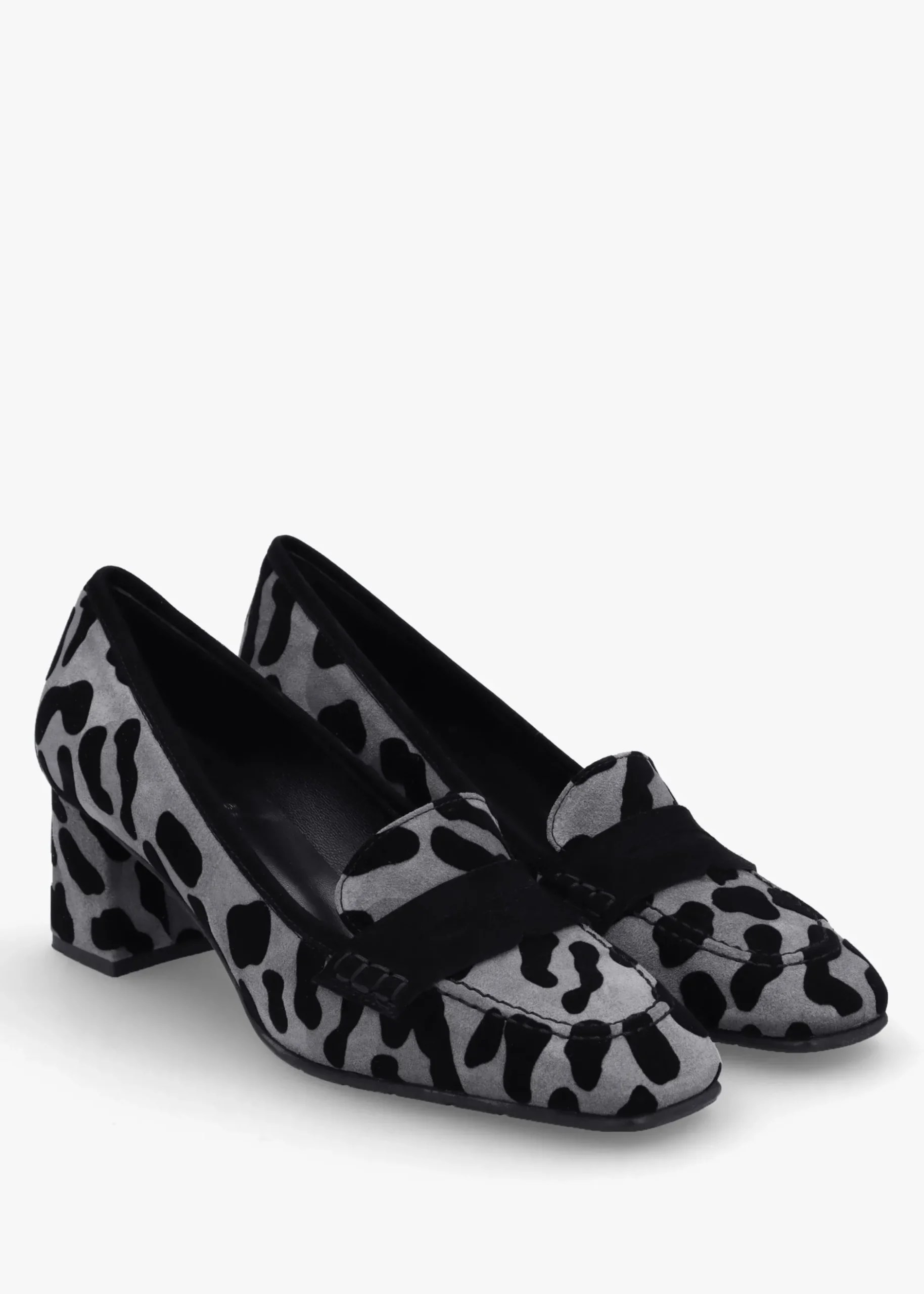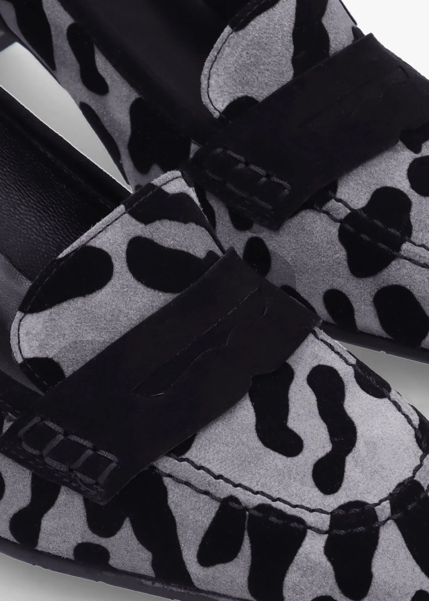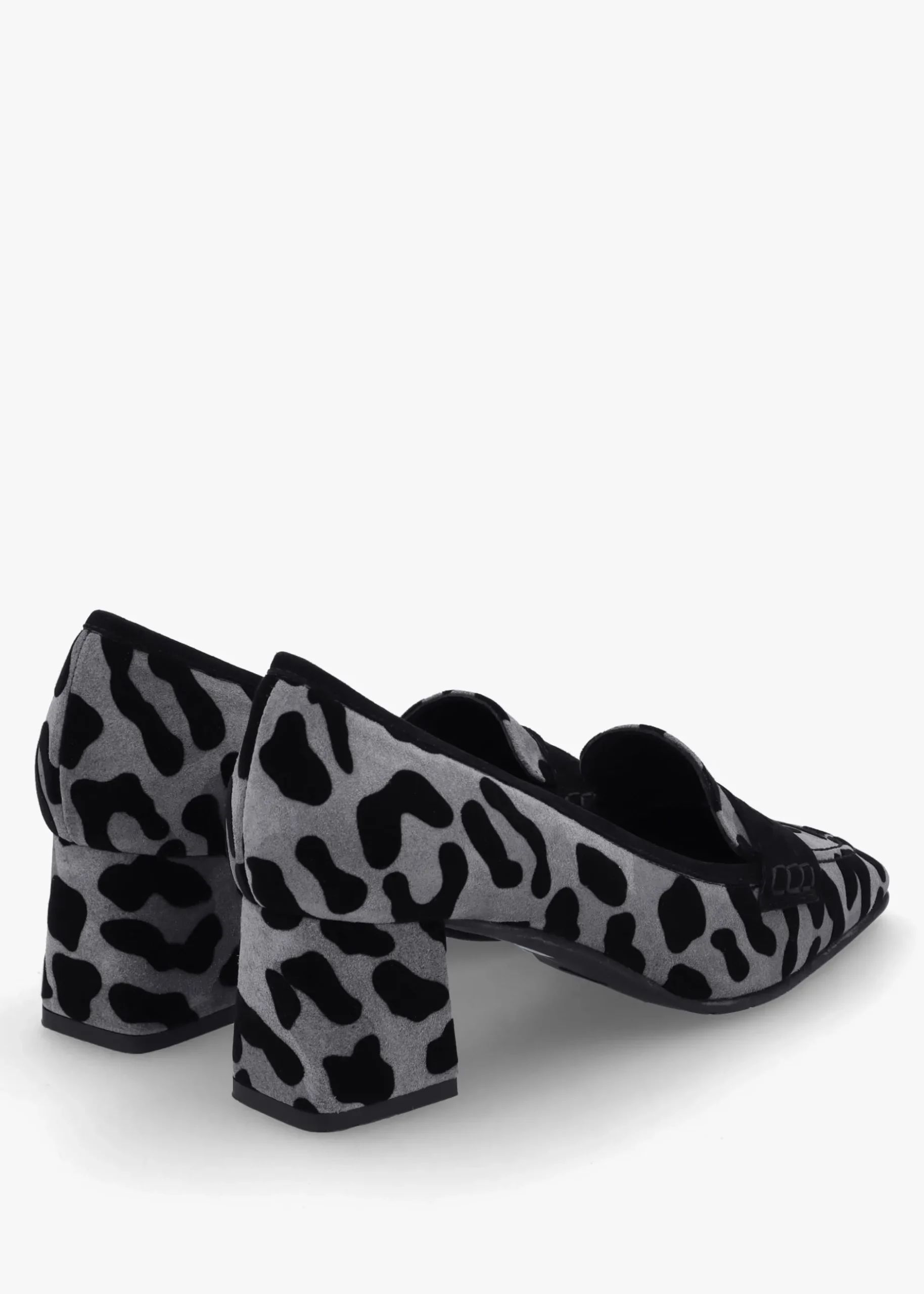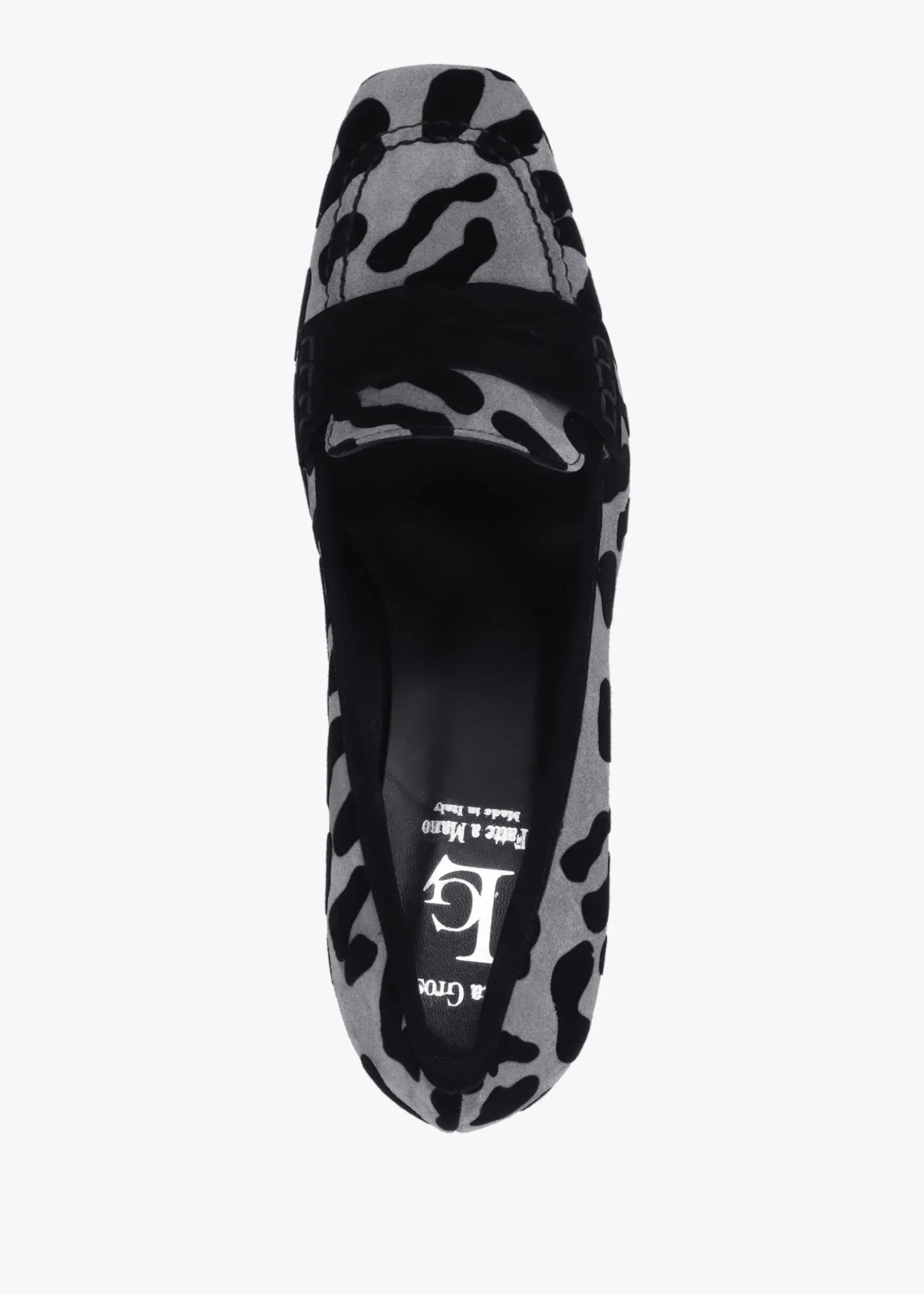 Add these block heel statement loafers from Luca Grossi to your New Season wardrobe. Crafted from a premium suede upper in a raised leopard print design with luxurious leather lining and a rubber sole. An easy to wear slip on style. The square toe and mid-block heel make up the silhouette. Signature Luca Grossi branding is seen to the footbed.