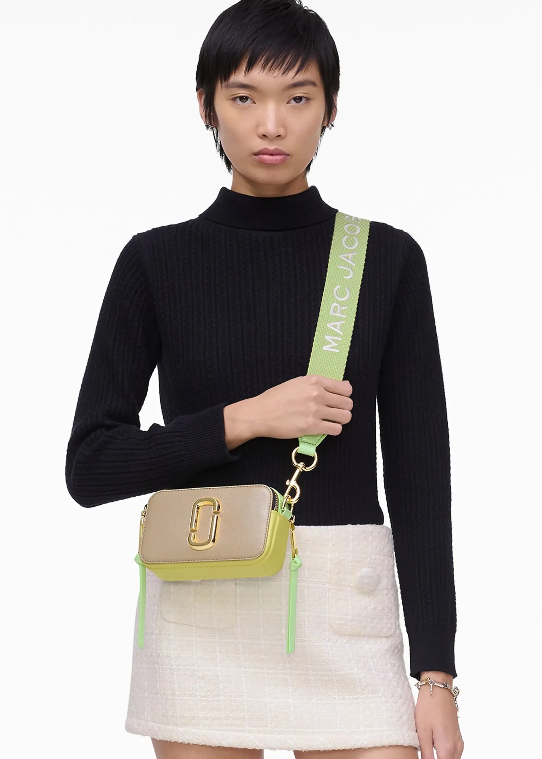 Marc Jacobs ‘The Snapshot’ colour block camera bag is the must have bag of the Season, crafted from cross grain leather and accented with shiny golden hardware. The secure double zip fastening compartments are ideal for carrying all your daily essentials, exterior slot pocket also features. A chunky woven logo crossbody strap is the defining detail as well as Marc Jacobs double ‘J’ branding, further branding is seen throughout.