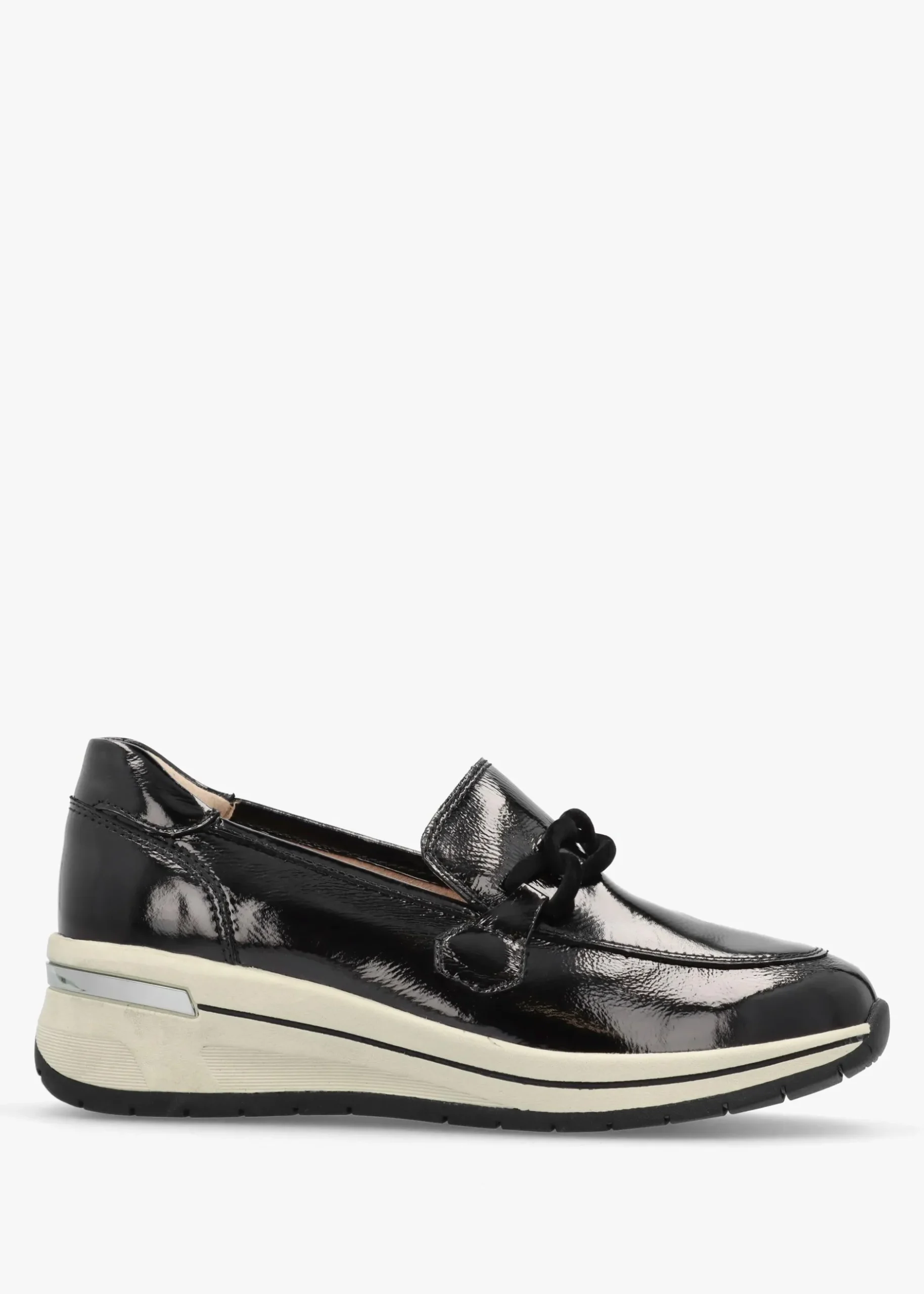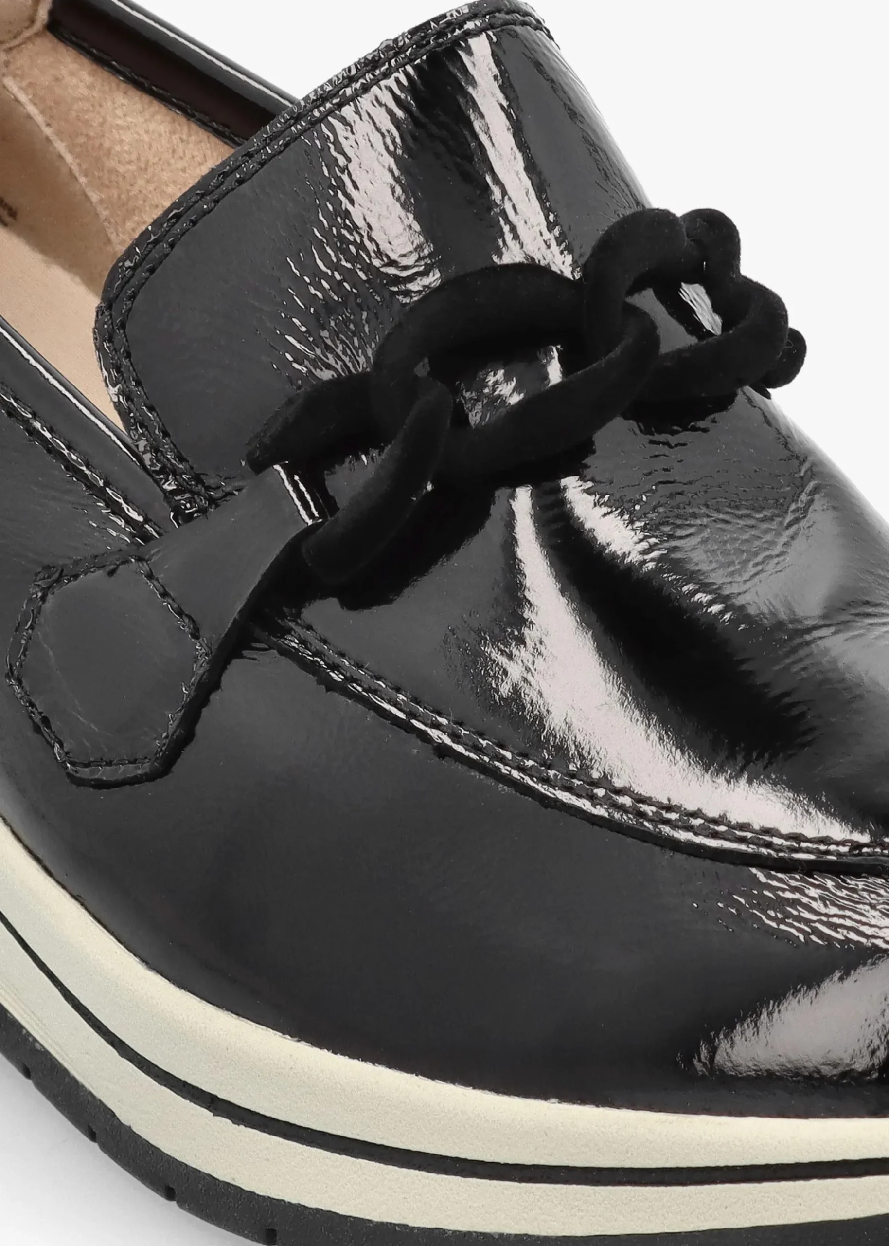Add these sporty loafers from Caprice to your New Season wardrobe. Crafted from a premium patent leather upper with microfiber lining and a decorative chunky rubber sole. An easy to wear slip on style featuring flocked chain link detail to the upper. Signature Caprice branding is seen to the footbed and sole.
