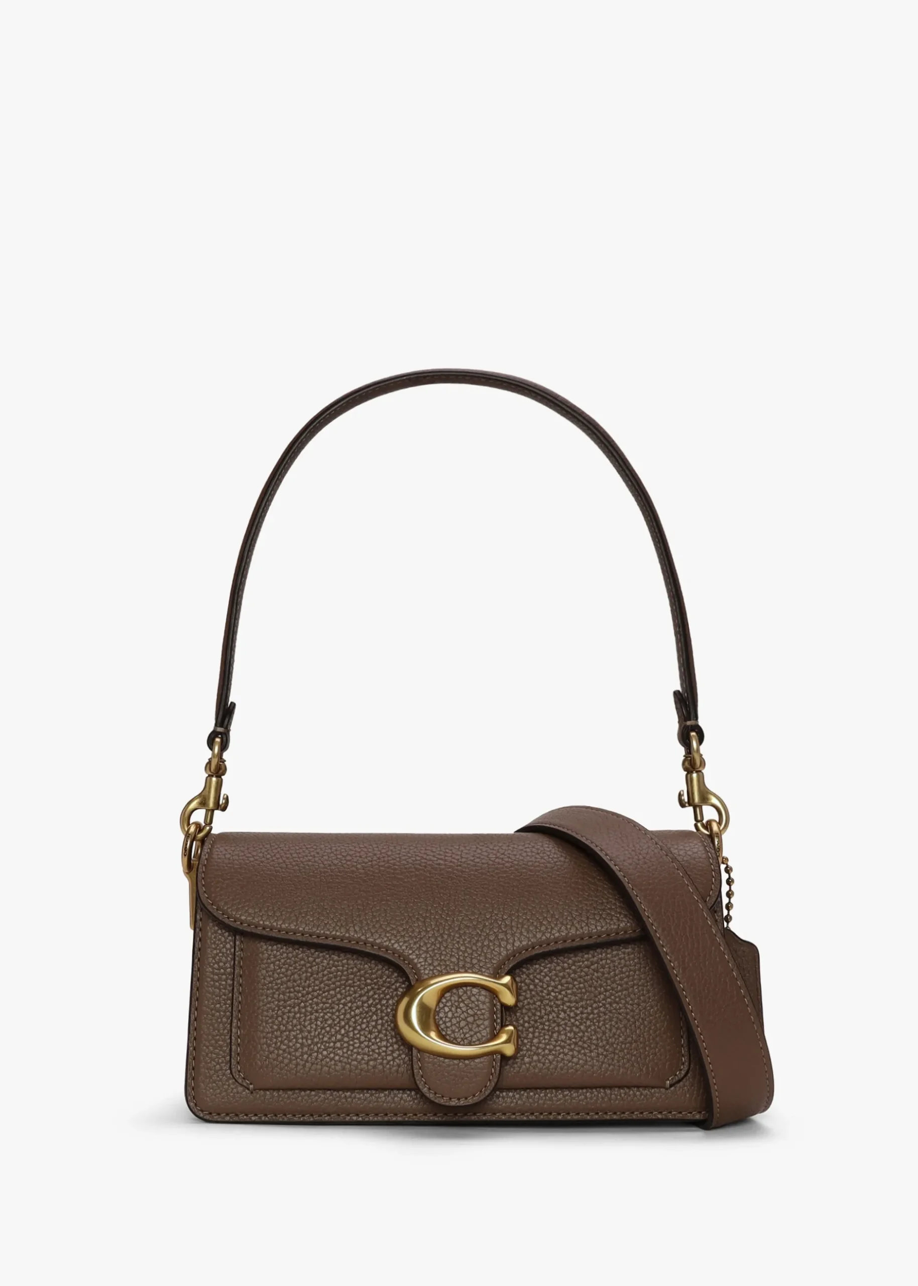 The ‘Tabby 20’ shoulder bag is a modern take on an archival 1970s COACH style. This everyday classic bag will see you through Season after Season. Crafted from premium polished pebbled leather with antique gold tone accents. The secure magnetic snap front flap reveals multiple handy inner compartments, further handy exterior slot pocket also features. Carry by either of the detachable straps. Classic ‘C’ logo motif adds detail as well as luggage tag style bag charm. Signature COACH branding is seen throughout.