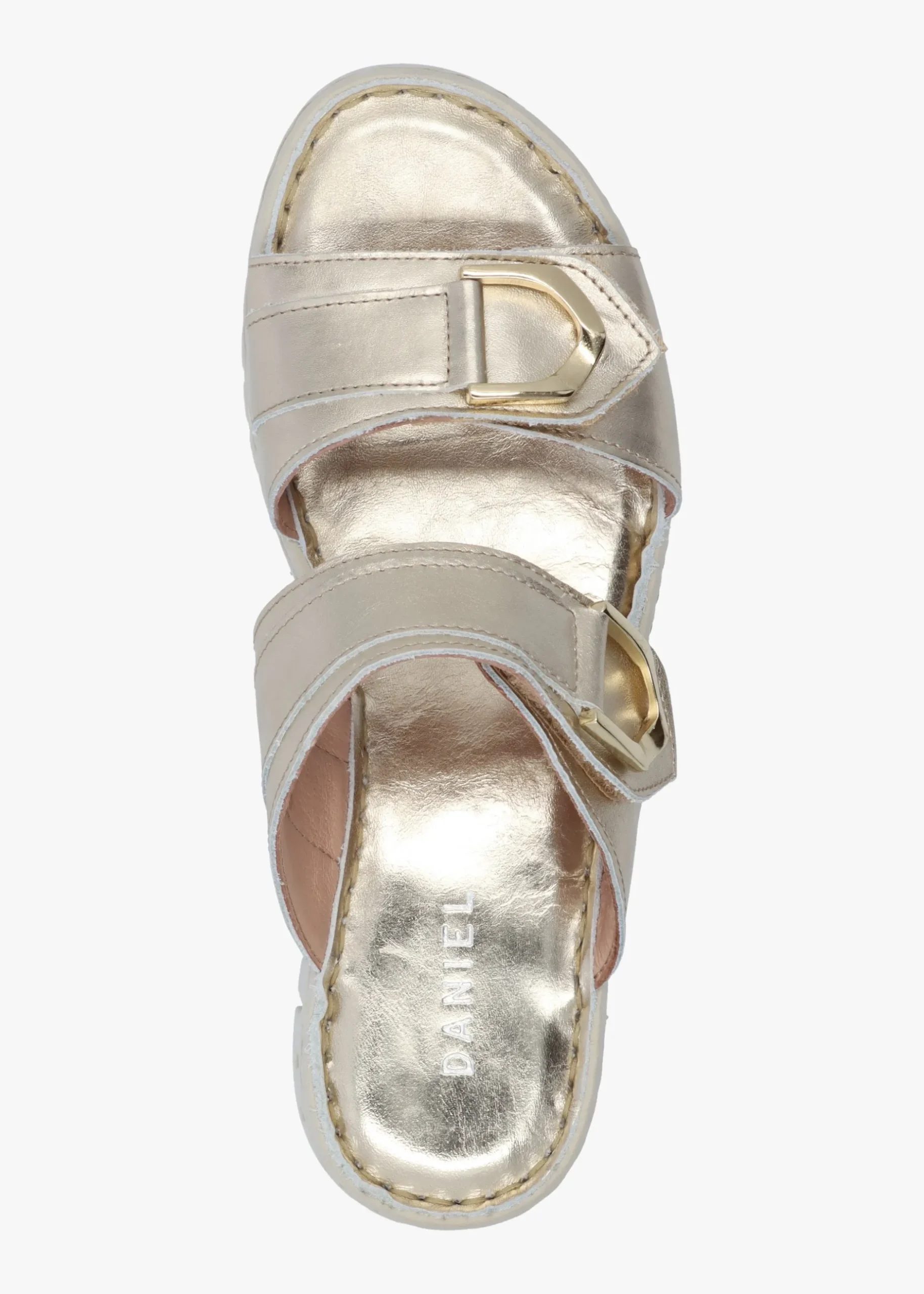 The ‘Lorelai’ flat mules are part of the New Season collection from Daniel Footwear. This essential Summer style is crafted from a premium leather upper with leather lining and a ribbed rubber sole. An easy to wear slip on two bar style featuring velcro fastening. Gold tone hardware adds detail. Signature Daniel branding is seen to the foot-bed.