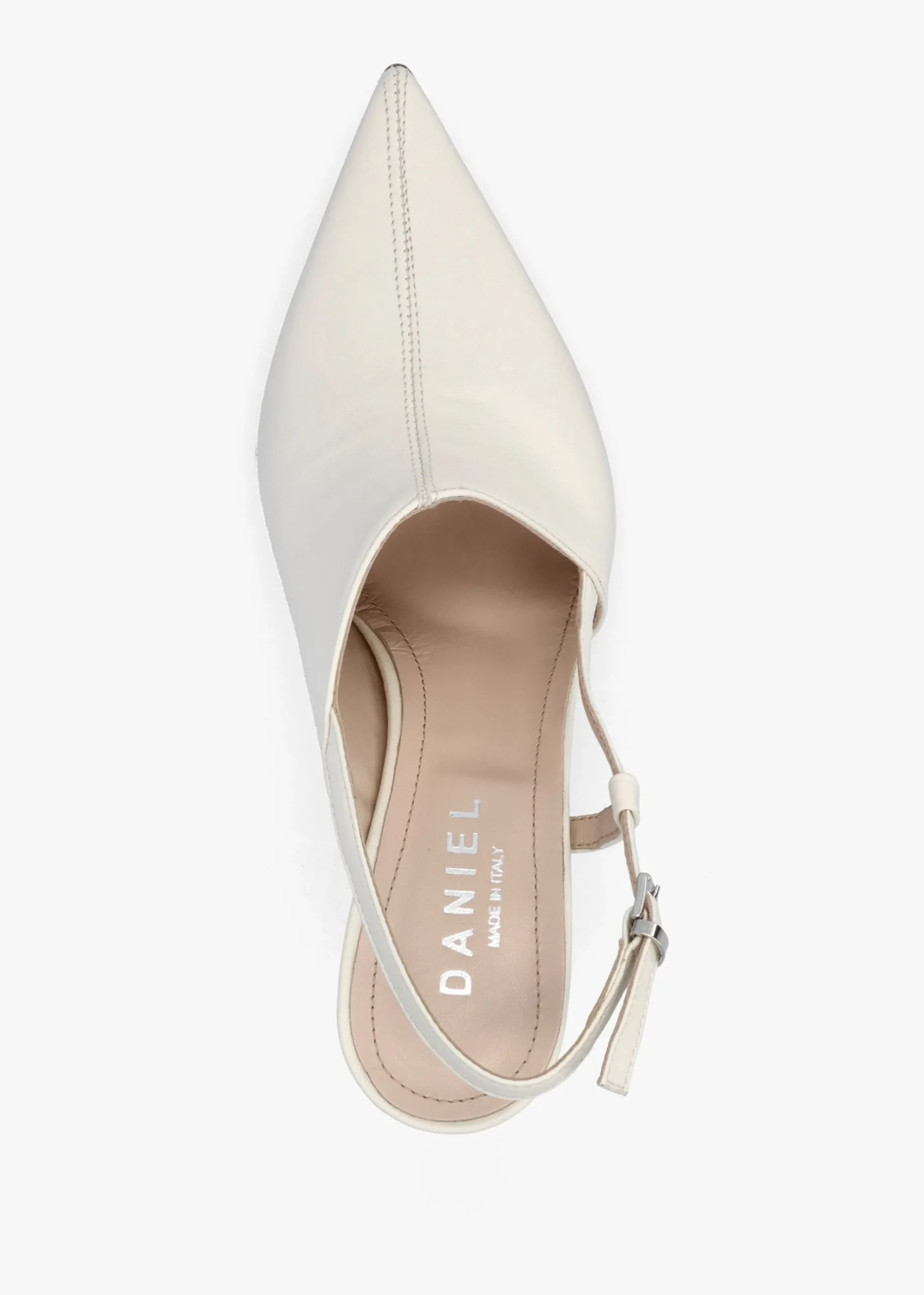 The ‘Nammy’ sling back court shoes are part of the New Season collection from Daniel. Crafted from a premium leather upper with luxurious leather lining, cushioned footbed and a part leather sole. An easy to wear slip on style featuring buckle fastening sling back. The classic pointed toe and mid heel make up the silhouette. Asymmetric topline wraps around the foot. Signature Daniel branding is seen to the footbed.