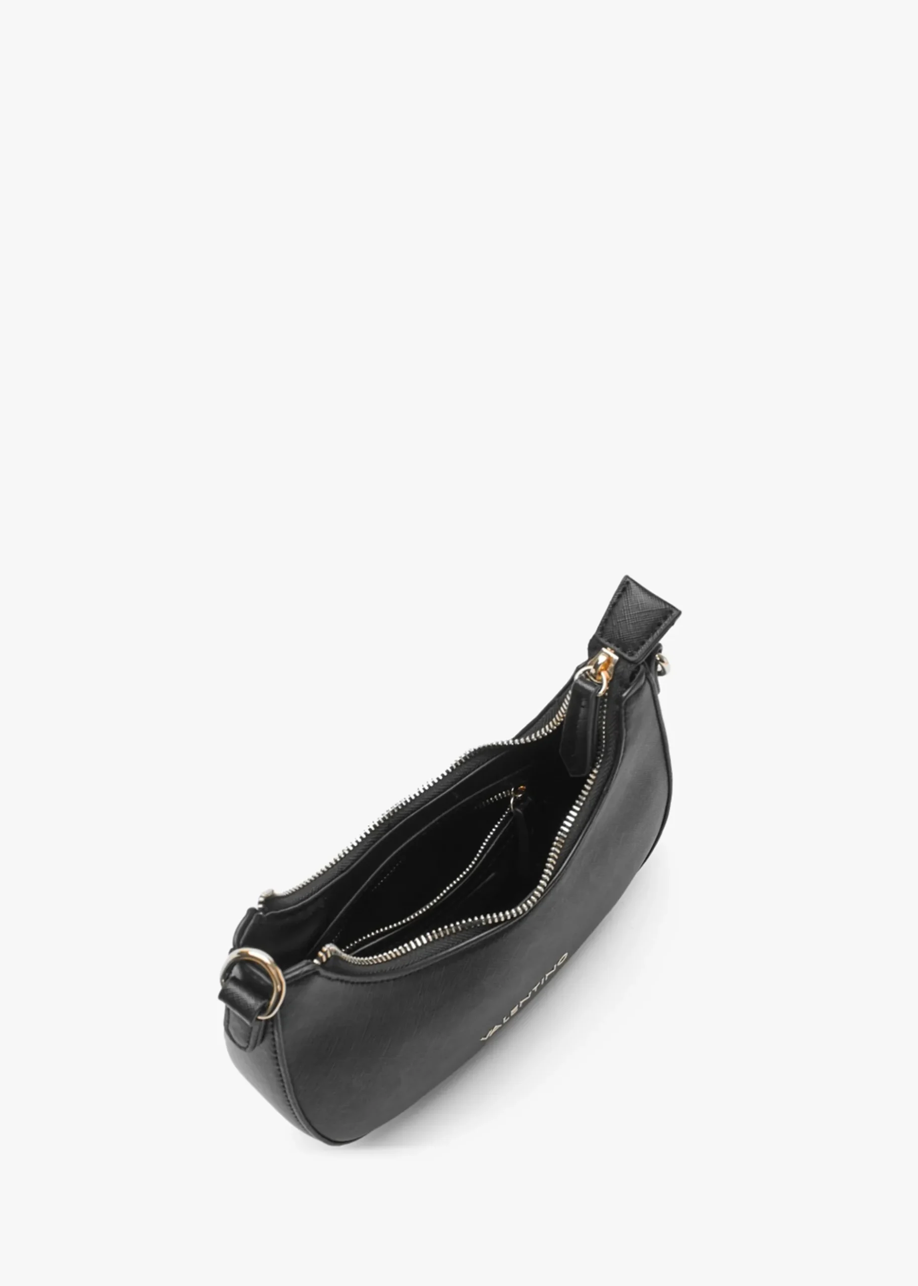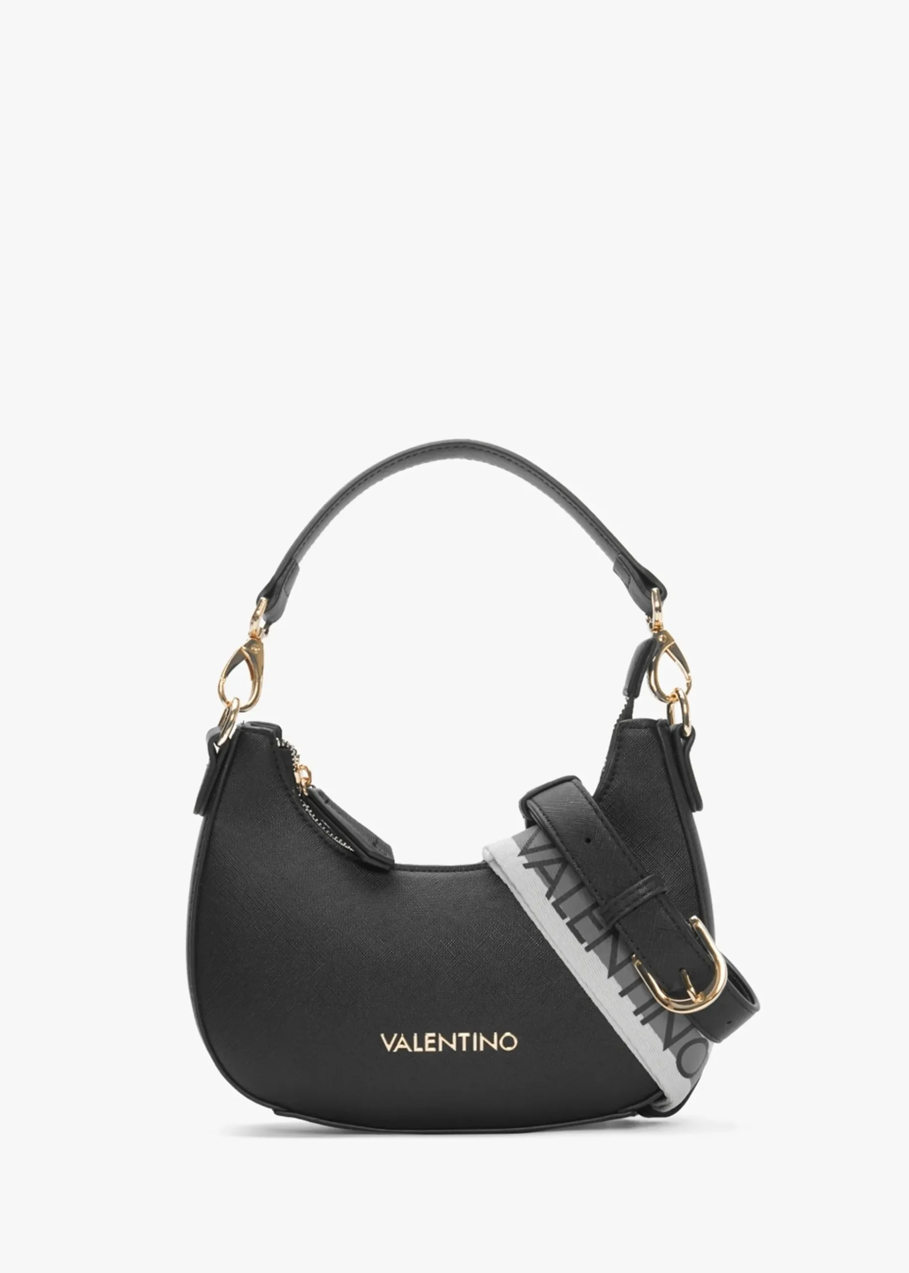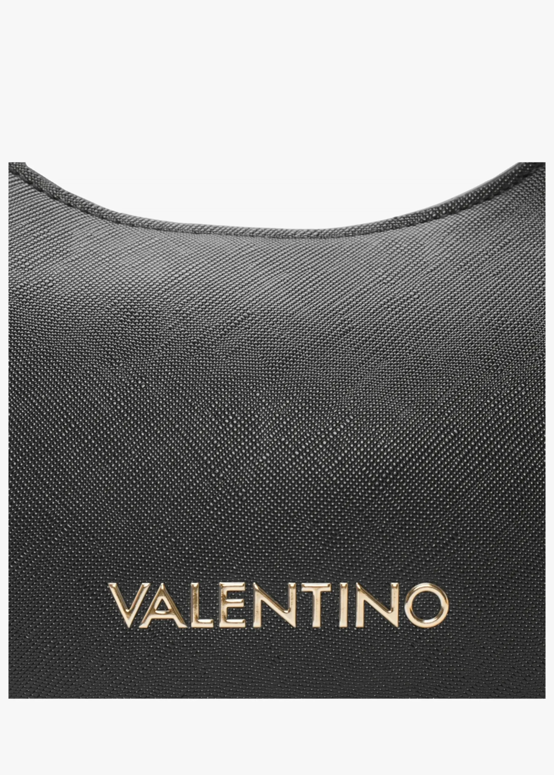 The ‘Zero’ hobo bag is part of the New Season eco-friendly collection from Valentino Bags. Crafted from premium textured PU made from part recycled materials with polished gold tone hardware. The secure top zip fastening reveals the main compartment with handy inner zip and slot pockets. Carry by either of the detachable straps. Signature Valentino Bags branding is seen throughout.