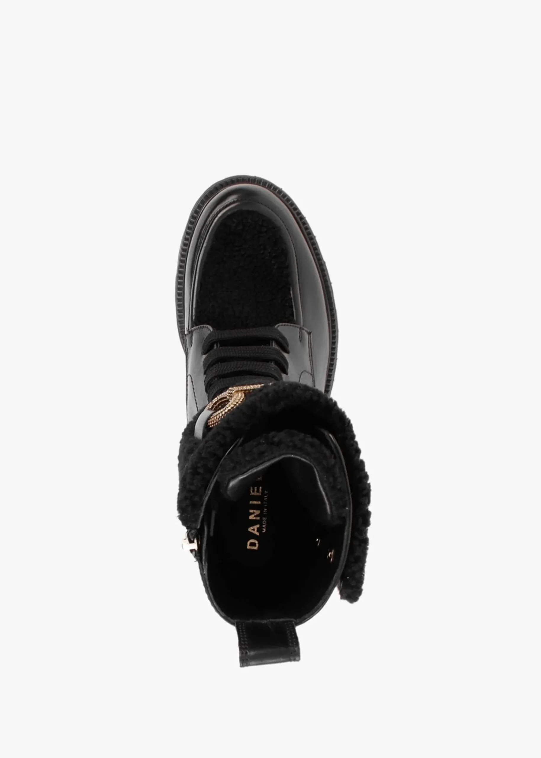The ‘Evashearl’ ankle boots are part of the New Season collection from Daniel Footwear. This Winter style is crafted from a premium leather and faux shearling upper with luxurious leather lining and a tracked rubber sole. Zip fastening to the inner leg creates an easy wear and the lace up upper ensures the perfect fit. Pull tab to the top-line, horsebit hardware add detail as well as tonal top stitching and raised seaming. Signature Daniel branding is seen to the foot-bed.