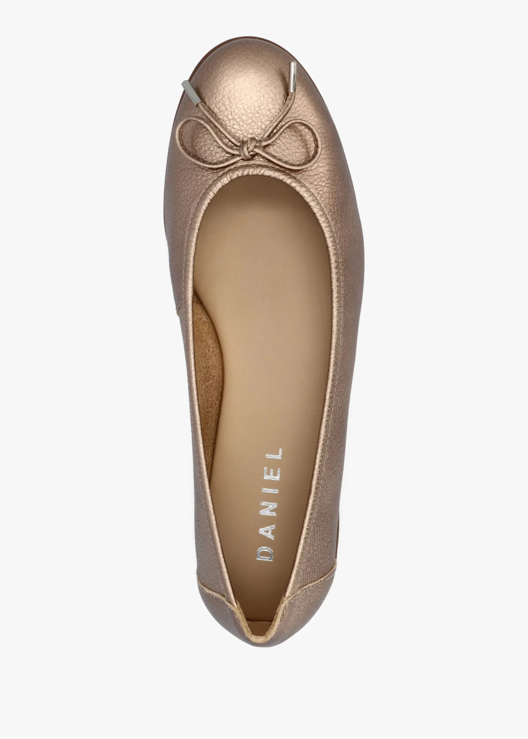The ballet pump is a classic style and wardrobe staple. The ‘Gambi’ are the perfect example and part of the New Season collection from Daniel. This timeless style is crafted from a premium tumbled leather upper with luxurious leather lining, cushioned footbed for added comfort and a rubber sole. An easy to wear slip on style. Feminine bow with hardware trim adds detail to the upper. Signature Daniel branding is seen to the footbed.