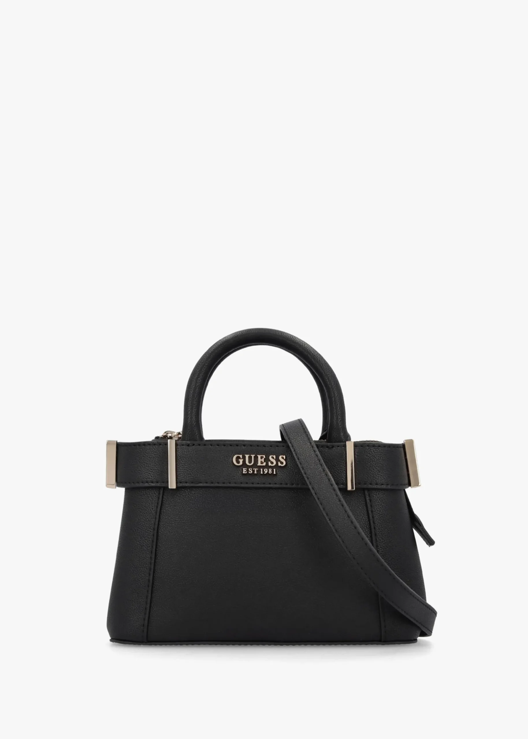 The ‘Anadela Mini’ satchel bag from GUESS is a versatile style that will take you from day to dark with ease. This New Season satchel is crafted from premium textured PU with polished gold tone accents. The secure top zip fastening reveals logo lining, dual compartments as well as handy inner zip and card slot pockets. Carry by the grab handles or the detachable crossbody strap. Signature GUESS branding is seen throughout.