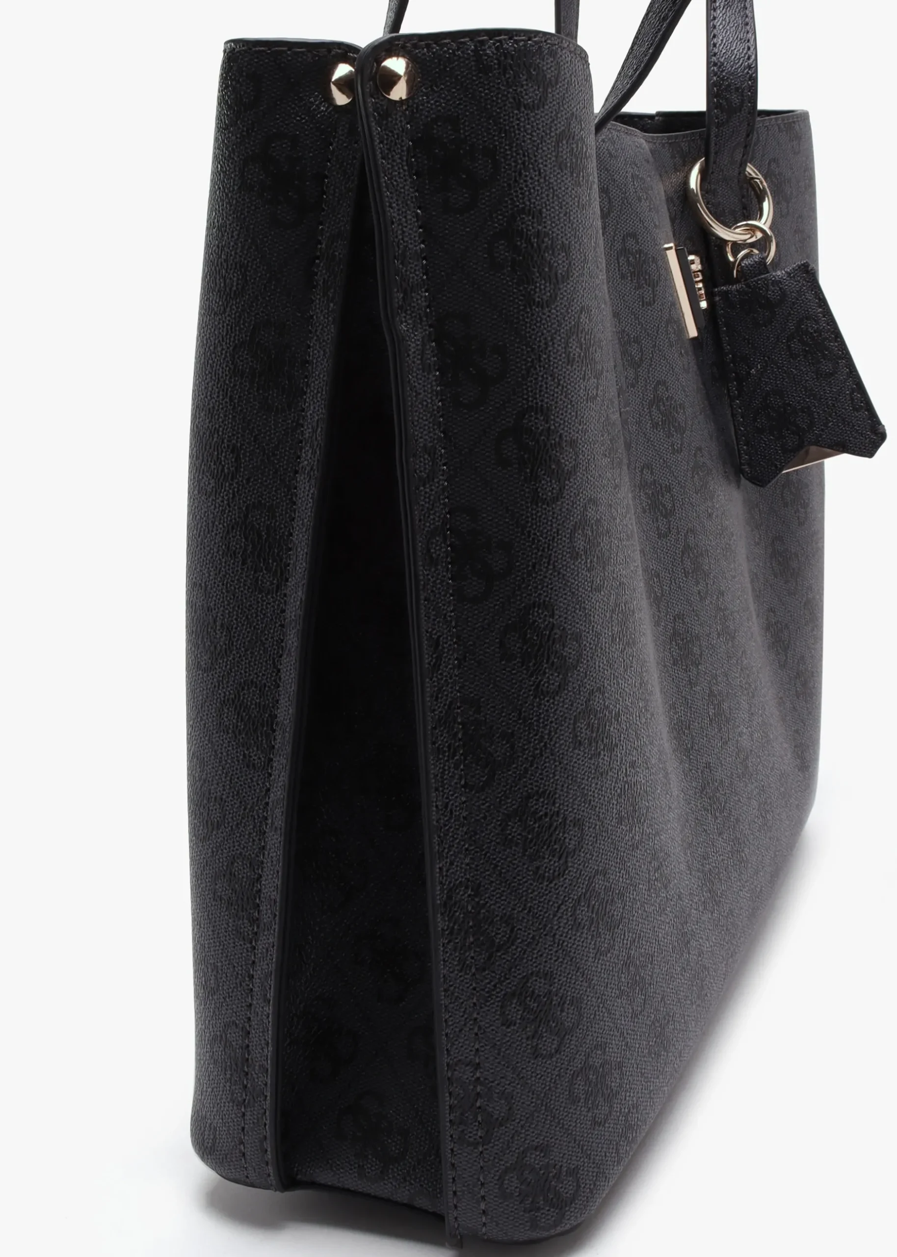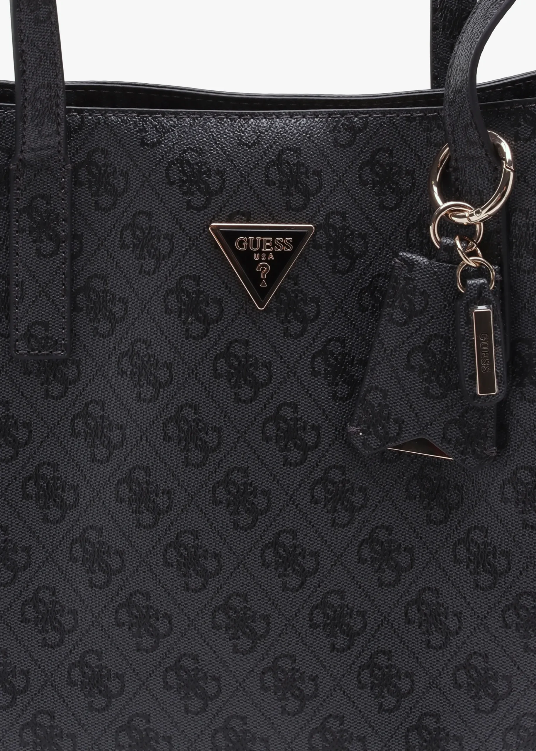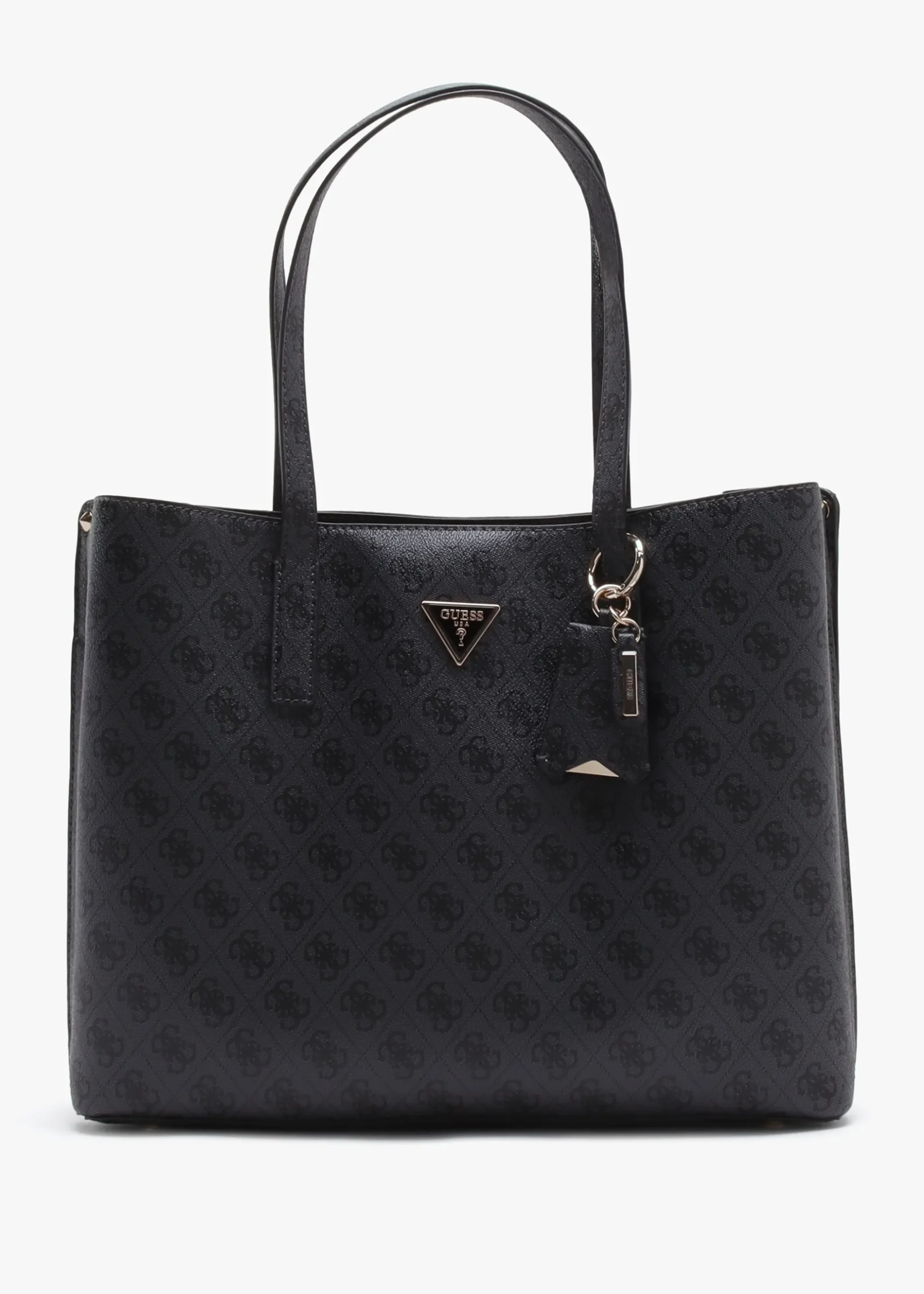 Add the ‘Meridian Girlfriend’ tote bag from GUESS to your tote bag collection. This spacious everyday style is crafted from premium pebbled PU with polished gold tone hardware. The secure top zip fastening reveals logo lining and handy inner zip and slot pockets. Carry by the top handles or the shoulder or by hand. Classic triangle logo motif adds detail as well as luggage tag bag charm. Signature GUESS branding is seen throughout.