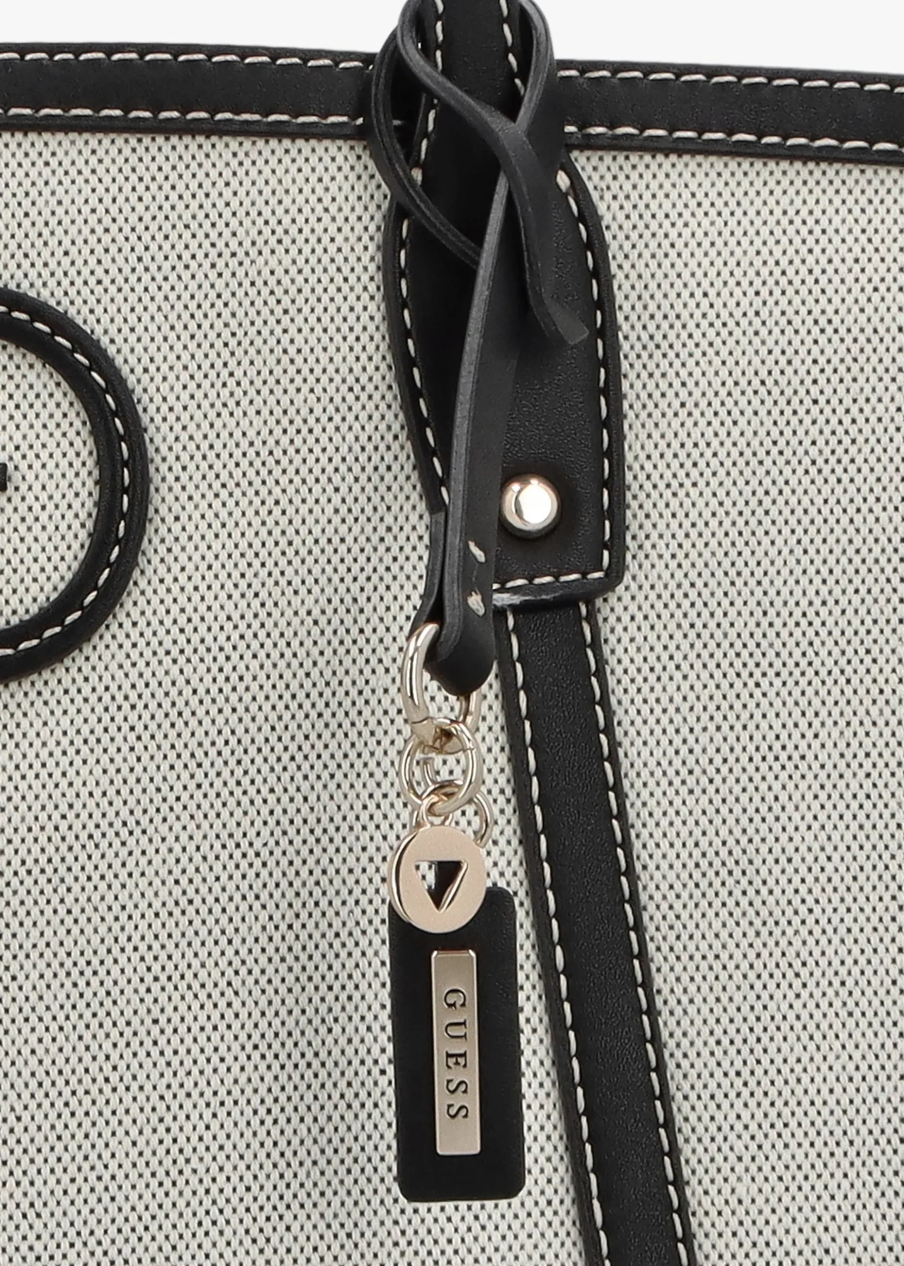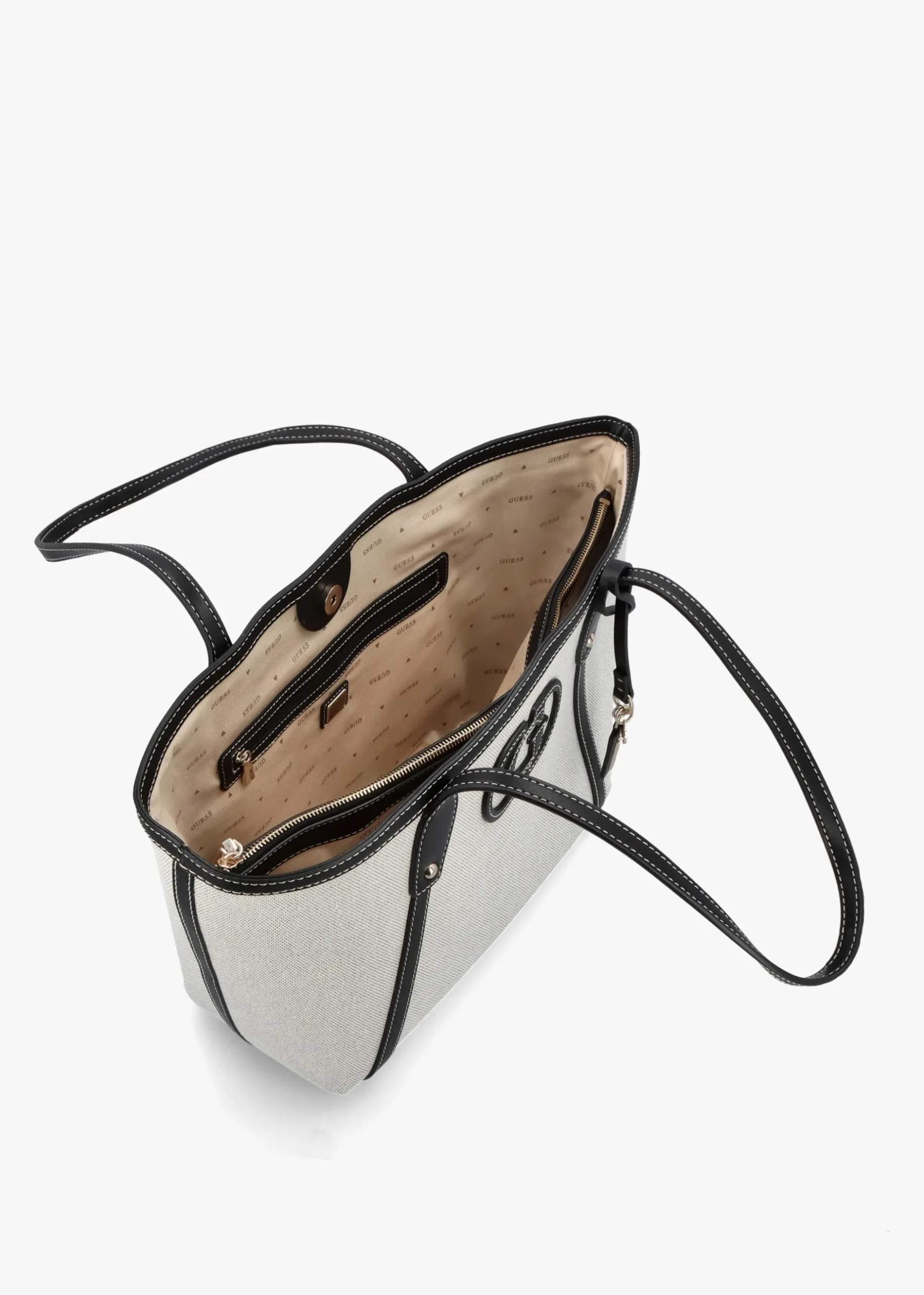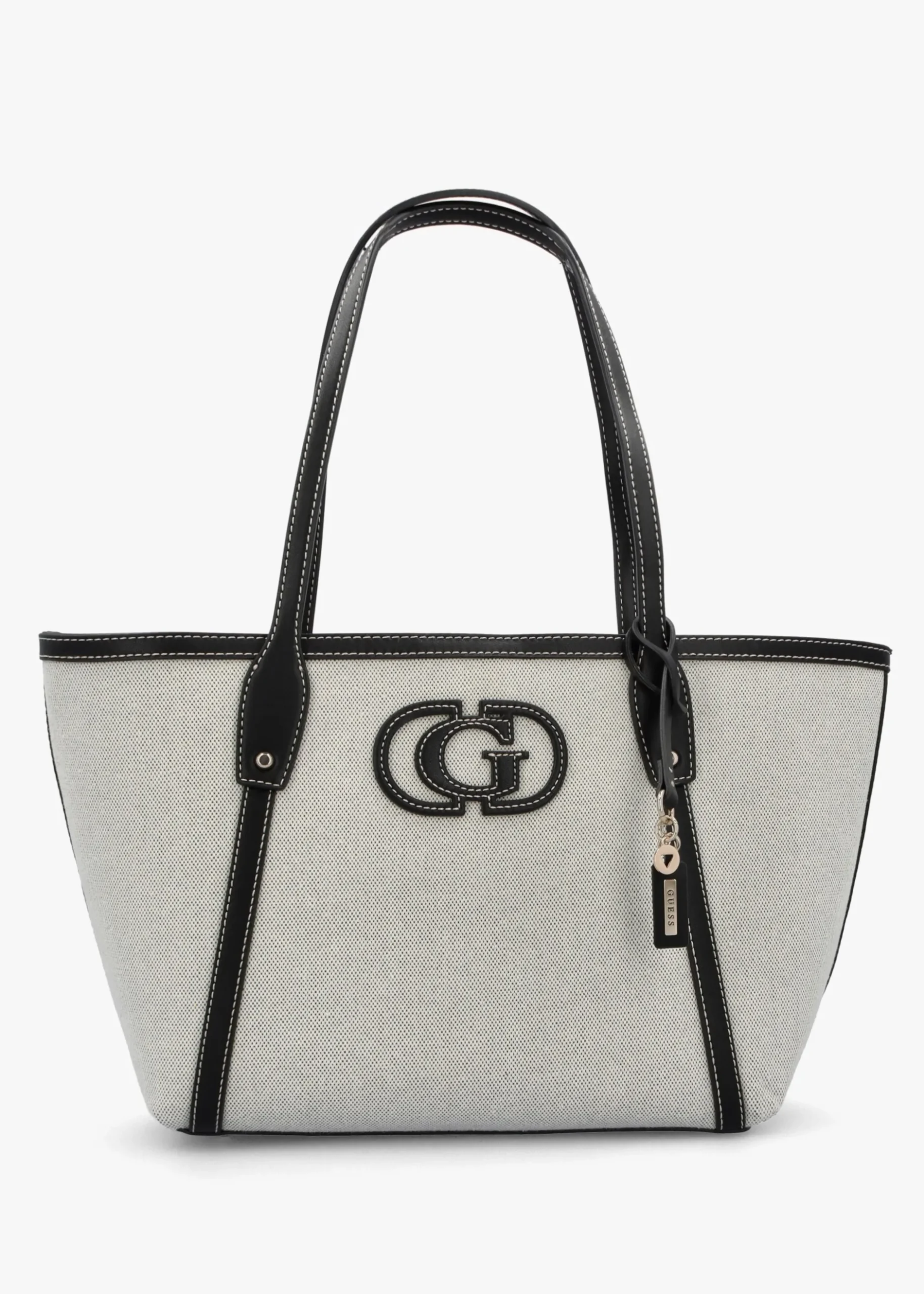The New Season ‘Sebina’ tote bag from GUESS is a versatile style. Crafted from premium textile and PU with polished gold tone accents. The secure magnetic snap fastening reveals logo lining and triple compartments as well as handy inner zip and slot pockets, exterior slot pocket also features. Carry by the top handles on the shoulder or by hand. Logo luggage tag adds detail as well as iconic ‘G’ logo to the front of the bag. Signature GUESS branding is seen throughout.