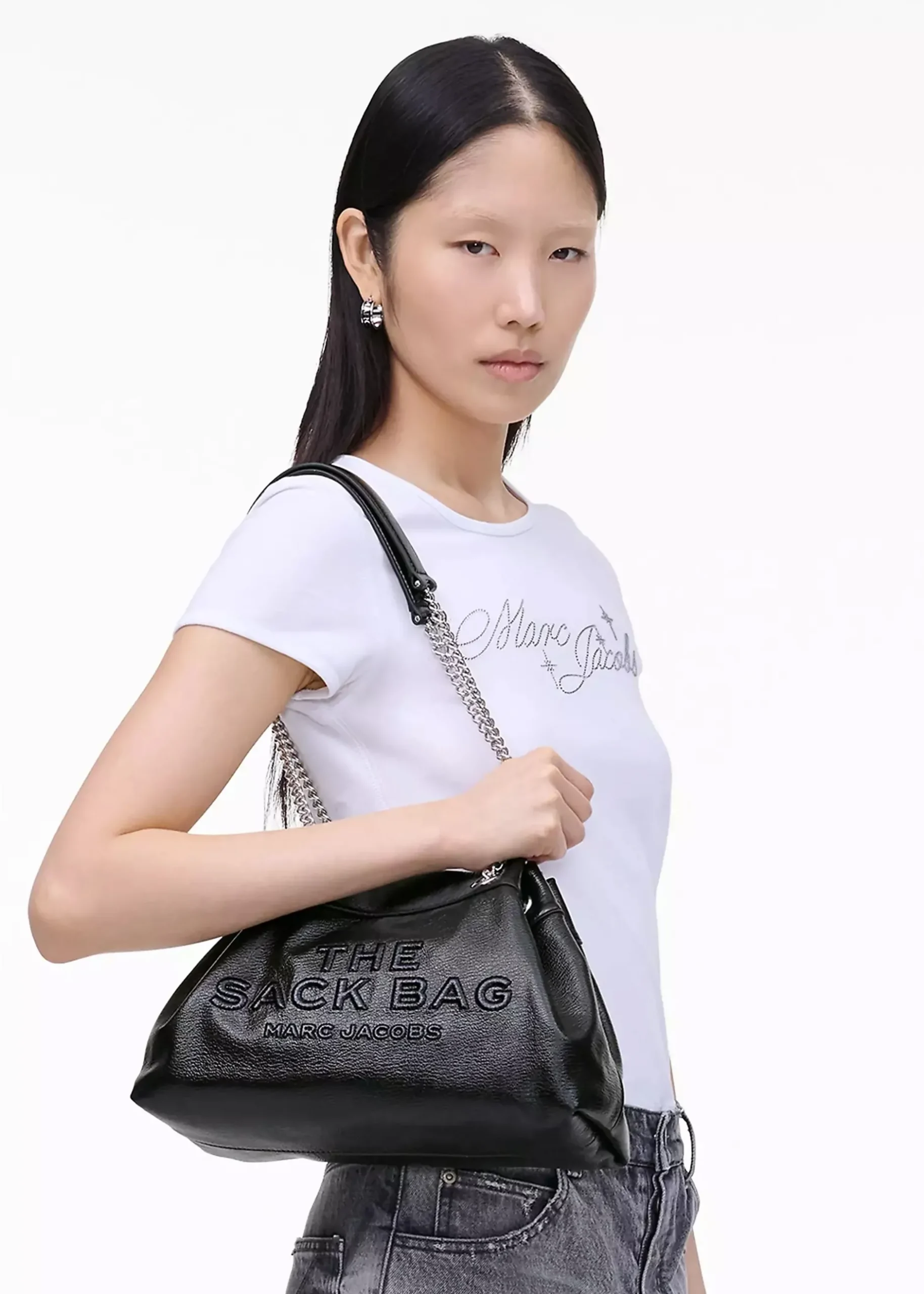 A reinvented silhouette of the iconic Marc Jacobs small ‘Sack Bag’. Crafted from premium patent leather with faille lining and polished silver tone hardware. The secure magnetic snap fastening reveals the spacious single main compartment with handy inner zip and card slot pocket. Carry by the pull through leather and chain strap on the shoulder or across the body. This New Season bag features fresh detailing to this updated must have carryall style. Signature Marc Jacobs branding is seen throughout.