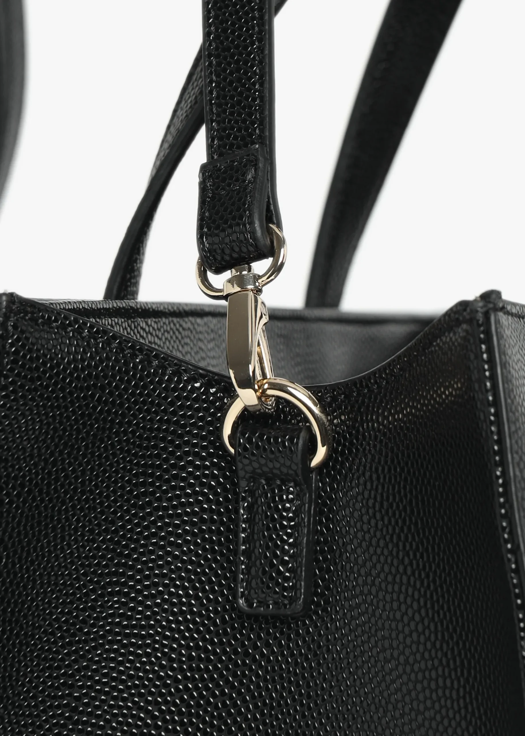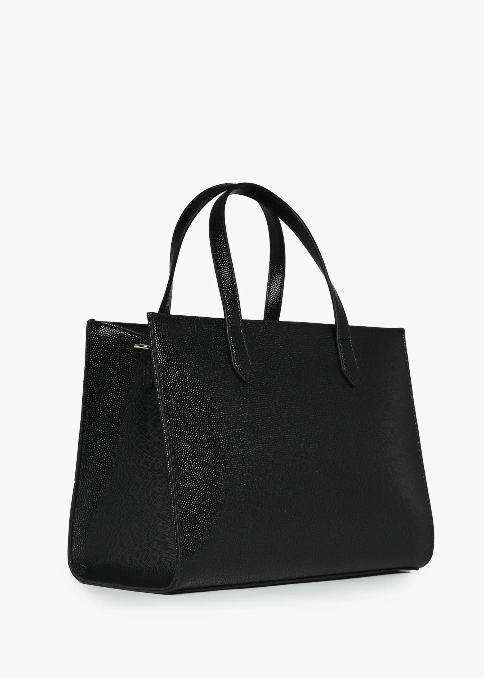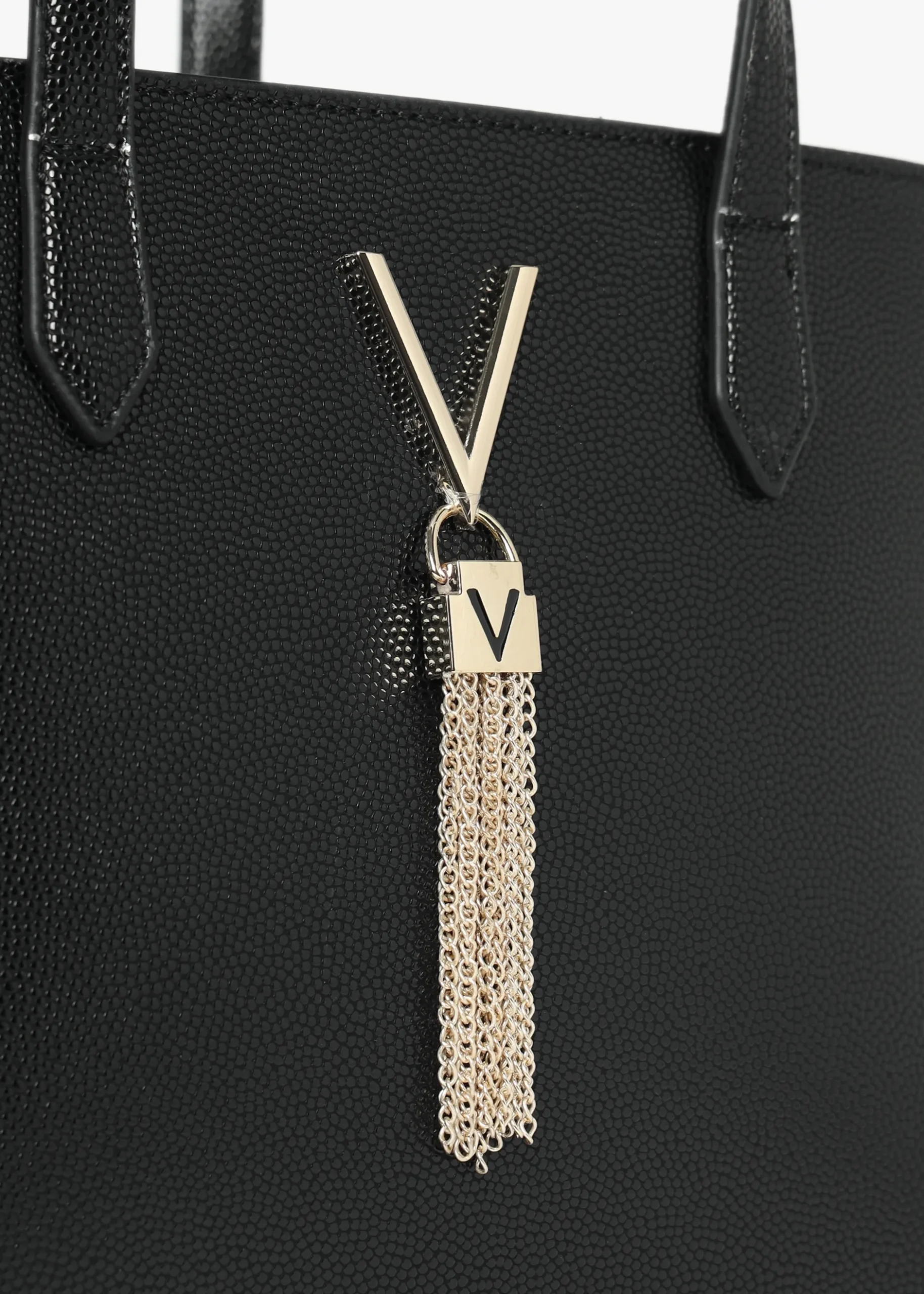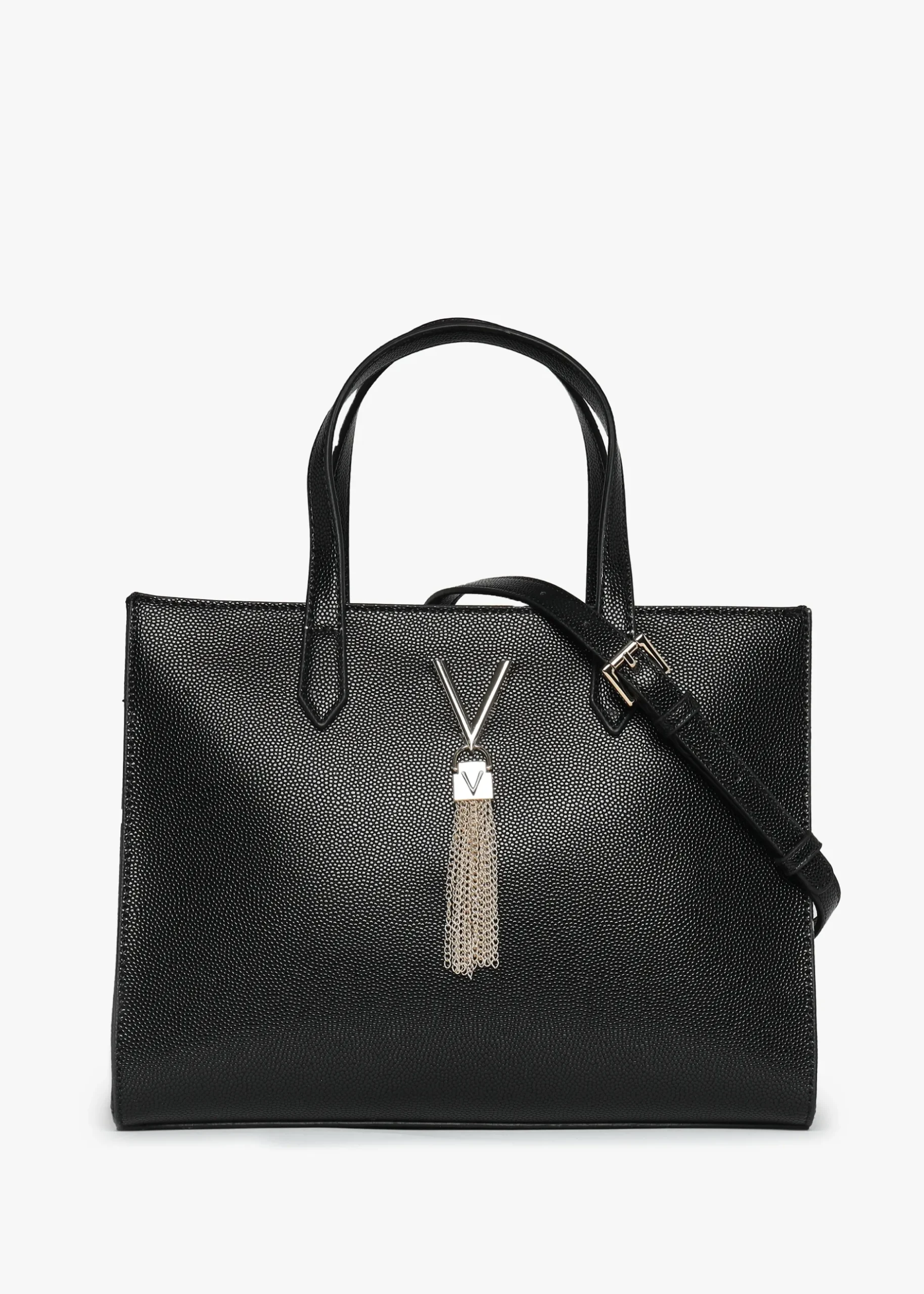 The ‘Divina’ shopper bag from Valentino is a classic style and wardrobe staple. Crafted from premium pebbled PU with polished gold tone accents. The secure top zip fastening reveals the spacious single main compartment with handy inner zip and slot pockets. Carry by the top handles or the detachable cross-body strap. Classic ‘V’ logo with tassel adds detail to the front of the bag. Signature Valentino branding is seen throughout.