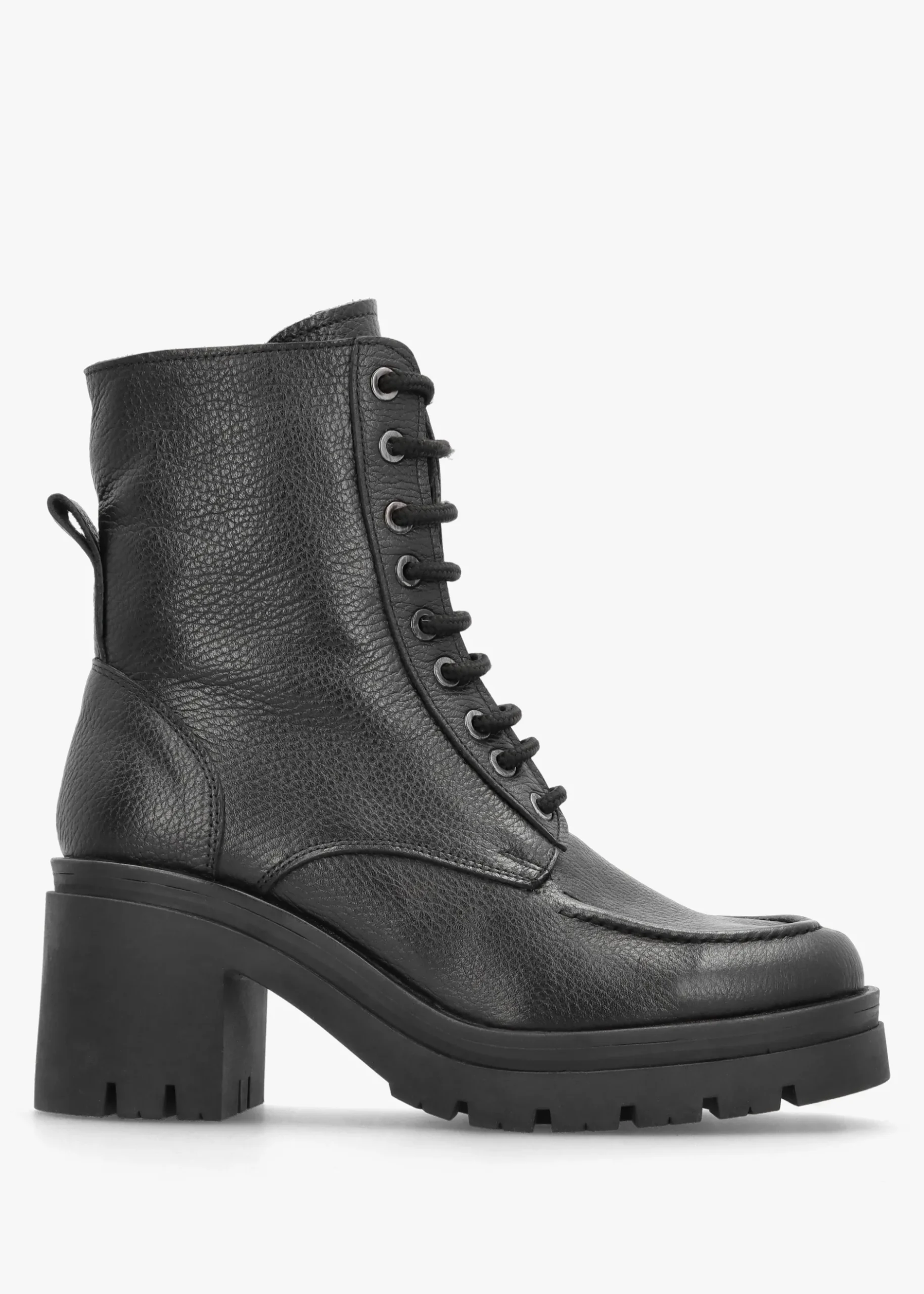 Add the chunky ‘Bella’ boots from Daniel to your boot collection. This New Season style is crafted from a premium soft pebbled leather upper with textile lining and a comfy rubber sole. Zip fastening to the inner leg creates an easy wear and the lace up upper ensures the perfect fit. Classic round toe and block heel make up the silhouette. Tonal top stitching, raised seaming and pull tab all add detail. Signature Daniel branding is seen to the footbed.
