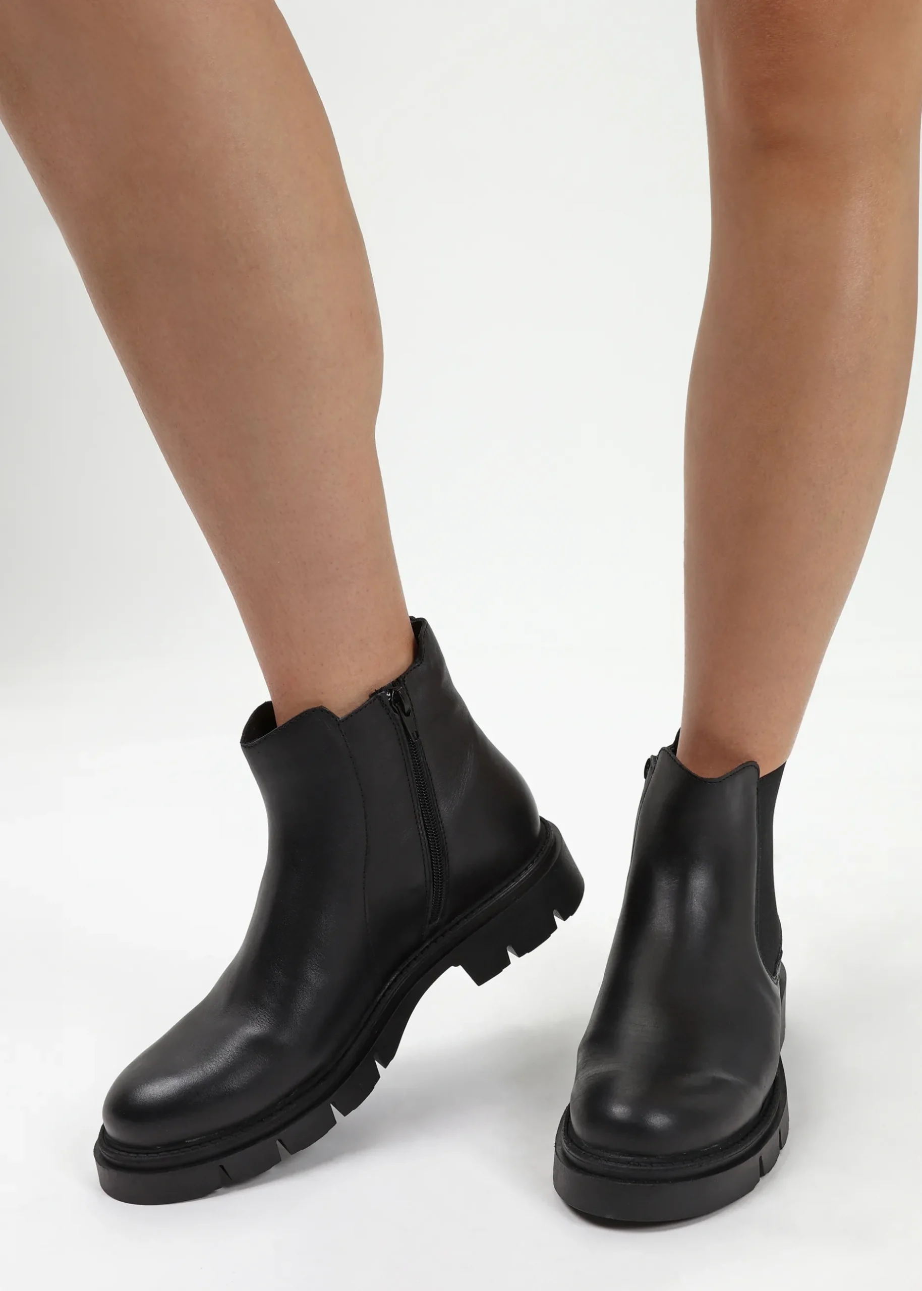 The ‘Leah’ Chelsea boots are part of the New Season collection from Daniel Footwear. This everyday style is crafted from a premium leather upper with textile lining and chunky cleated rubber sole. Zip fastening to the inner leg creates an easy wear. Classic elasticated inserts add detail. The round toe and flat heel make up the silhouette. Signature Daniel branding is seen to the foot-bed.