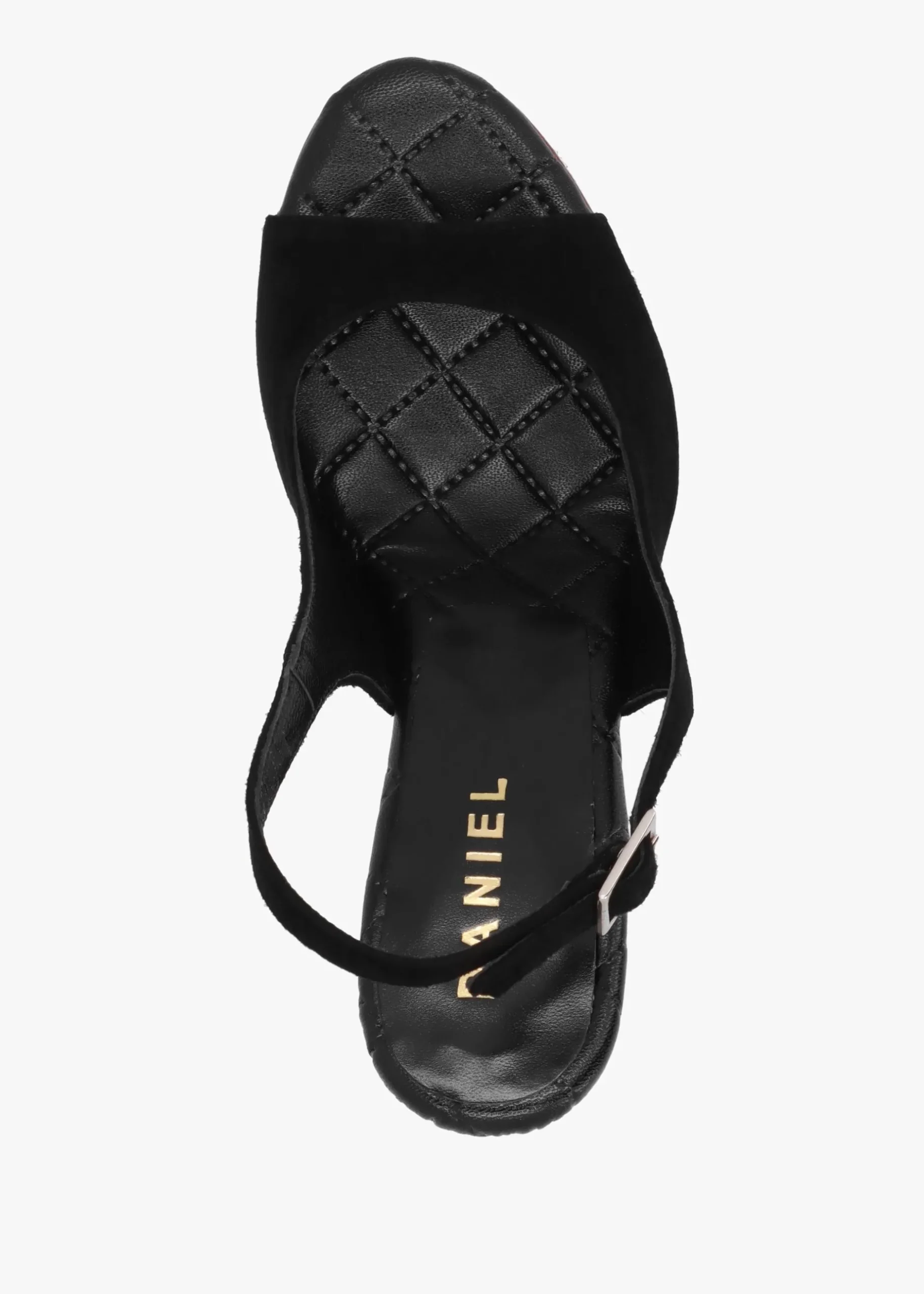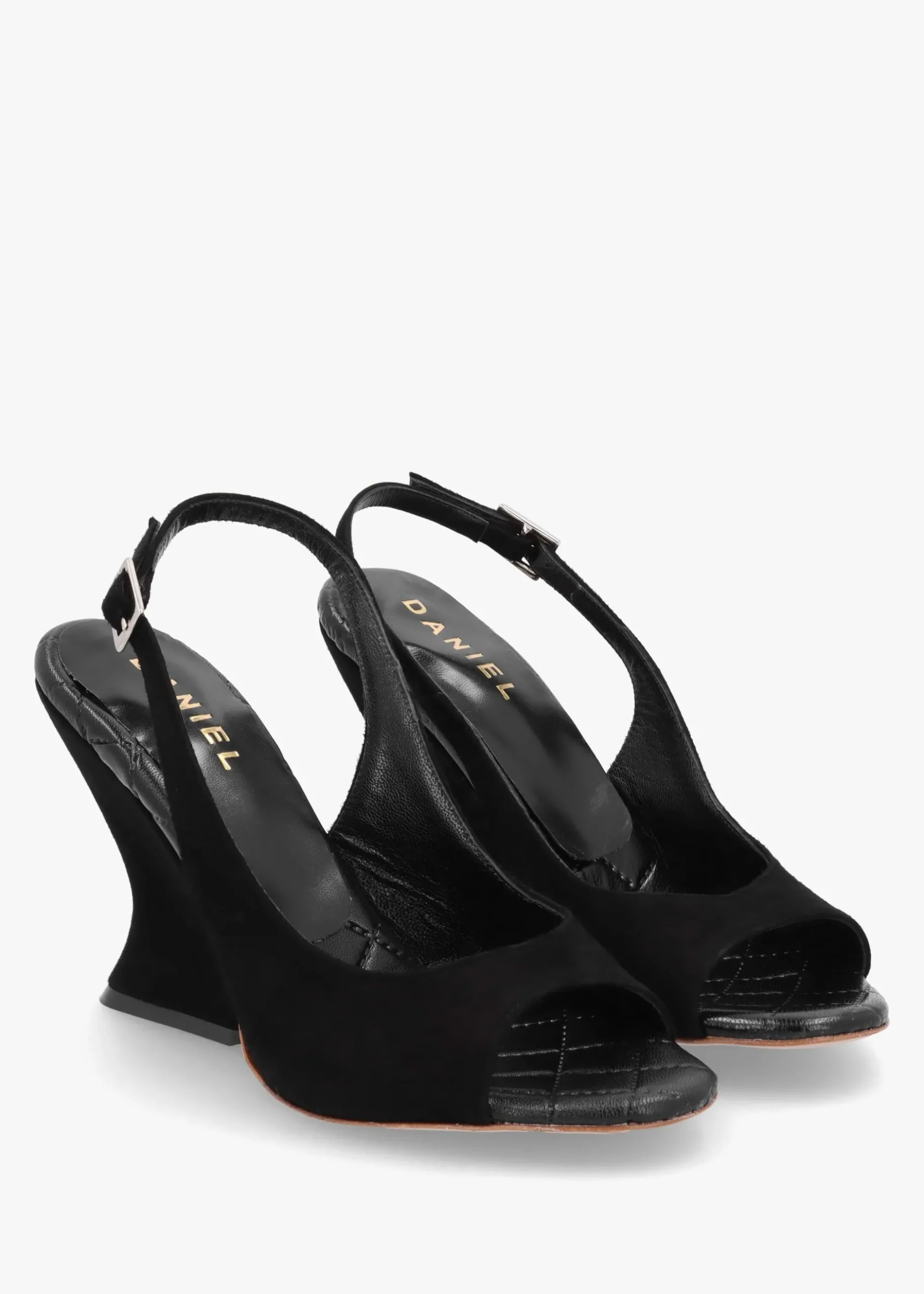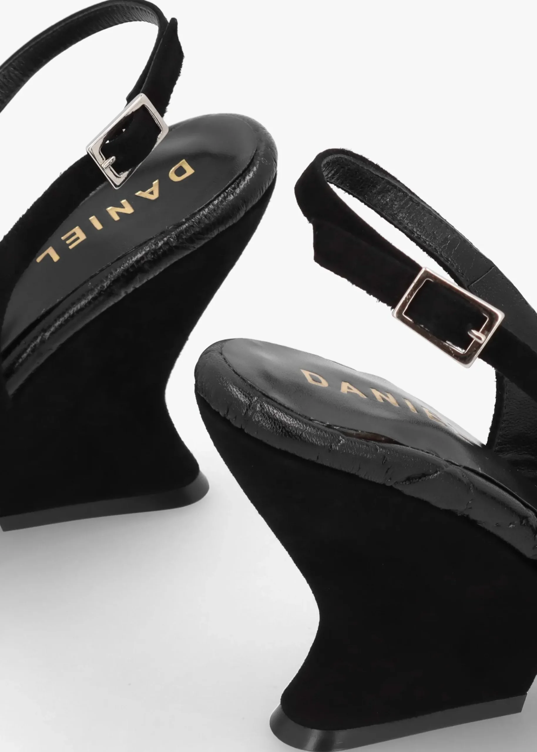 Add the ‘Margot’ wedge sandals from Daniel to your New Season wardrobe. This simple yet chic style is crafted from a premium suede upper with luxurious leather lining and sole. The padded foot-bed sock, new to the Daniel collection this Season creates added comfort. An easy to wear slip on style featuring buckle fastening sling back. The classic open toe and sculpted wedge heel make up the silhouette. Signature Daniel branding is seen to the foot-bed.