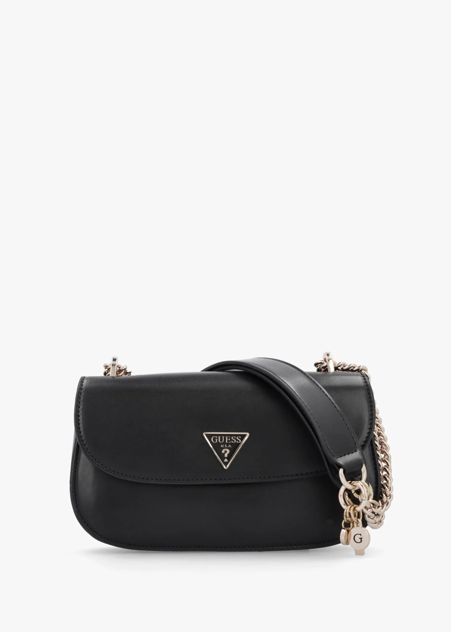 New from GUESS this Season the ‘Daryna’ cross-body day. This everyday style is crafted from premium smooth PU with polished gold tone accents. The secure magnetic snap front flap reveals the logo lined single main compartment with handy inner zip and slot pockets, exterior zipper pocket also features. Carry by the chain and PU handles on the shoulder or across the body. Detachable logo bag charm adds detail. The brand’s iconic triangle logo motif features to the front of the bag, further GUESS branding is seen throughout.