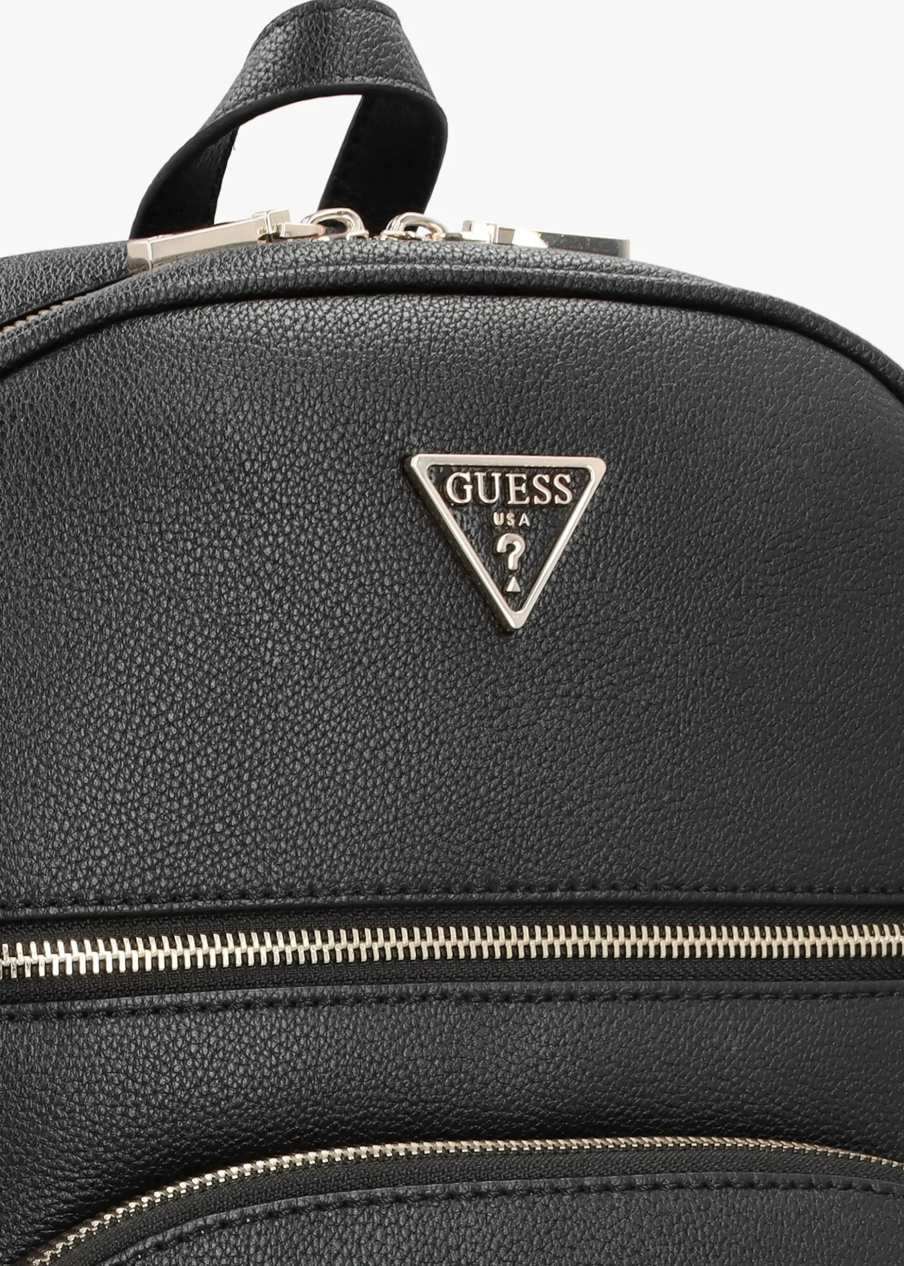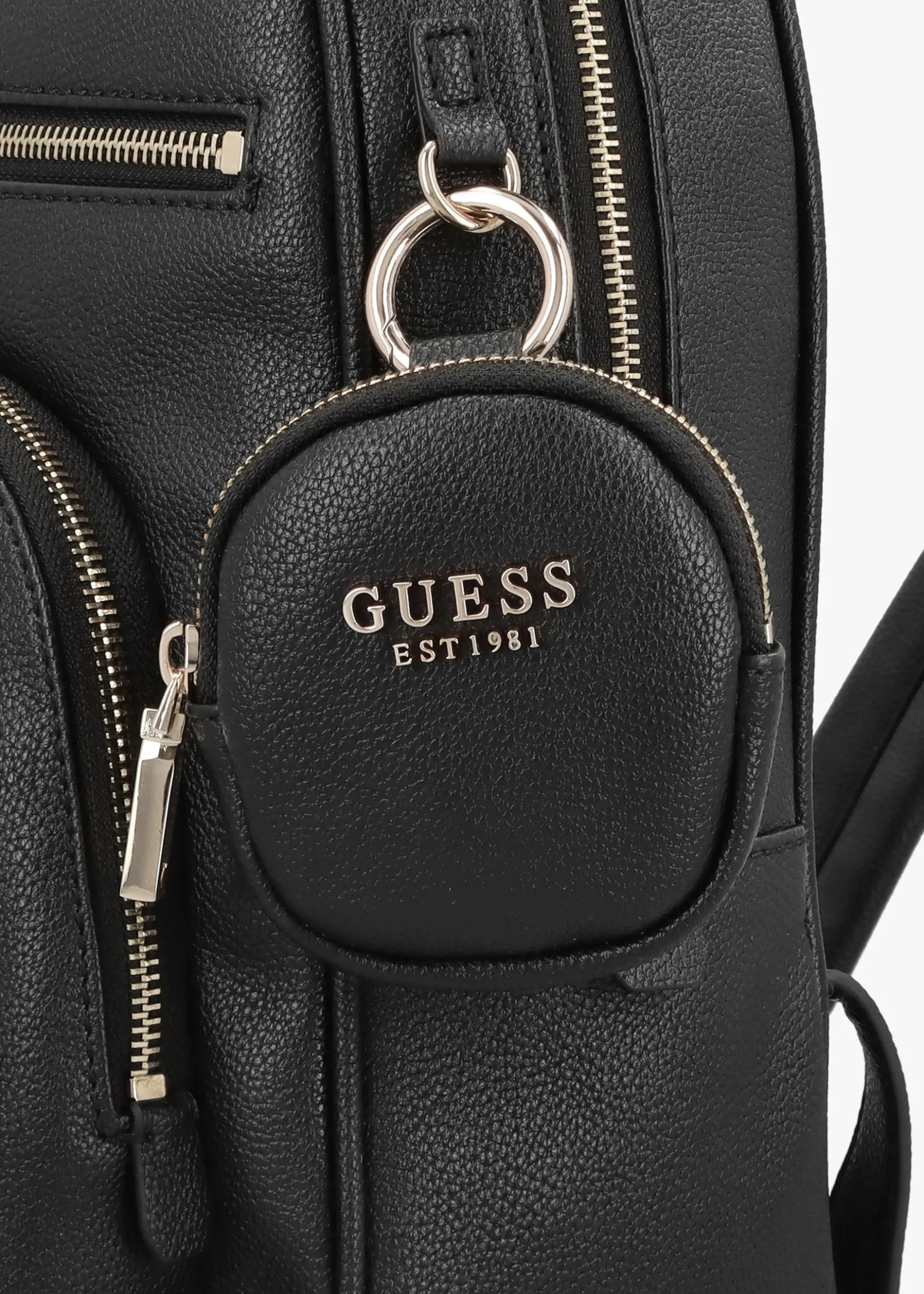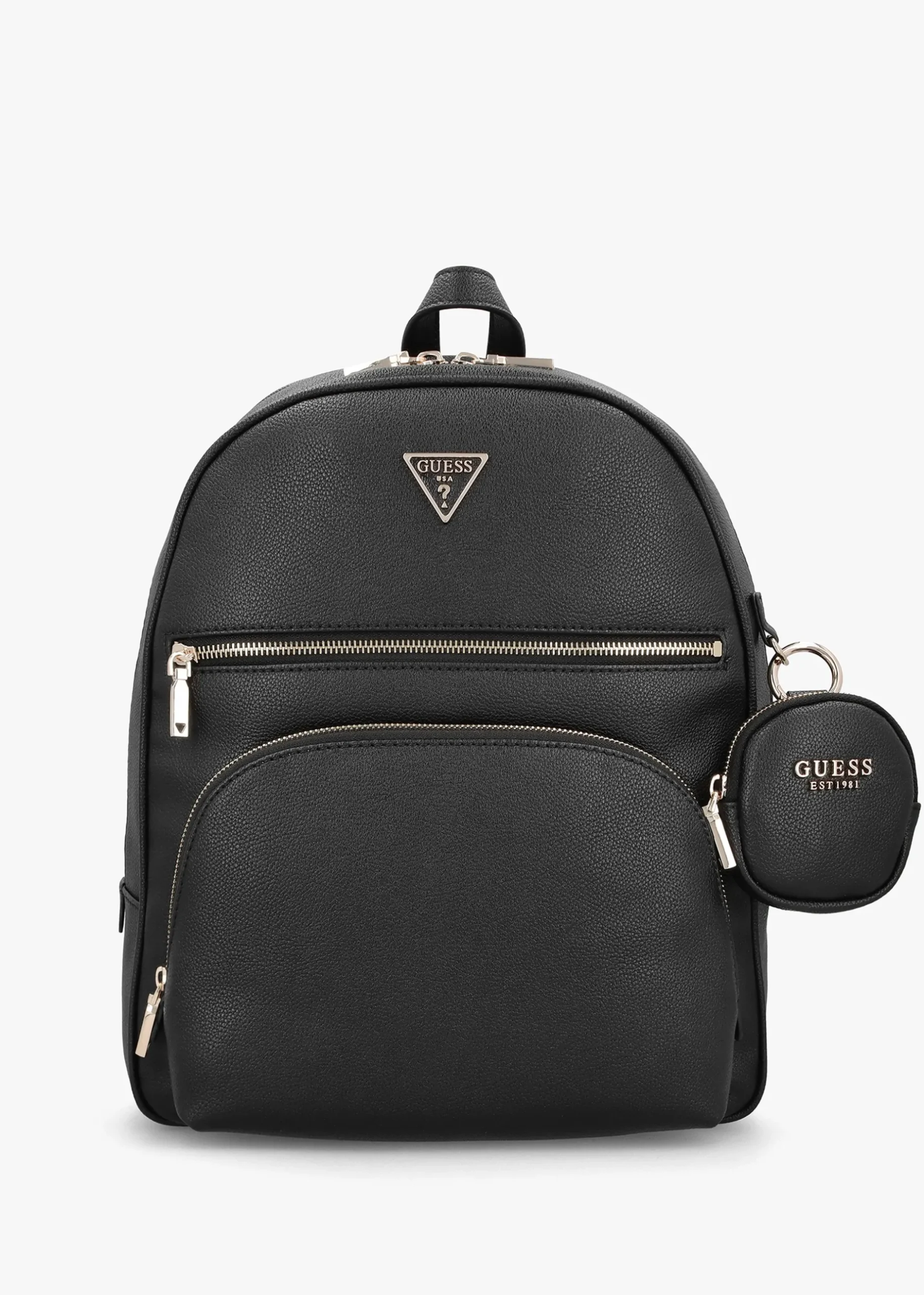 The ‘Power Play Tech’ backpack is part of the New Season collection from GUESS. This updated hands-free carryall style is crafted from premium pebbled PU with gold tone accents. The secure zip around fastening reveals logo lining and handy inner pockets, featuring a new configuration for the Season. Exterior front zip pockets also feature. Carry by the top handle or the adjustable straps. Classic triangle logo motif adds detail as well as detachable coin purse. Signature GUESS branding is seen throughout.