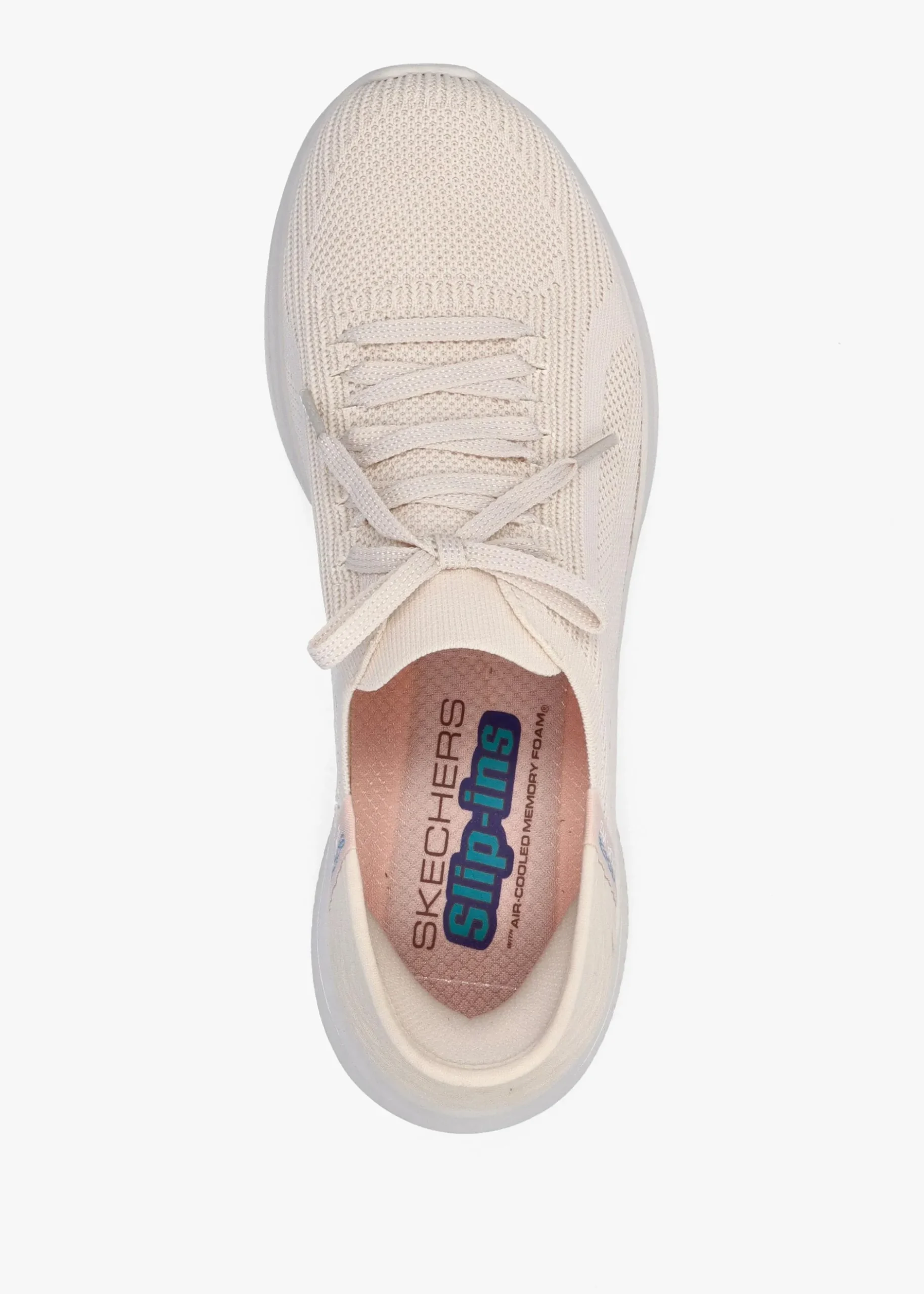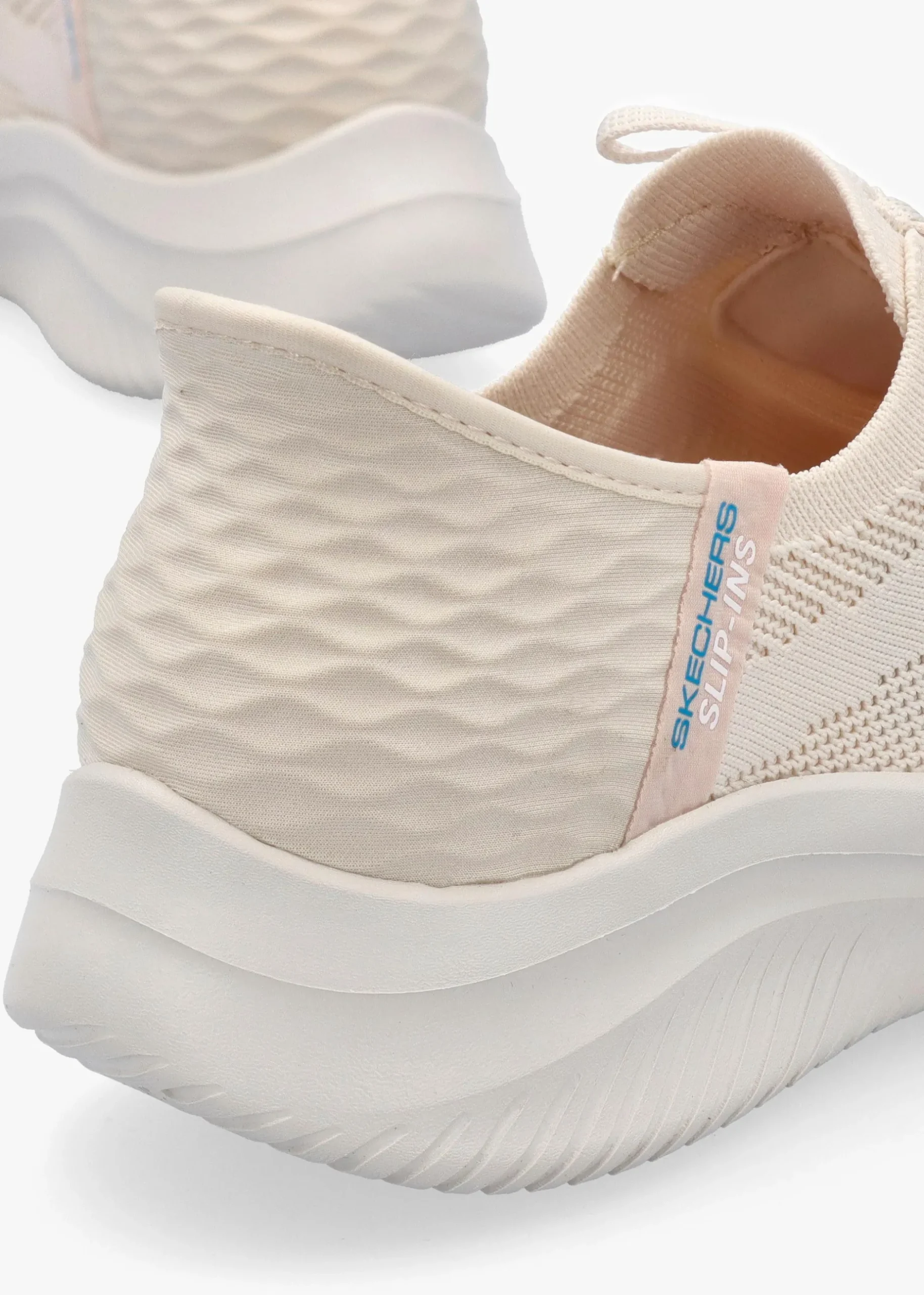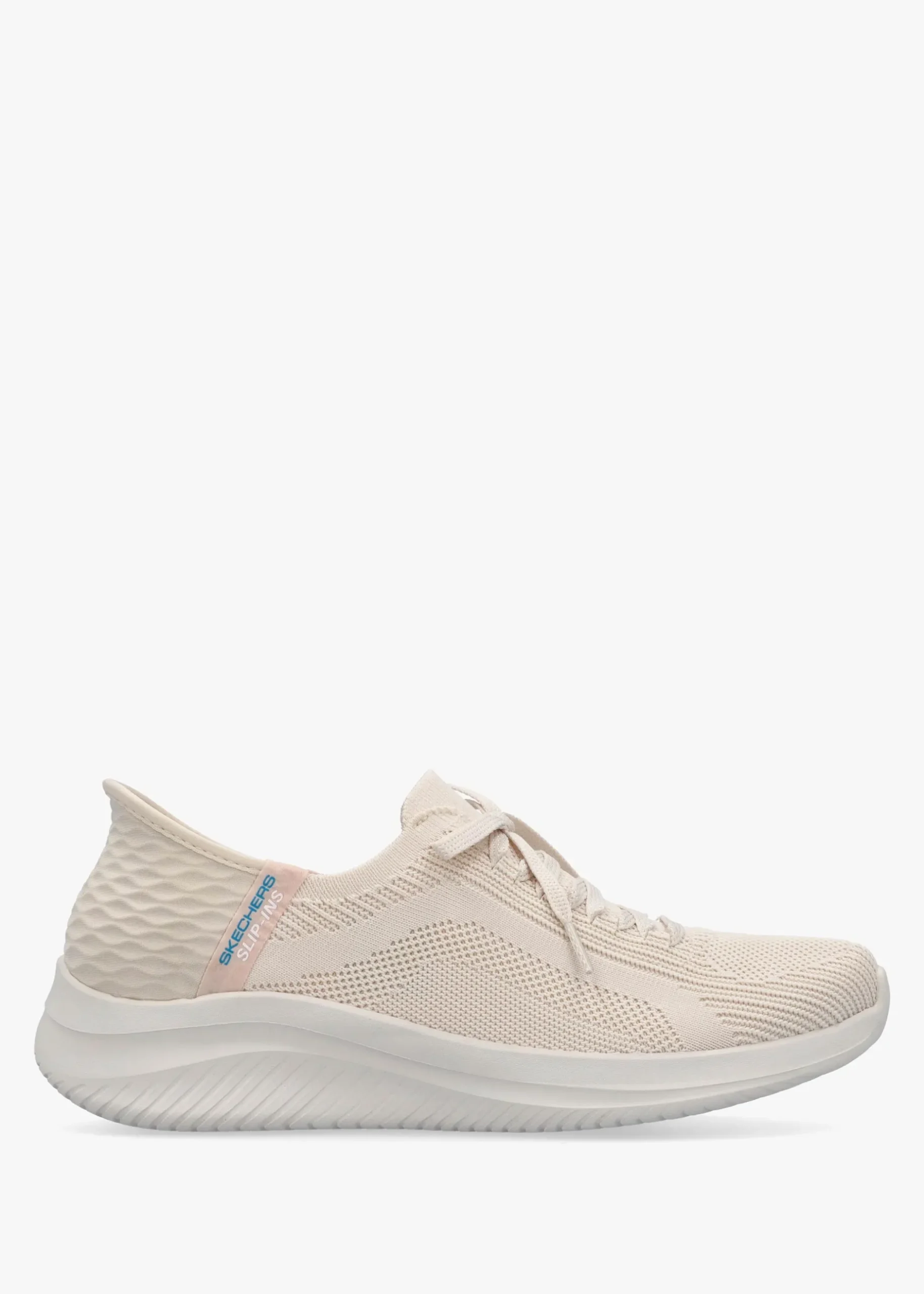 Add the women’s ‘Slip Ins Ultra Flex 3.0’ trainers from Skechers® to your off-duty wardrobe. This vegan style is crafted from a Stretch Fit® engineered knitted upper with Skechers® exclusive heel pillow™ and Skechers® air-cooled memory foam® insole. The detective laces add detail. Signature Skechers® branding is seen throughout.