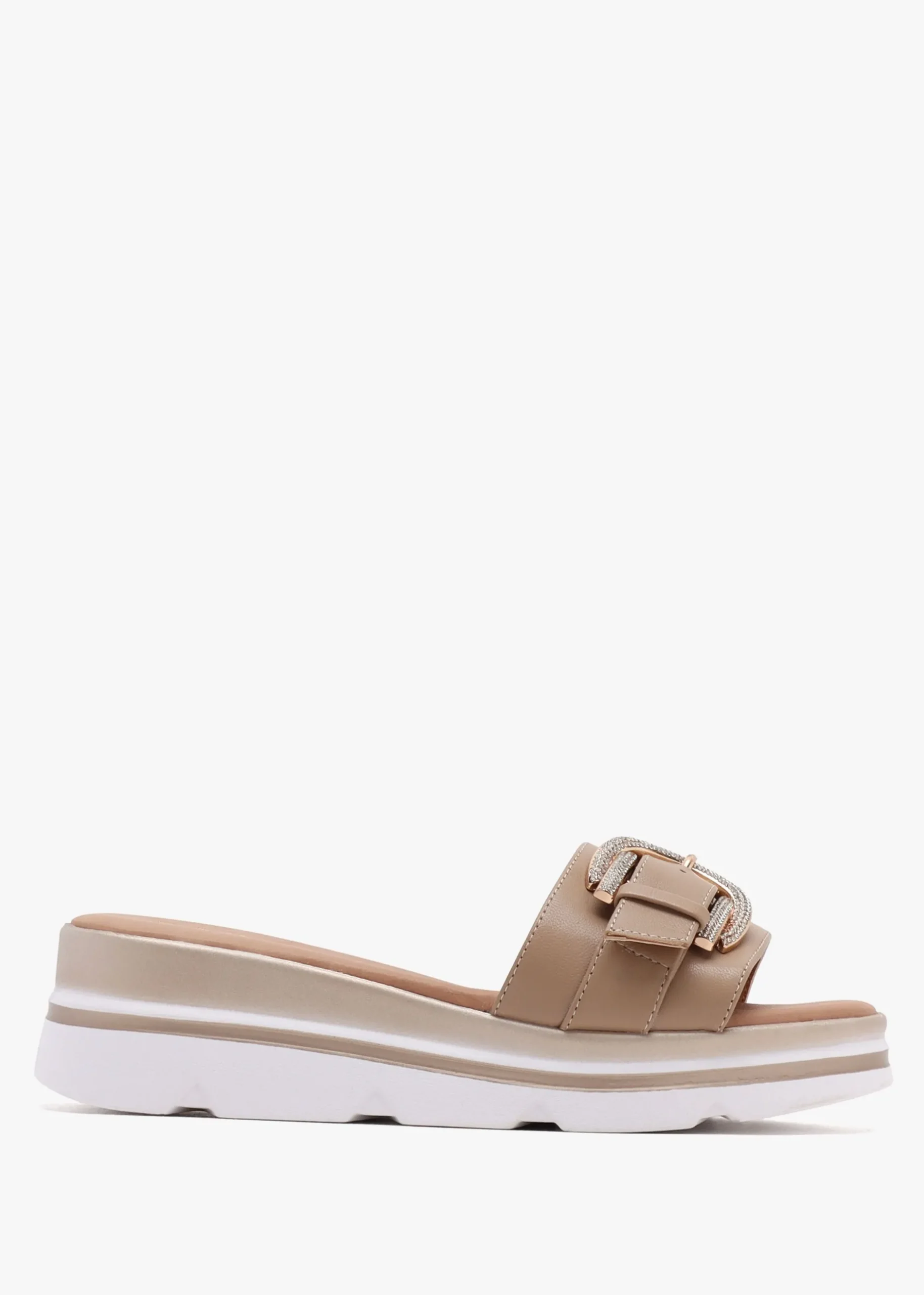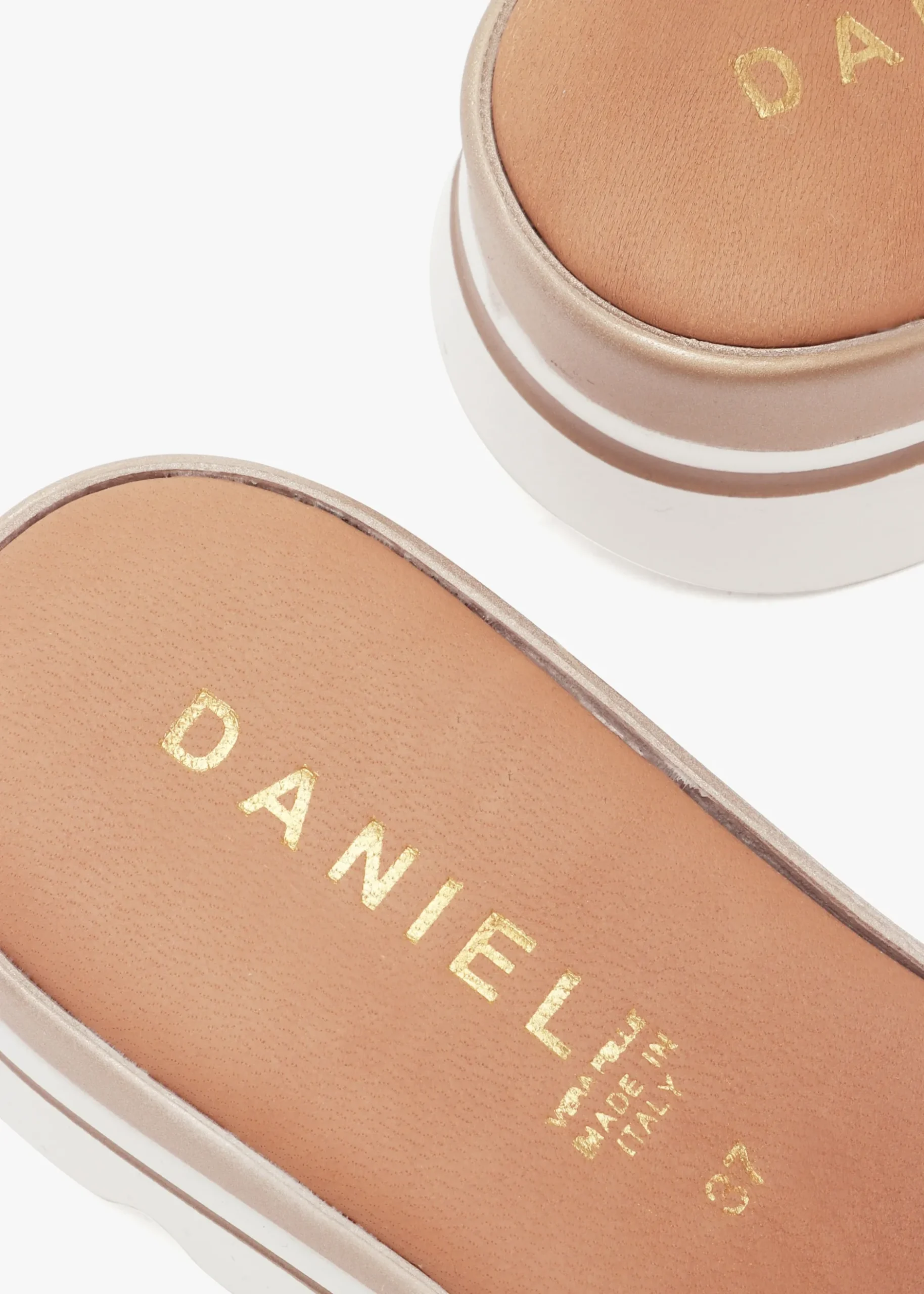 The ‘Recrys’ mules are part of the New Season collection from Daniel Footwear. This Summer style is crafted from a premium leather upper with part leather lining and a chunky rubber sole. An easy to wear slip on style featuring open toe. Statement diamante embellished buckle adds detail to the upper. Signature Daniel branding is seen to the foot-bed.