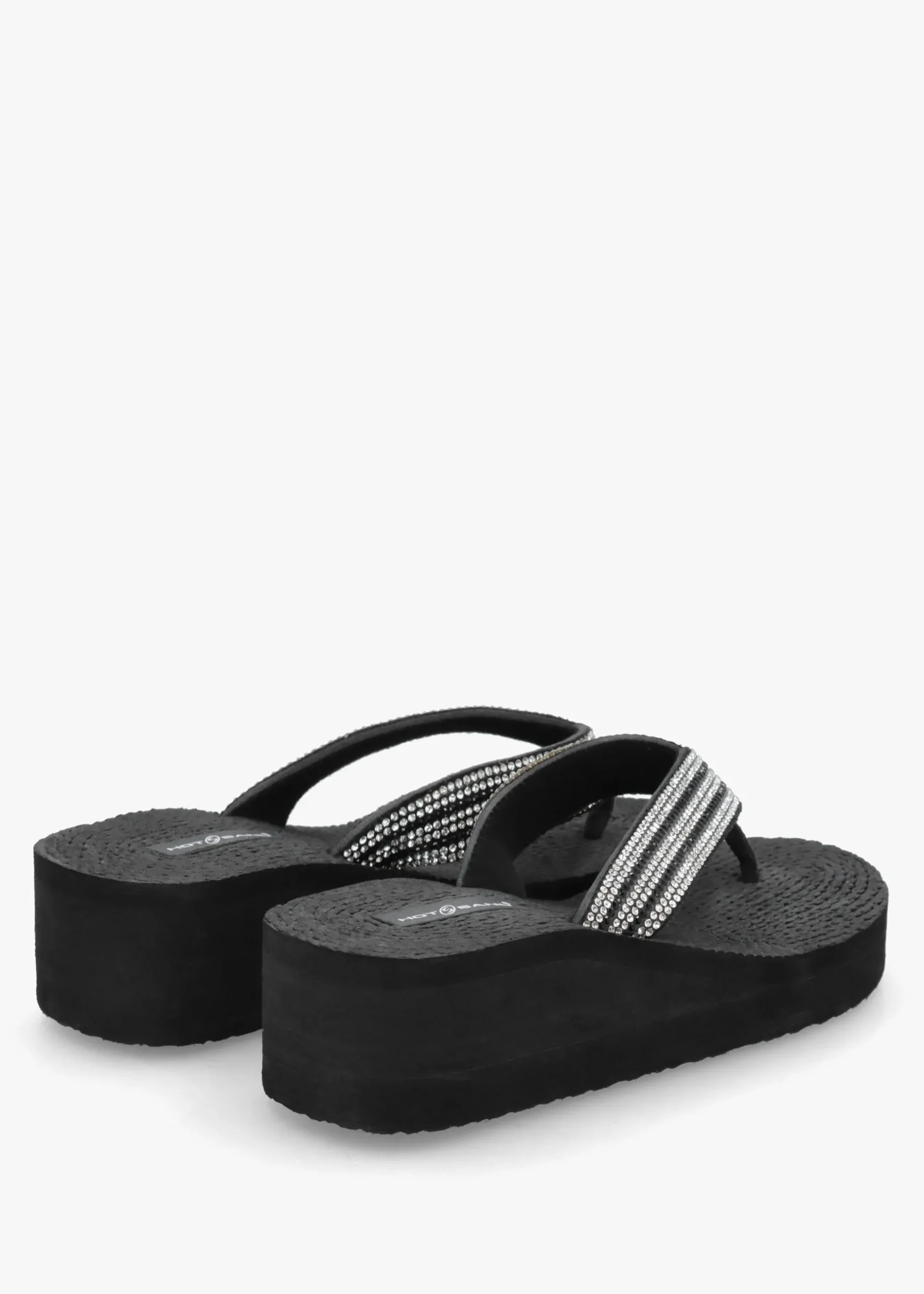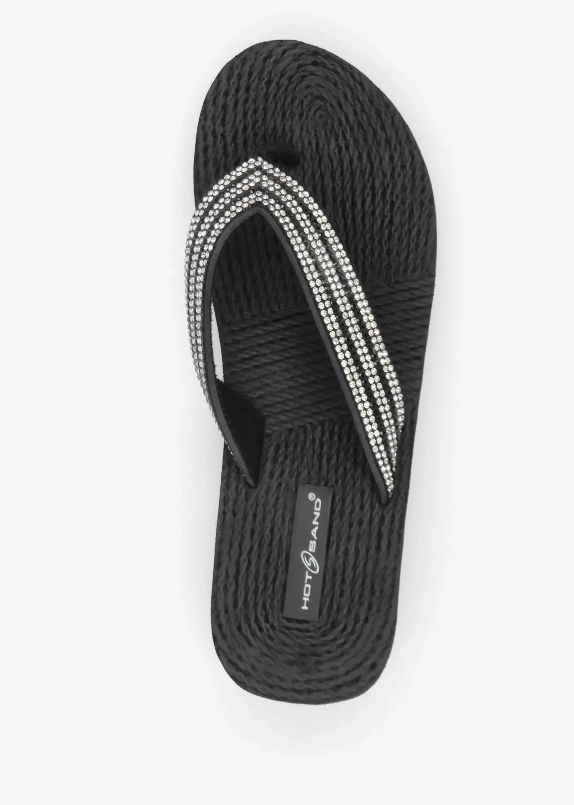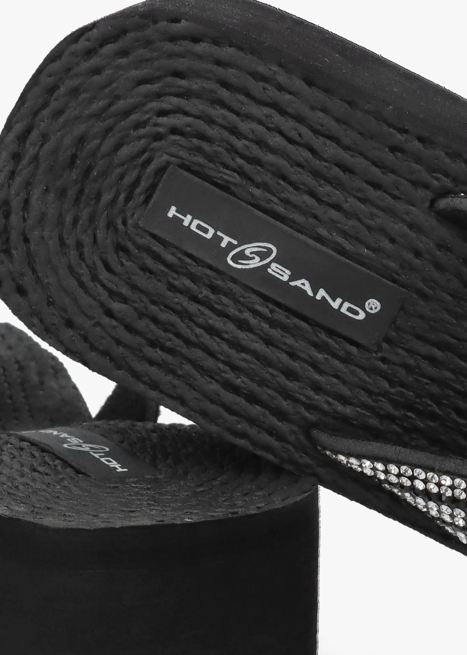 Add these chunky wedge flip flops with a twist to your Summer wardrobe, perfect for off-duty and beach days. An easy to wear slip on style featuring thong toe post. Statement jewel embellishment adds detail to the straps. Signature Hot Sand branding is seen to the footbed.