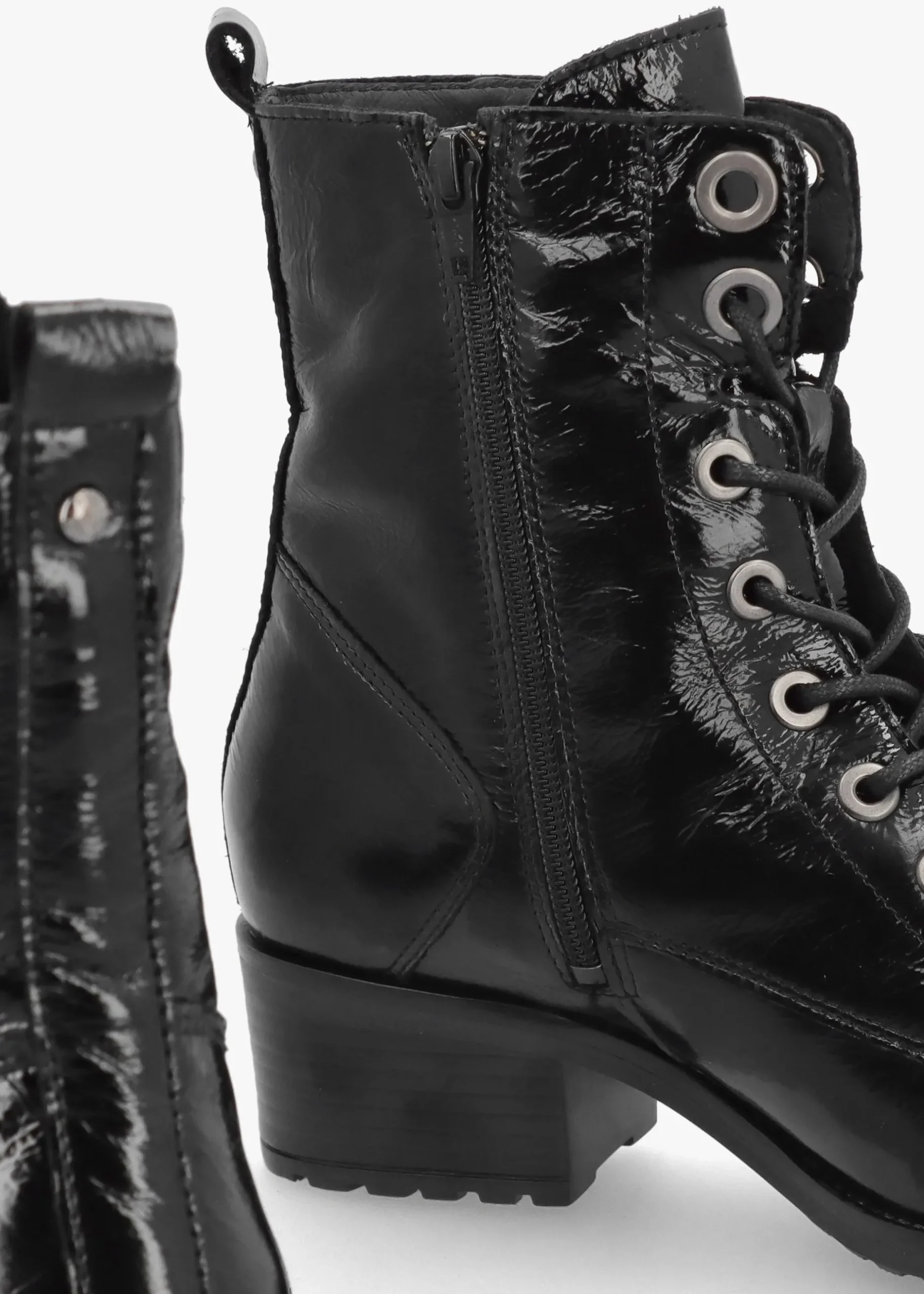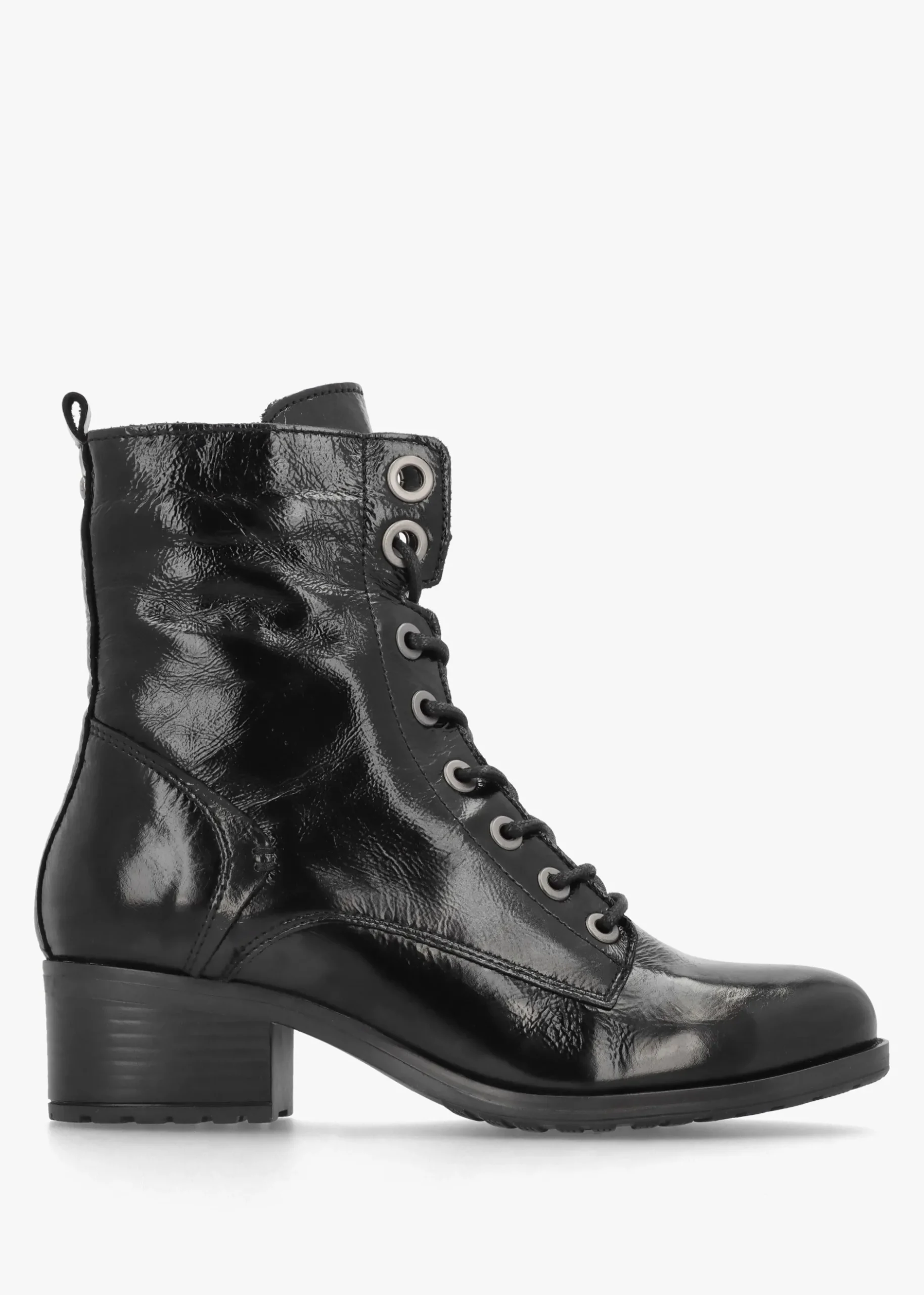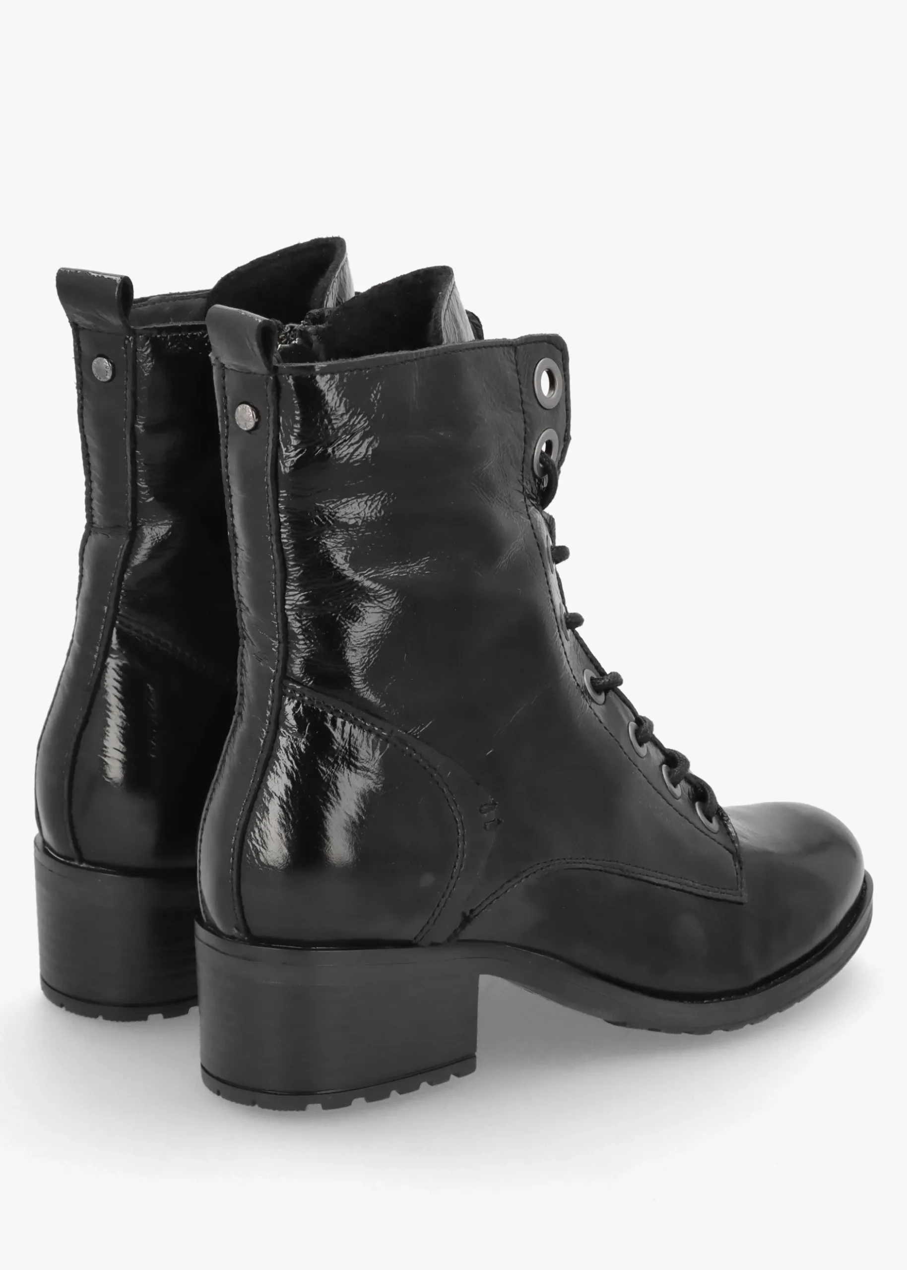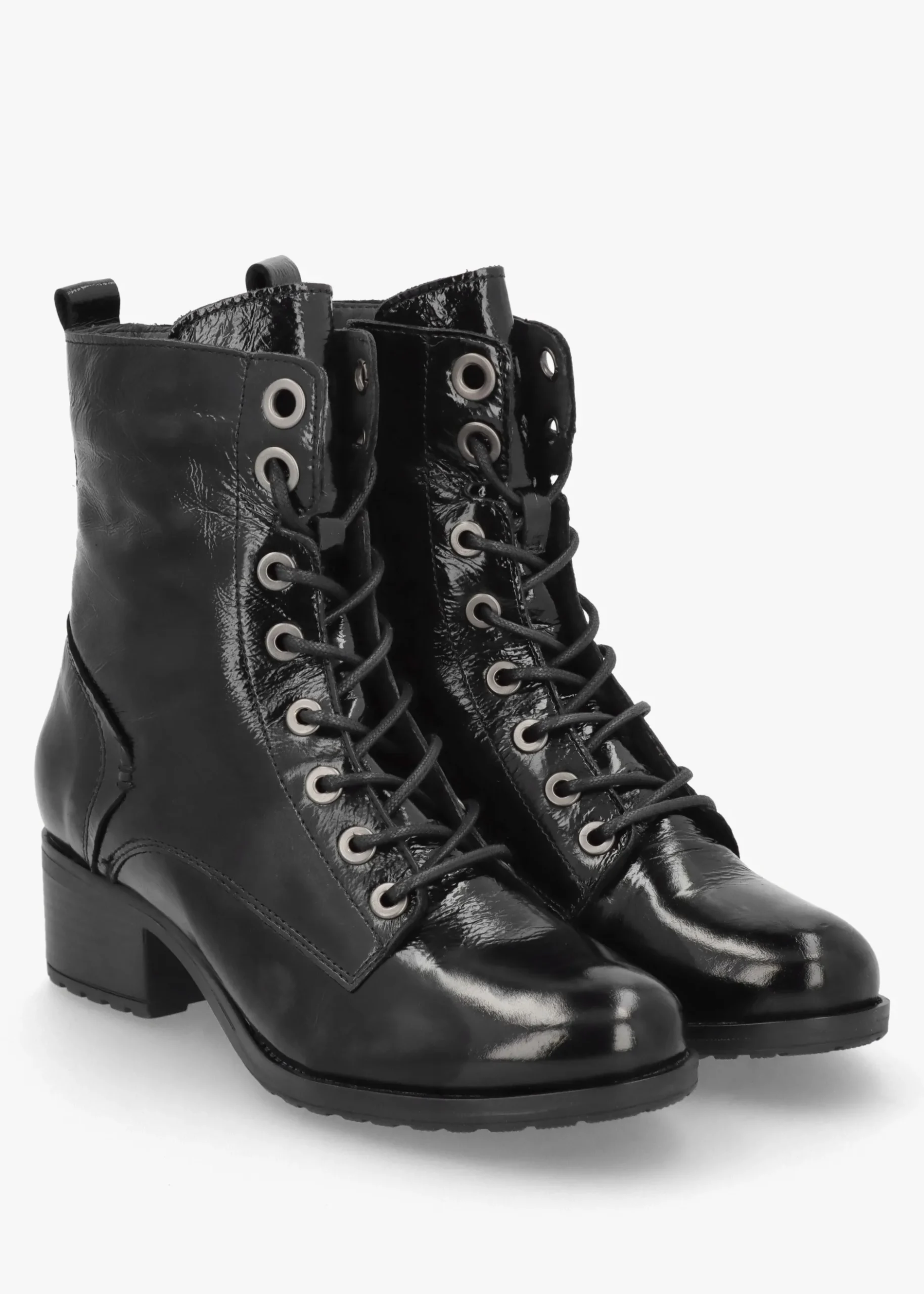 The ‘Bezzie’ ankle boots are part of the New Season from Moda In Pelle. This everyday style is crafted from a premium patent leather upper with part leather lining and a rubber sole. The inner side zip fastening creates an easy wear and the lace up upper ensures the perfect fit. Tonal top stitching and raised seaming add detail to the upper. The classic round toe and low block heel. Signature Moda In Pelle branding is seen to the foot-bed.
